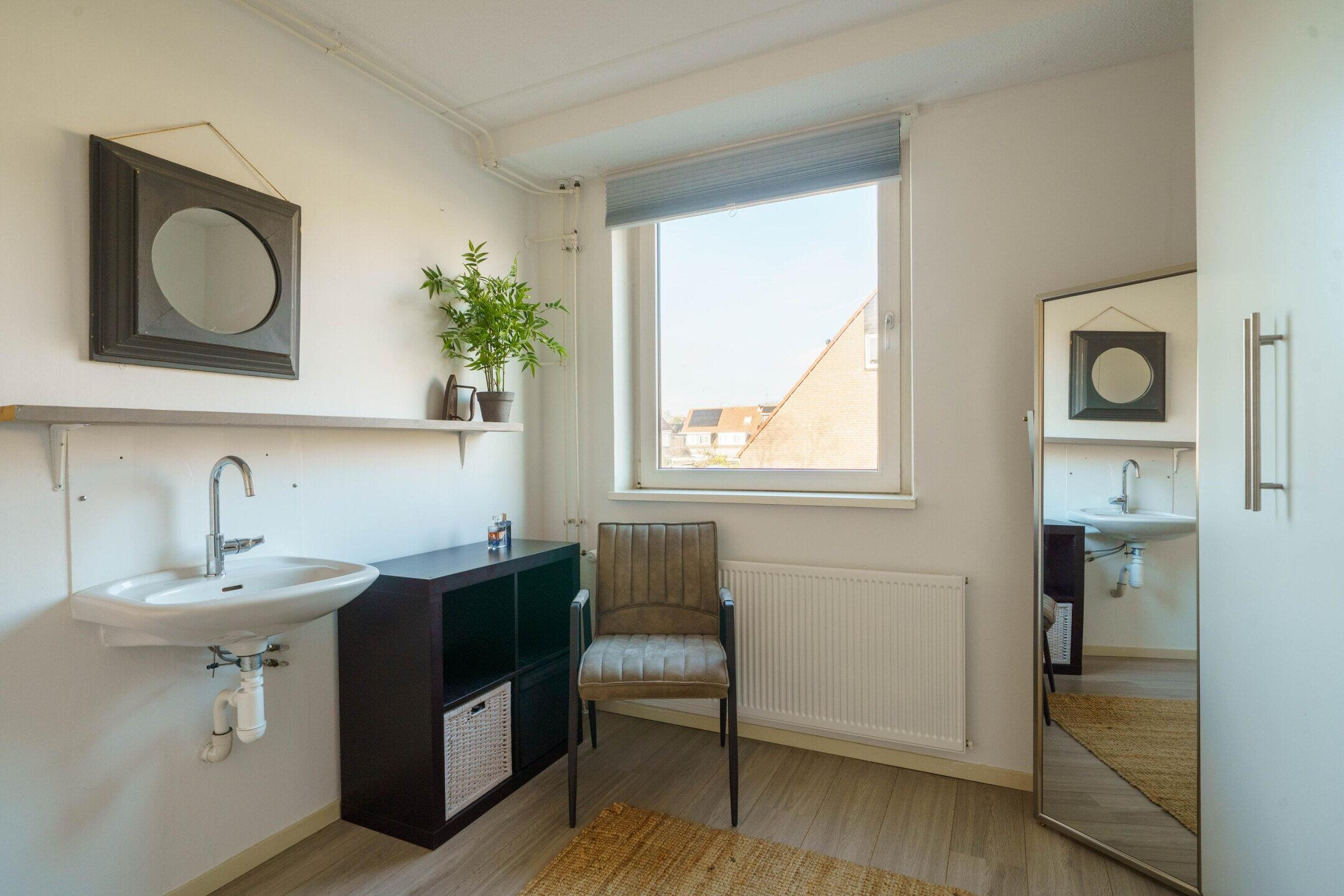 Ruime overloop met toegang tot drie slaapkamers waarvan de slaapkamer aan de voorzijde beschikt over een wastafel. De badkamer is uitgerust met douchehoek, ligbad, wastafelmeubel, 2e toilet en een raam aan de voorzijde.