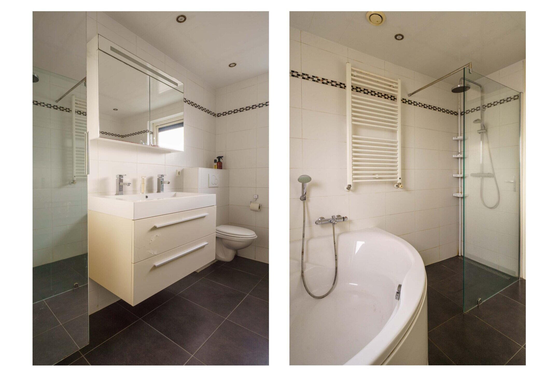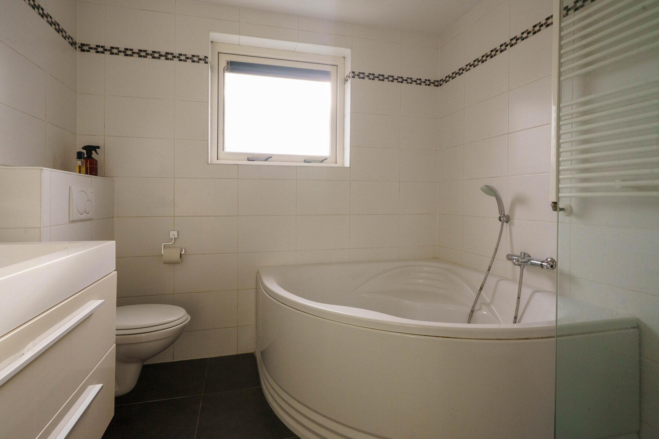 De moderne badkamer is uitgevoerd in een lichte, tijdloze stijl en beschikt over een hoek-ligbad, inloopdouche, zwevend tweede toilet en een wastafelmeubel met dubbele wastafel. Ook is er een raam aanwezig voor natuurlijk licht en ventilatie.