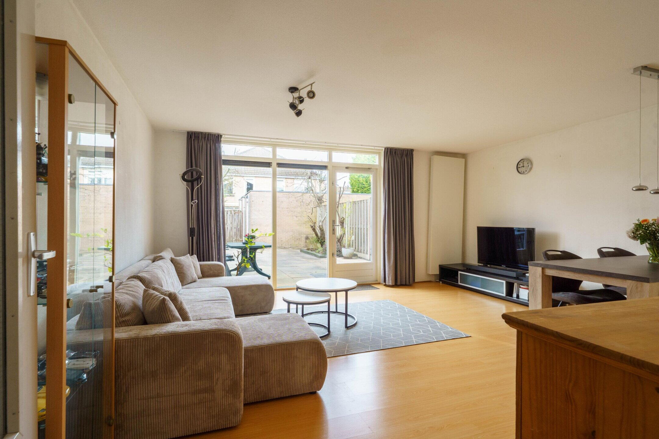 De tuingerichte woonkamer is heerlijk licht door de twee hoge ramen en de deur naar de achtertuin. De vloer is voorzien van laminaat en de wanden zijn strak afgewerkt, wat een moderne en warme uitstraling geeft.