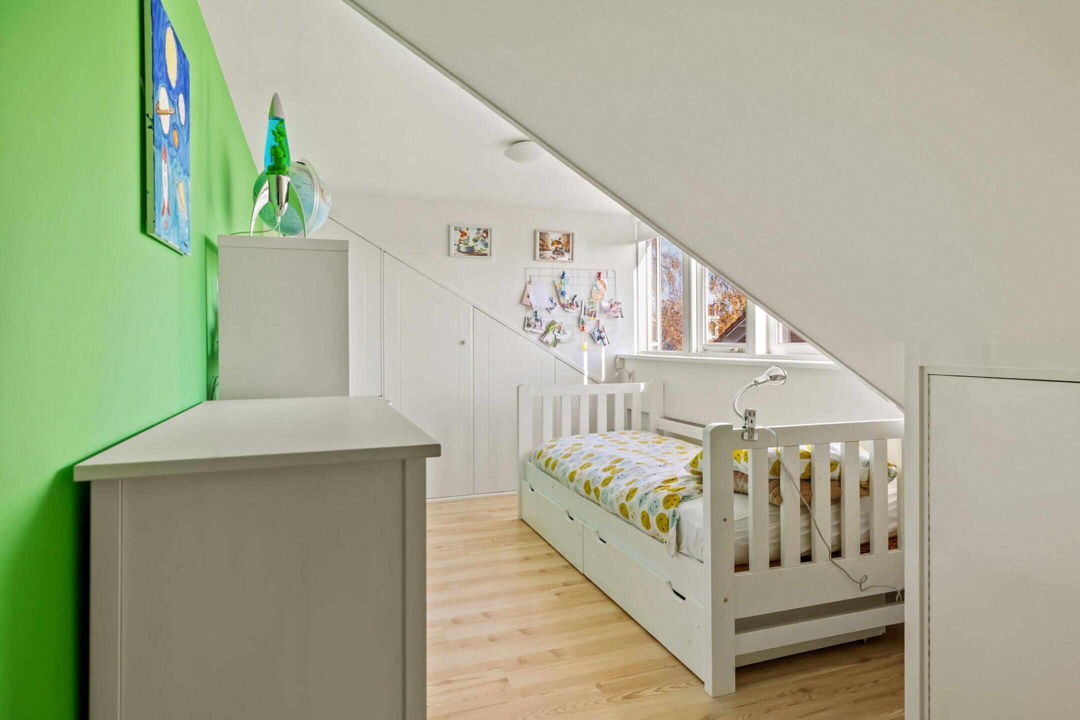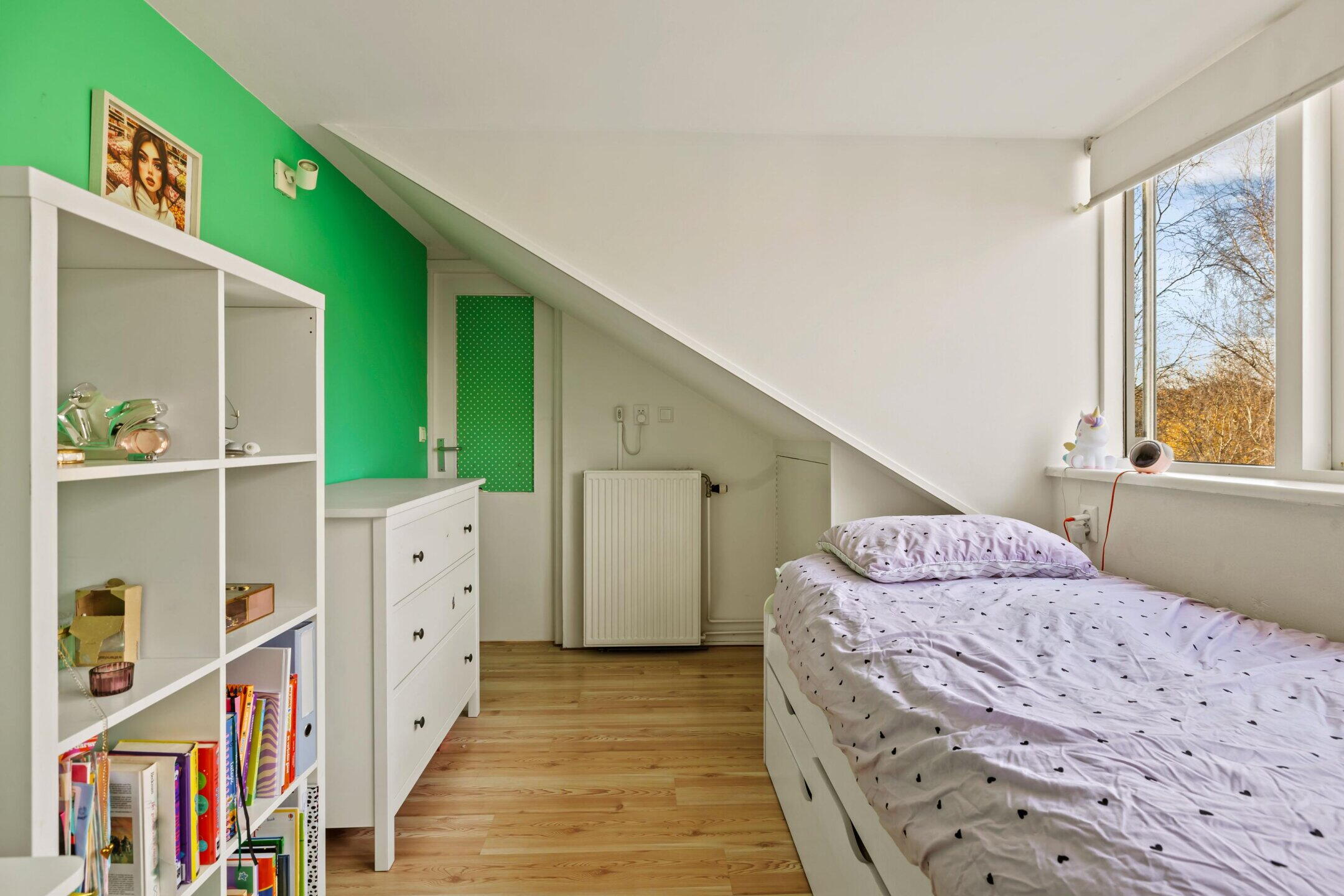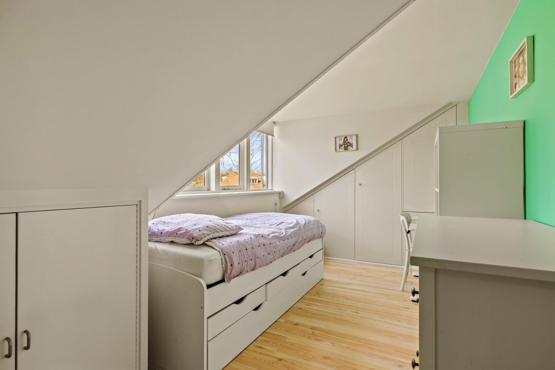 The second floor is reached by a fixed staircase and has two spacious bedrooms, both with dormer windows on either side. Additionally, you will find a practical, separate laundry room and a second bathroom with a shower, toilet, and sink here. All rooms on this floor are fitted with generous, built-in cupboard space.