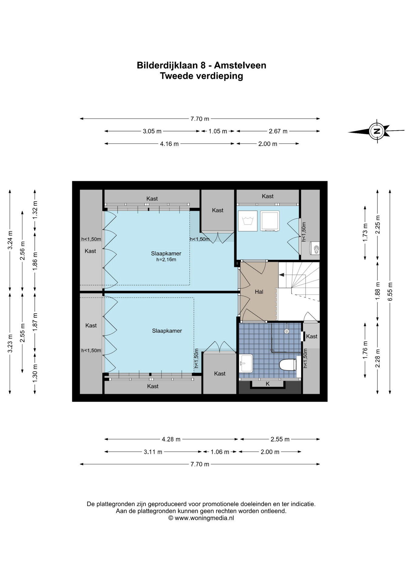 De tweede verdieping is met een vaste trap bereikbaar en telt twee ruime slaapkamers, beide voorzien van dakkapellen aan weerszijden. Daarnaast vindt u hier een praktische, aparte wasruimte en een tweede badkamer met douche, toilet en wastafel. Alle kamers op deze verdieping zijn voorzien van ruime, inpandige kastruimte.