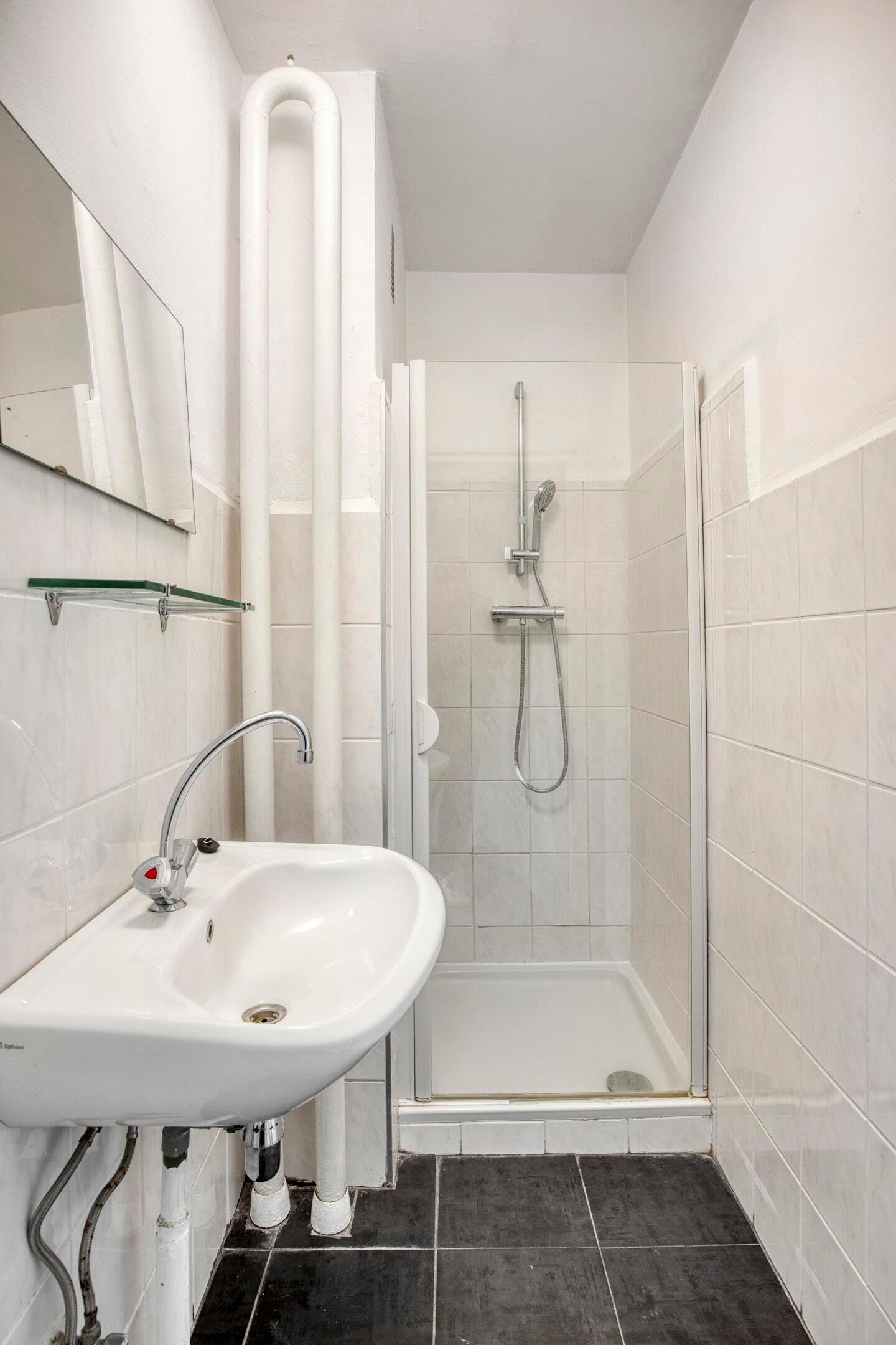 De eenvoudige badkamer is uitgerust met een wastafel en douche. In de naastgelegen ruimte bevind zich het toilet.