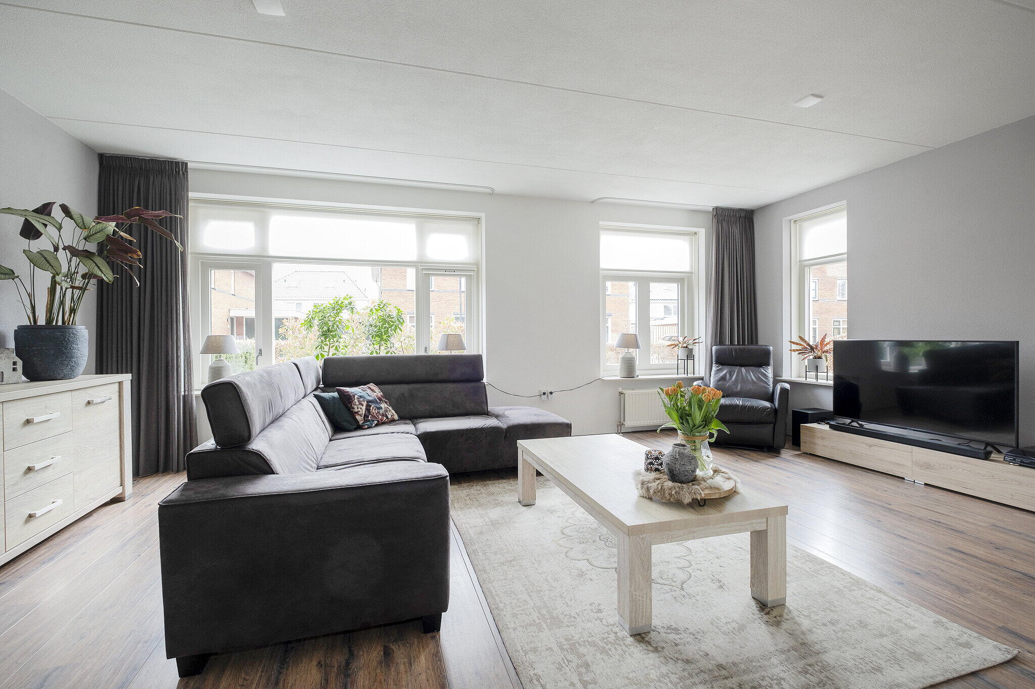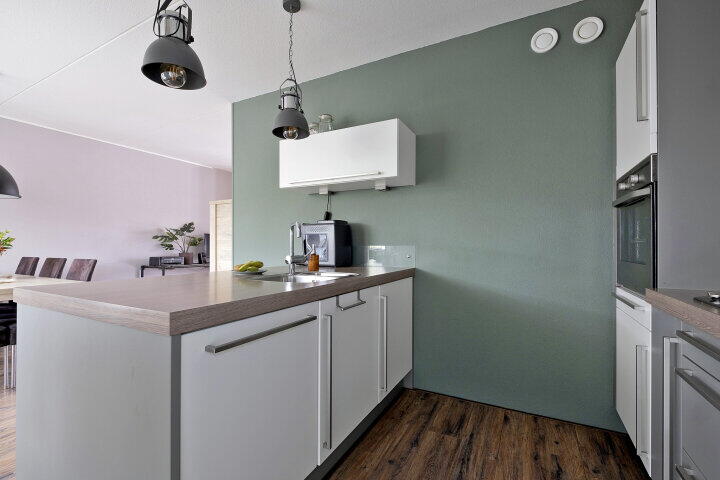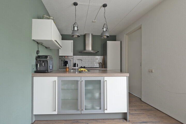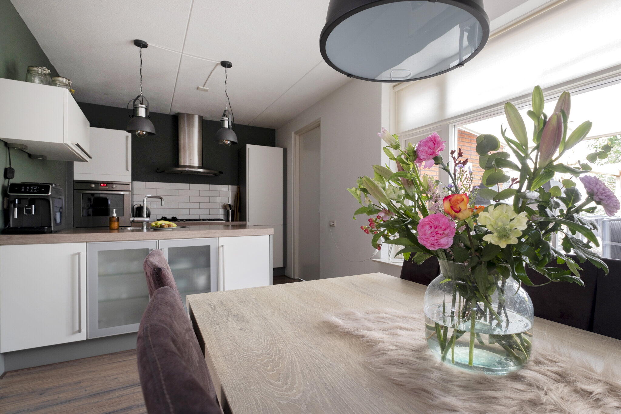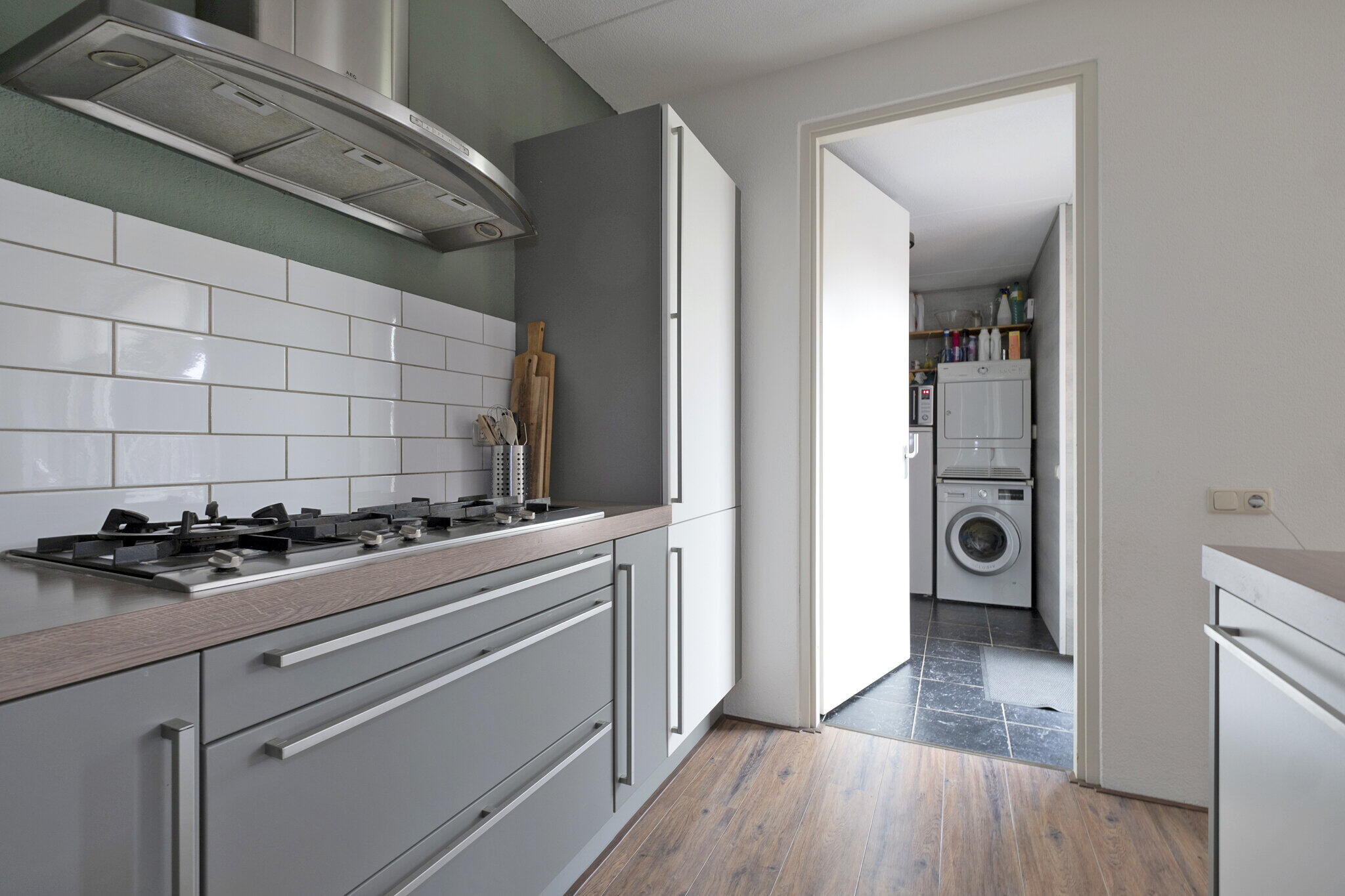 Entree met toilet, meterkast en trapopgang naar de verdieping. De L-vormige, ruime woonkamer (ca. 41m²) heeft volop lichtinval door de vele raampartijen. De moderne open keuken (ca. 11m²) is voorzien van een spoeleiland, een 6-pits gaskookplaat, een afzuigkap, een vaatwasser, een combimagnetron en een koelkast, evenals volop bergruimte. Achter de keuken bevindt zich de bijkeuken met aansluiting voor witgoed en toegang tot de garage.
