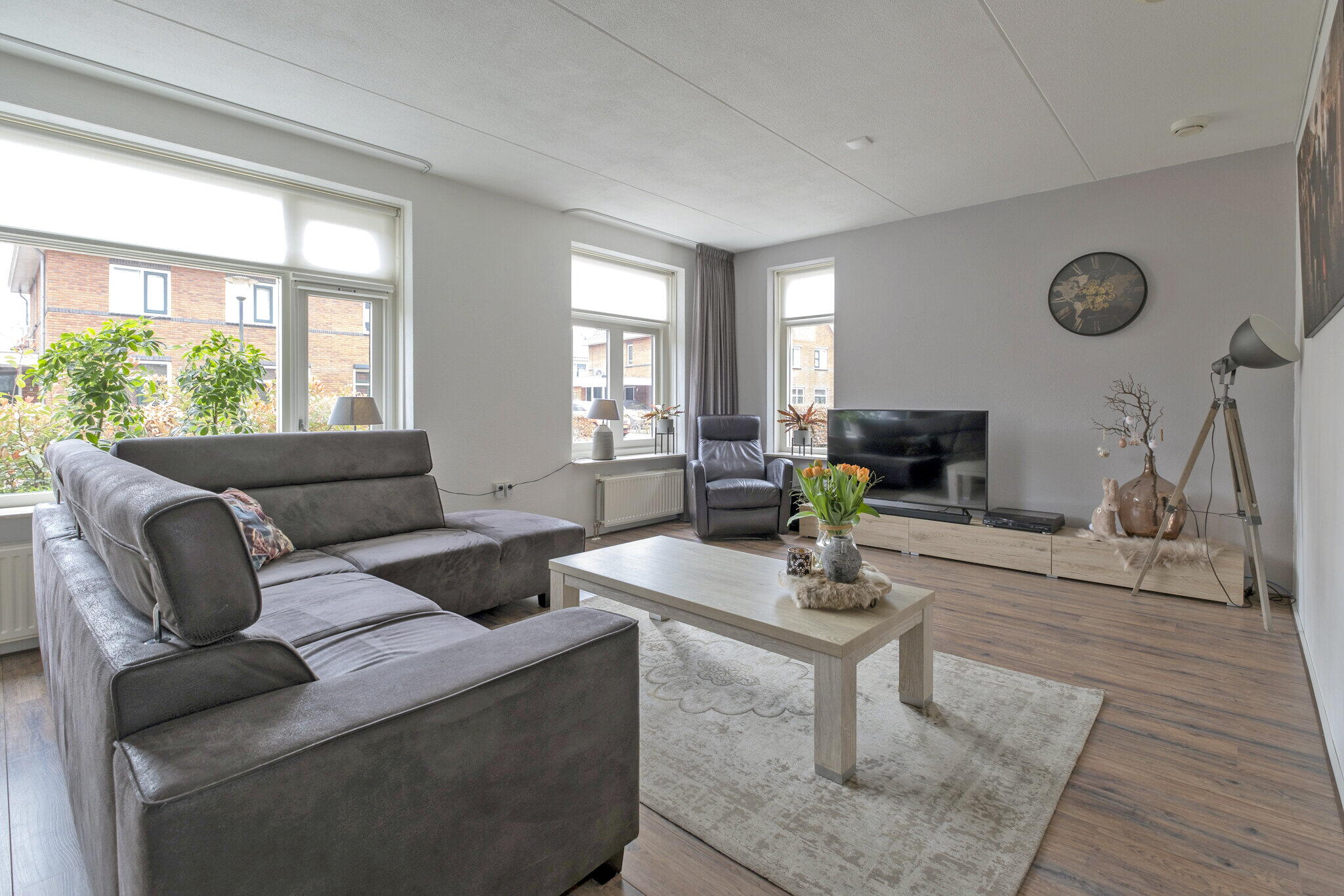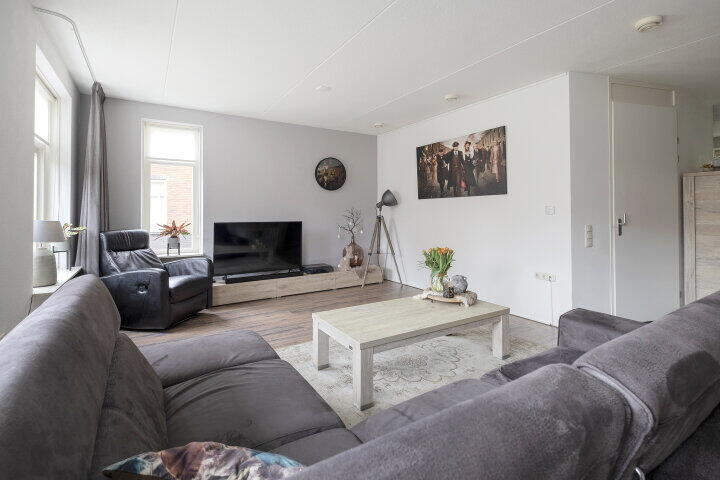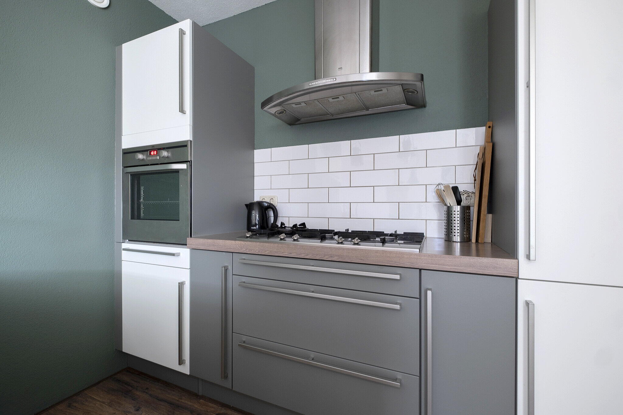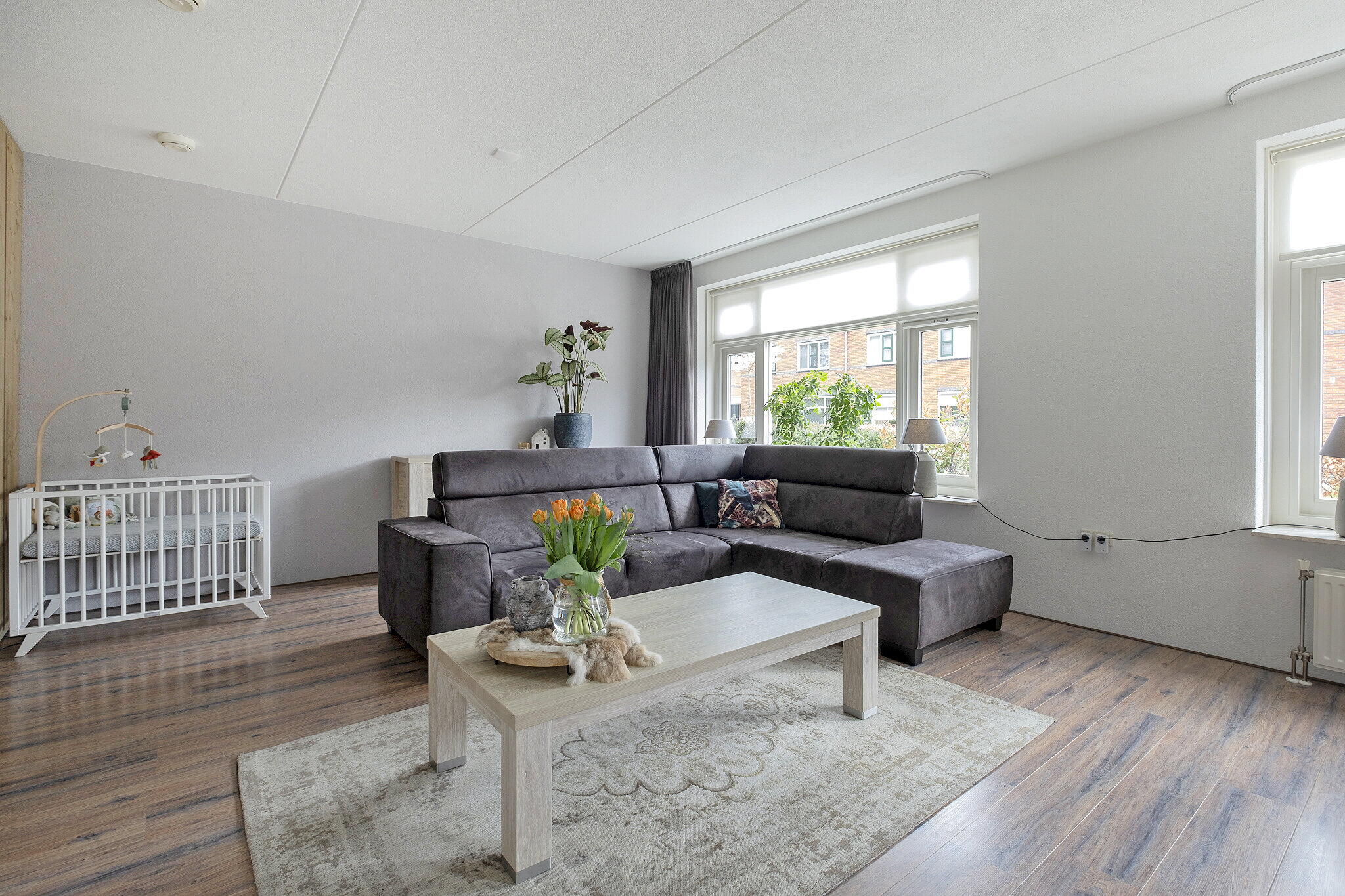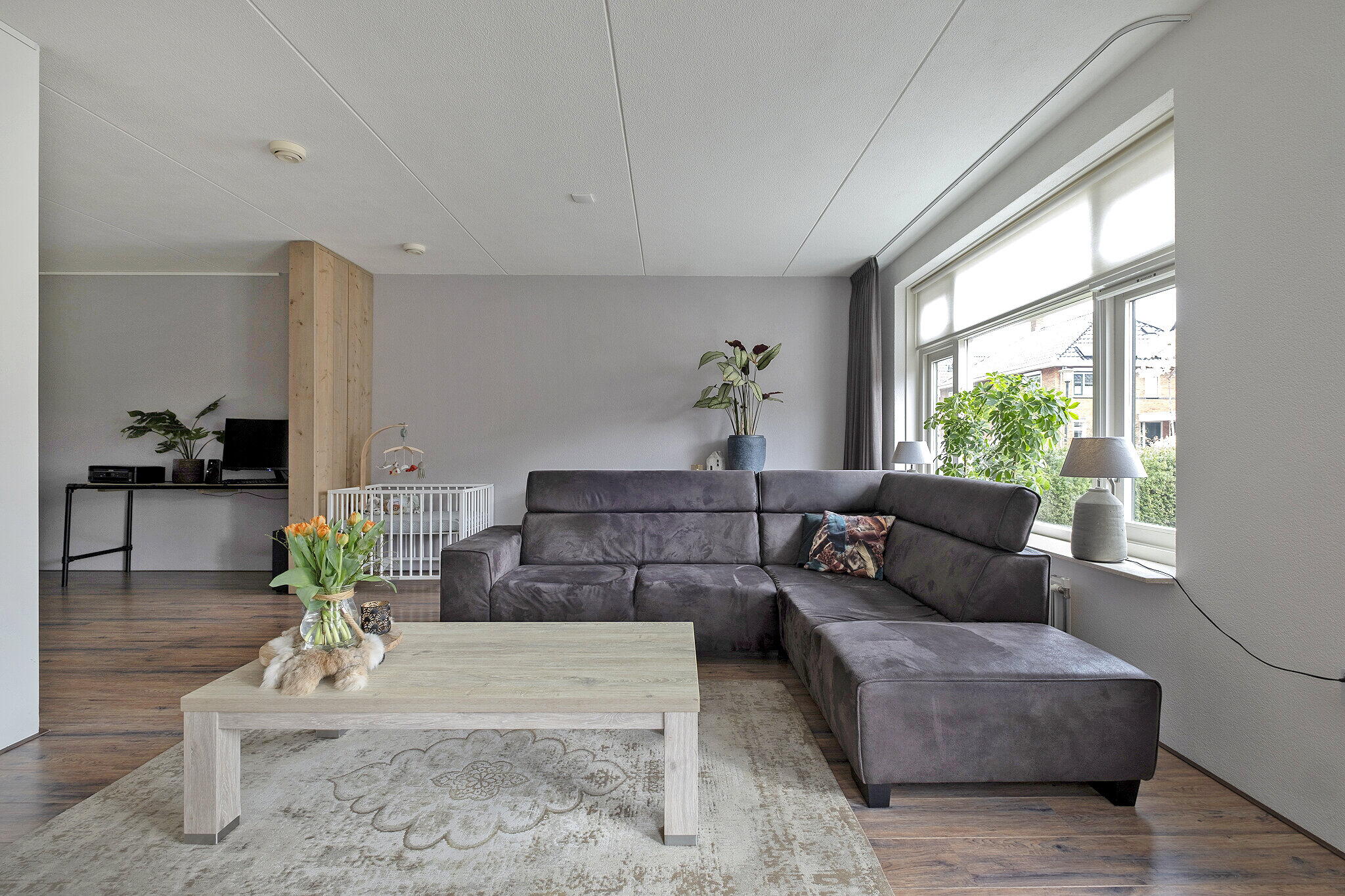 Entree met toilet, meterkast en trapopgang naar de verdieping. De L-vormige, ruime woonkamer (ca. 41m²) heeft volop lichtinval door de vele raampartijen. De moderne open keuken (ca. 11m²) is voorzien van een spoeleiland, een 6-pits gaskookplaat, een afzuigkap, een vaatwasser, een combimagnetron en een koelkast, evenals volop bergruimte. Achter de keuken bevindt zich de bijkeuken met aansluiting voor witgoed en toegang tot de garage.