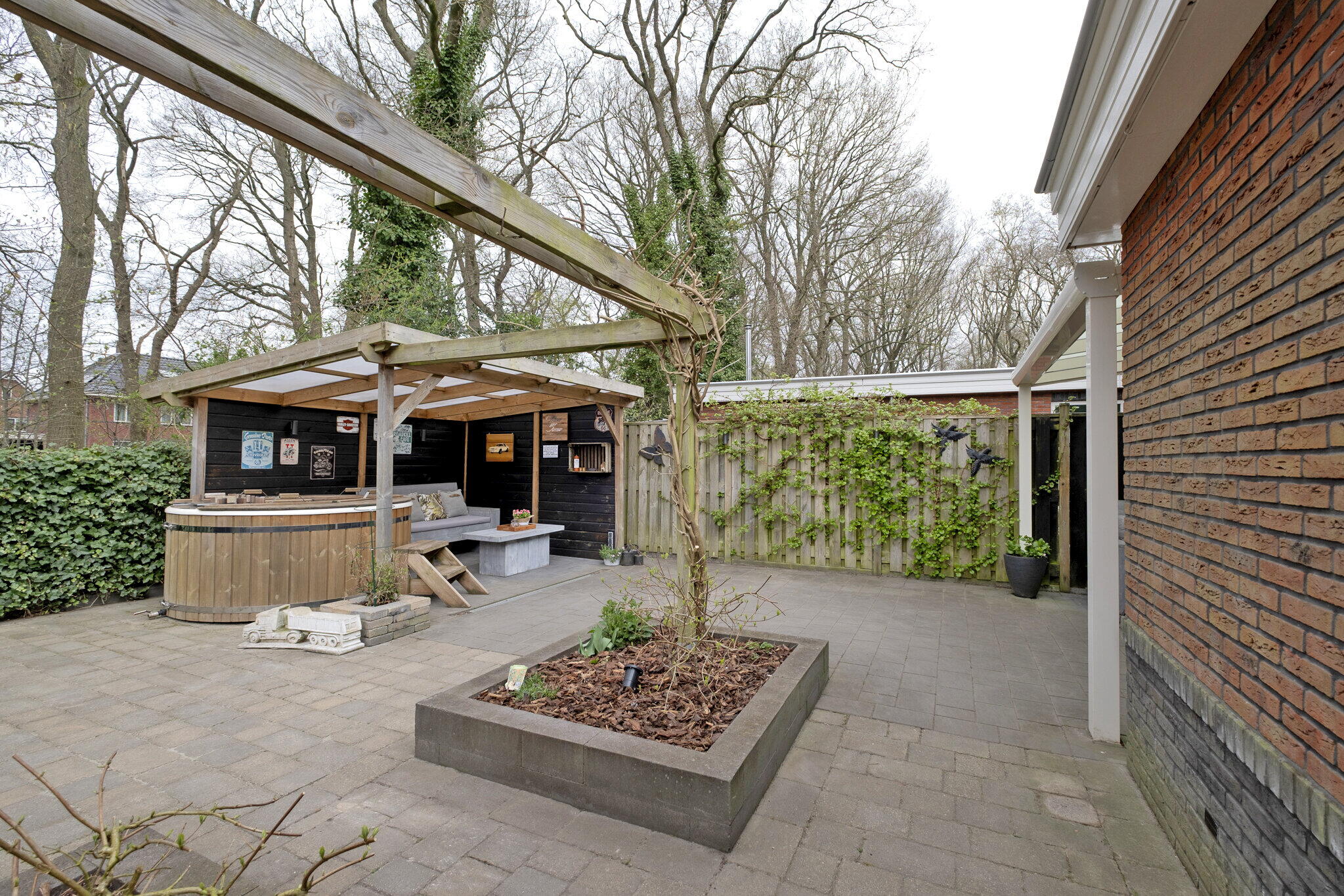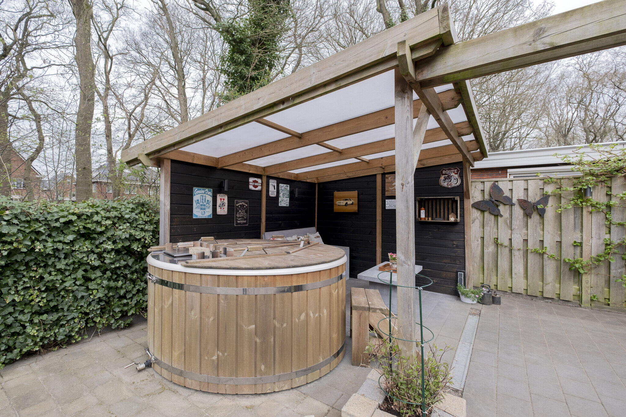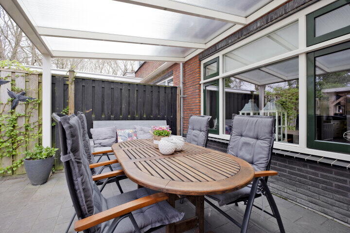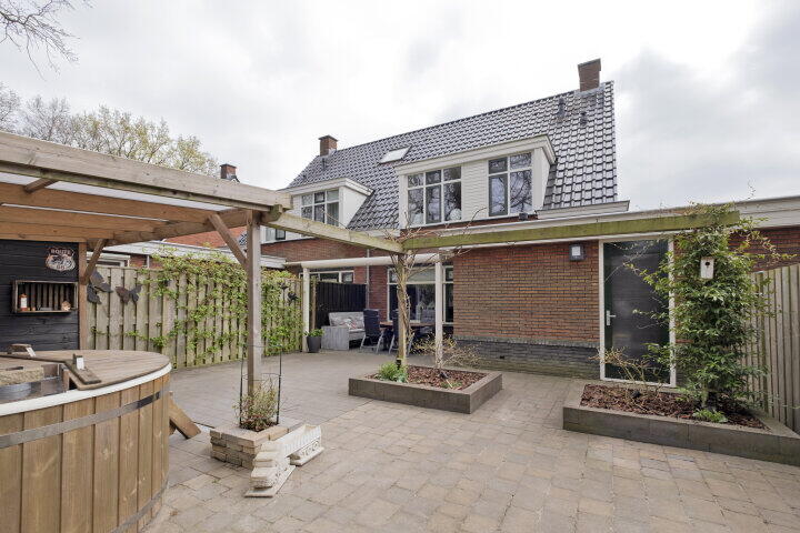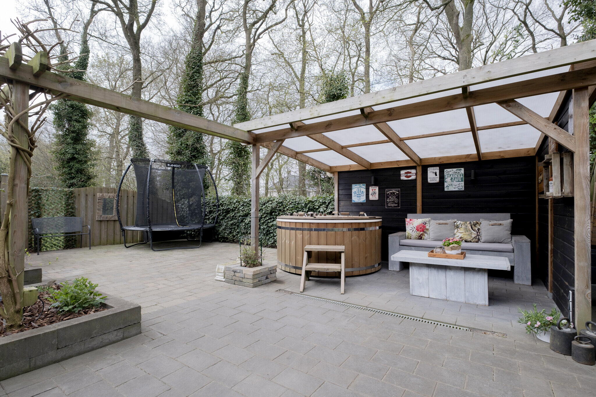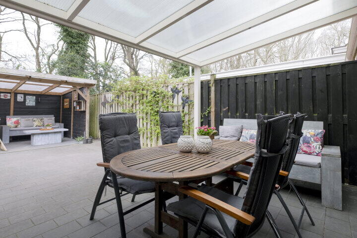 De achtertuin is onderhoudsvriendelijk aangelegd, biedt voldoende privacy en is gericht op het westen. Aangebouwd aan het huis is een overkapping (ca. 14m²), wat zorgt voor een beschut terras om heerlijk te zitten. Achterin de tuin is een houten overkapping met terras gerealiseerd.