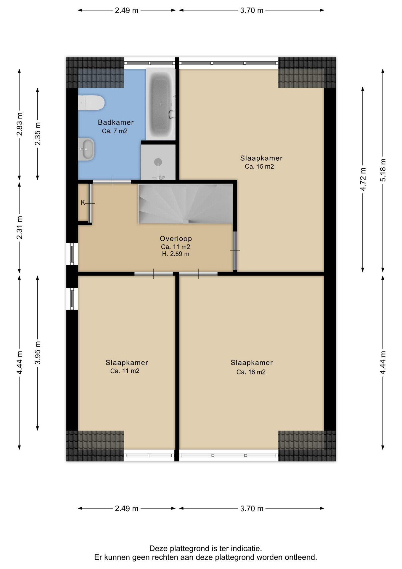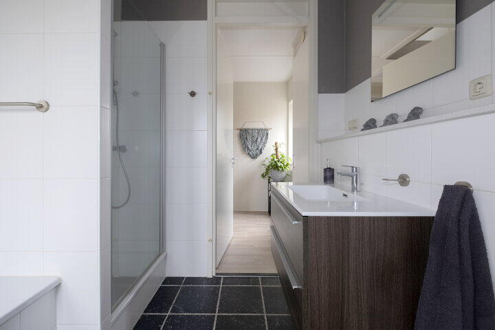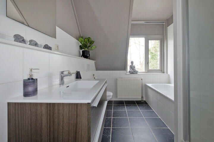 Overloop met toegang tot 3 lichte en ruime slaapkamers (ca. 16m², ca. 15m² en ca. 11m²). De nette badkamer (ca. 7m²) is voorzien van een ligbad, een douche, een toilet en een wastafelmeubel.