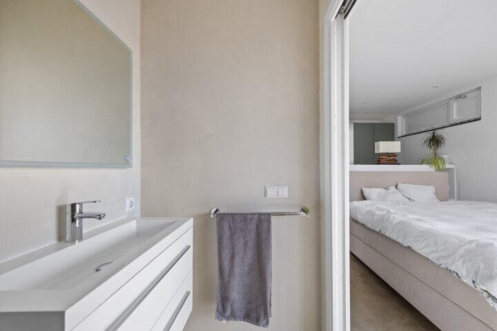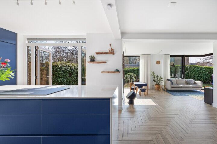 De uitbouw aan de woonkamer is met recht spectaculair te noemen: door het gebruik van glaspanelen die van de vloer tot het plafond reiken, valt er een enorme hoeveelheid daglicht de woonkamer in. En bent u bang dat het te warm wordt of wilt u liever in de schaduw zitten, dan brengen de verticale, elektrische screens uitkomst.