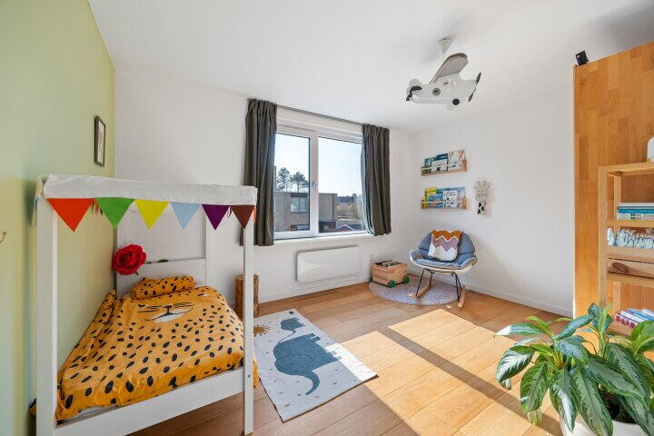 Via de trap bereikt men de eerste verdieping. Hier komt men op de overloop waaraan zich een grote bergkast bevindt. Op deze verdieping bevinden zich drie ruime slaapkamers, twee aan de zijkant van het huis en een aan de voorzijde. Aan de overloop bevindt zich tevens de eerste badkamer, die modern is uitgevoerd en voorzien van een ligbad, toilet en wastafelmeubel. De gehele eerste verdieping is voorzien van een lichte lamelparketvloer. Trap naar de tweede verdieping alwaar men de extra grote opbouw (circa 27 m²) bereikt. Hier bevindt zich de hoofdslaapkamer met vaste kast en een-suite gelegen tweede badkamer. Deze badkamer is voorzien van een grote inloopdouche met glazen schuifwand en een wastafelmeubel. Door de riante afmeting van deze kamer is er tevens nog plek voor een inspirerende werkplek met vrij uitzicht over de wijk en het sedumdak. De vloer van de tweede verdieping is uitgevoerd in een gietvloer met vloerverwarming.