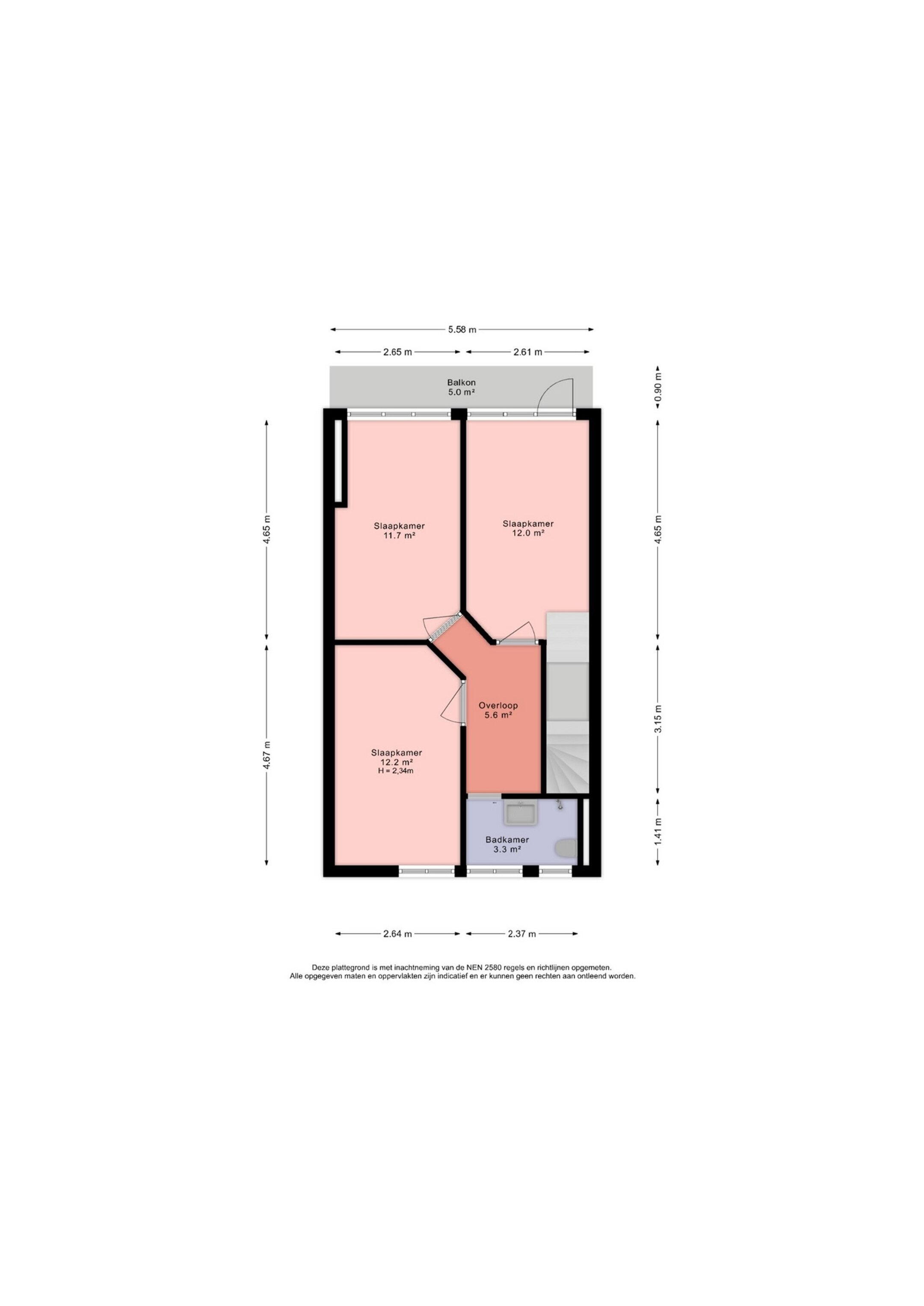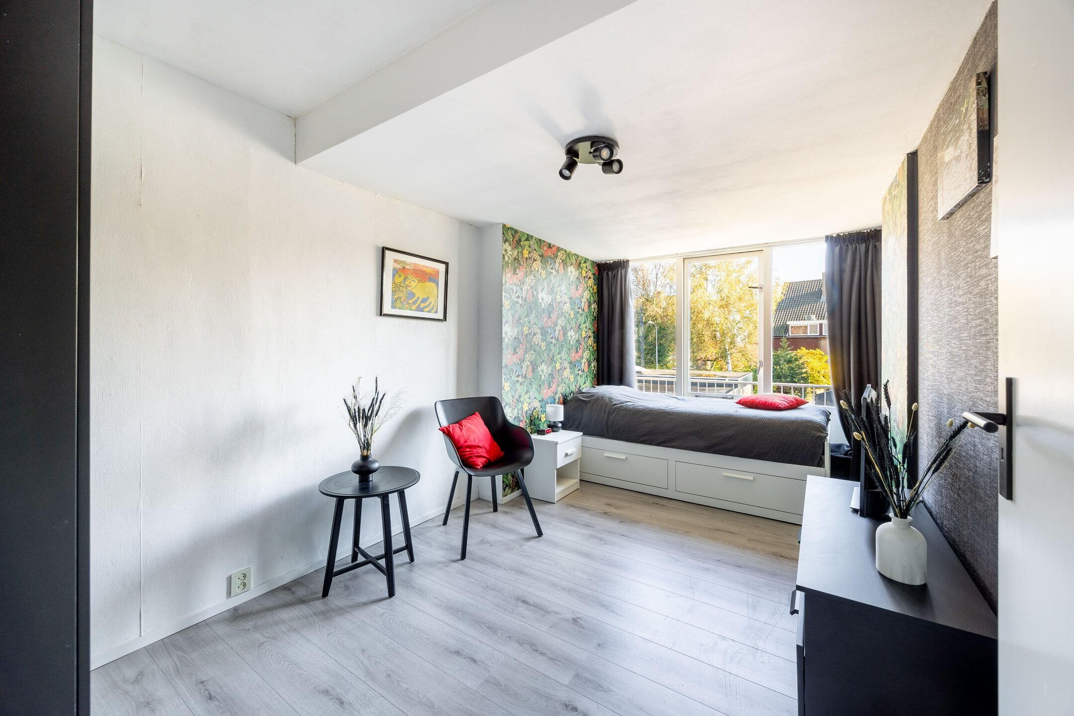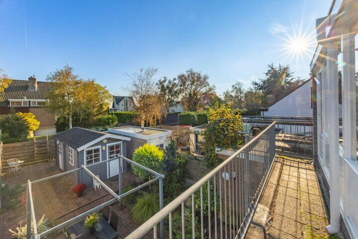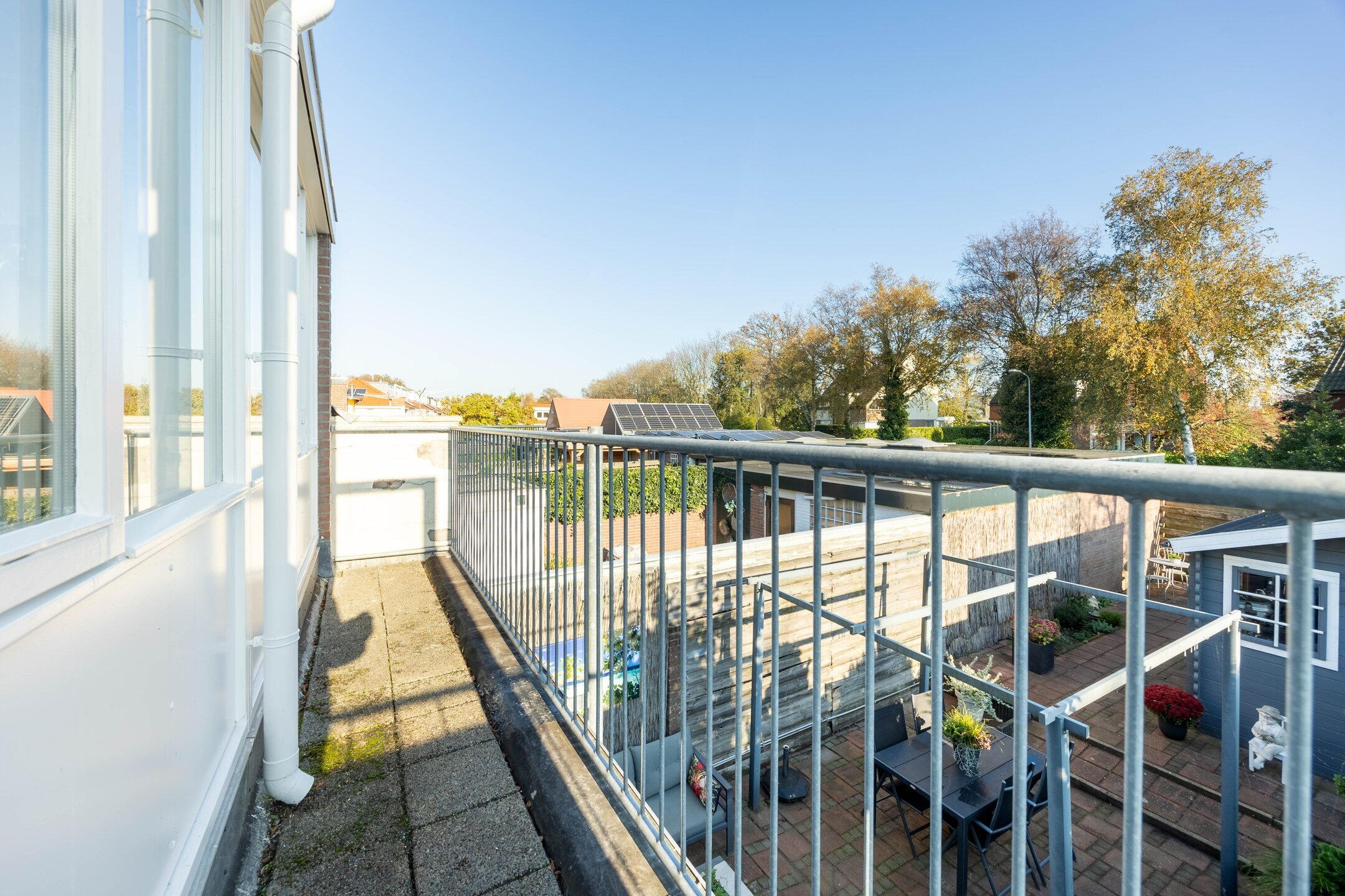 Eerste verdieping: overloop, 1 slaapkamer en badkamer aan de voorzijde, 2 slaapkamers aan de achterzijde met balkon op uitbouw van de begane grond, vlizotrap naar handige ruime bergvliering.