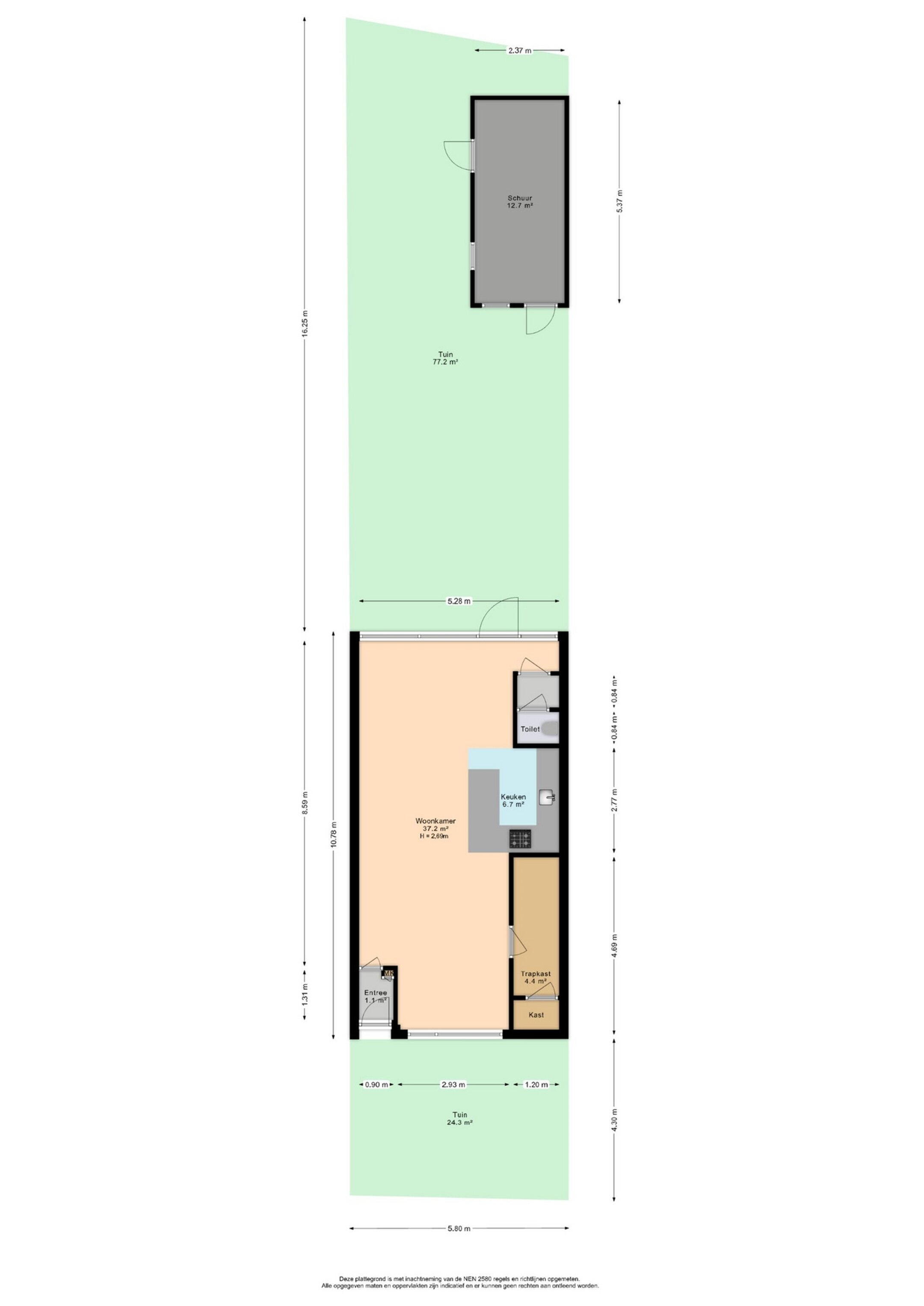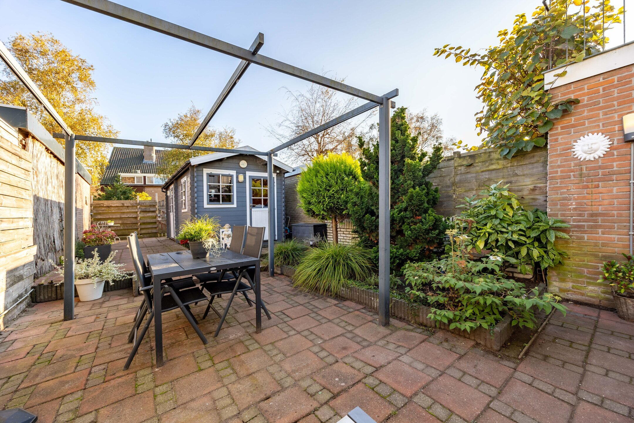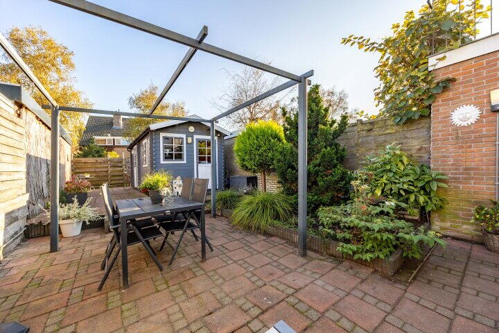 Indeling: voortuin, entree woonhuis, leuke en brede woon eetkamer met aan de achterzijde uitbouw met hier de semi open keuken en deur naar de heerlijke achtertuin, eenvoudige badgelegenheid met douche en toilet.