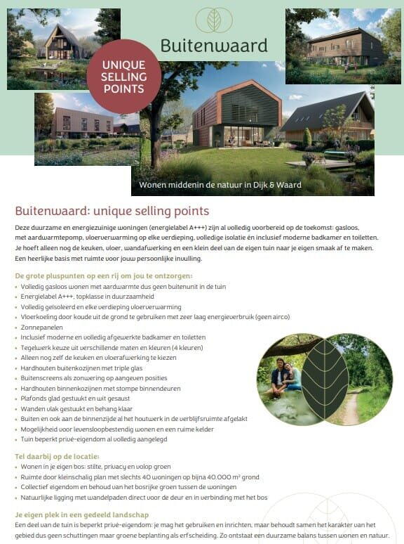 Buitenwaard is een kleinschalig, exclusief woongebied met slechts 40 woningen, zorgvuldig ingepast in het bos. Hier kun je wonen zoals je wilt. Exclusief, in een van de 16 vrijstaande villa’s in zeven verschillende uitvoeringen, gelegen op bospercelen met een privé tuin rondom en aan de rand van een watergang. Comfortabel, in een van de 14 twee-onder-een-kapwoningen in het groene middengebied. Of riant, in een van de 10 rijwoningen, verdeeld over een blok van 4 en een blok van 6 onder één kap aan de waterrijke randen van het plan.