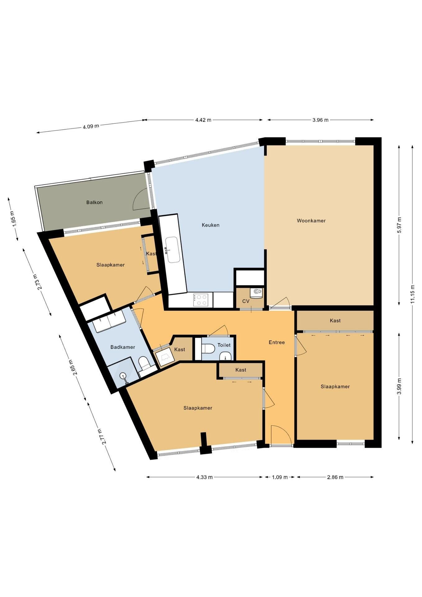 Het appartement heeft drie comfortabele slaapkamers, allemaal voorzien van vaste schuifkasten. Dankzij de doorlopende vloer en de nette afwerking vormen dit rustige en praktische ruimtes die ideaal zijn als slaap-, werk- of hobbykamer. Elke kamer beschikt over een elektrische thermostaat verwarmingspaneel.