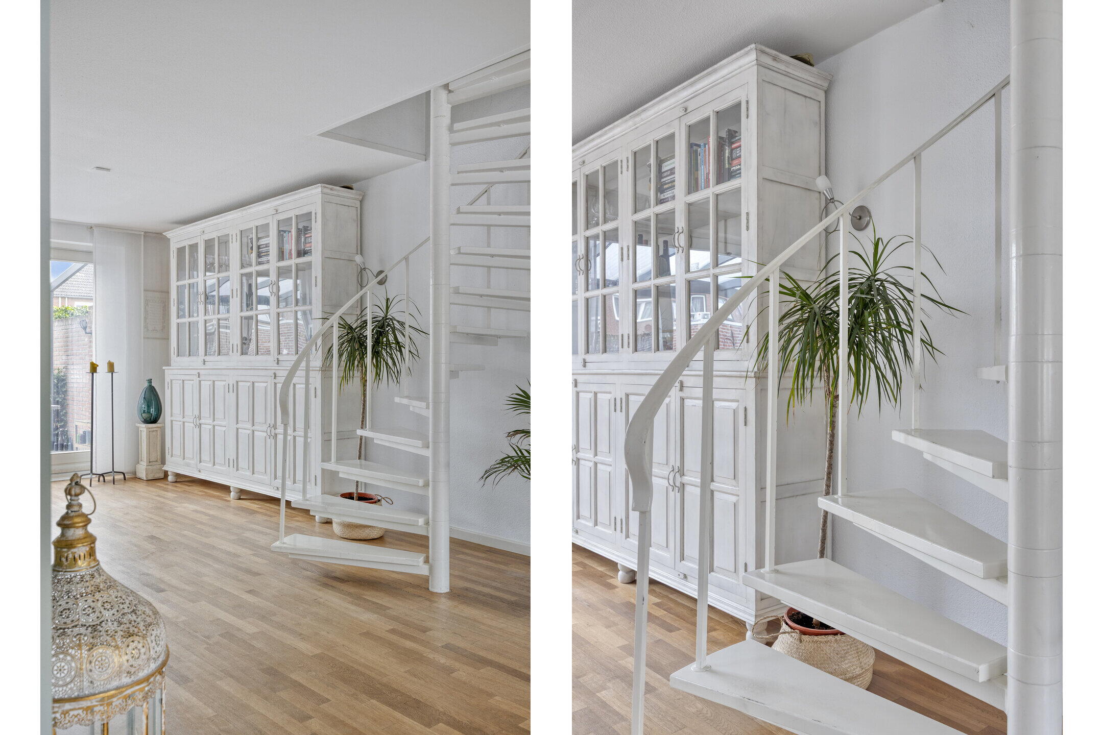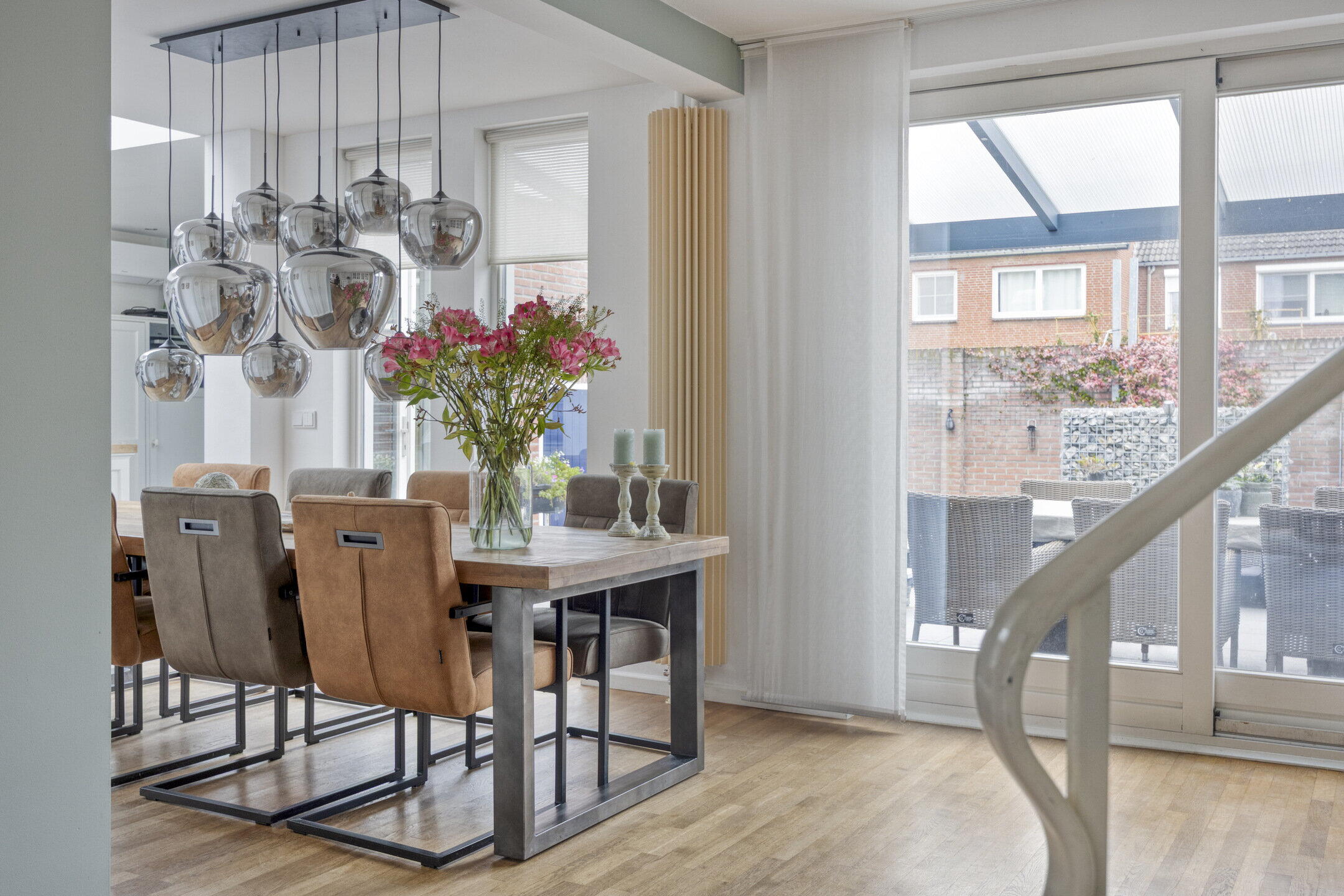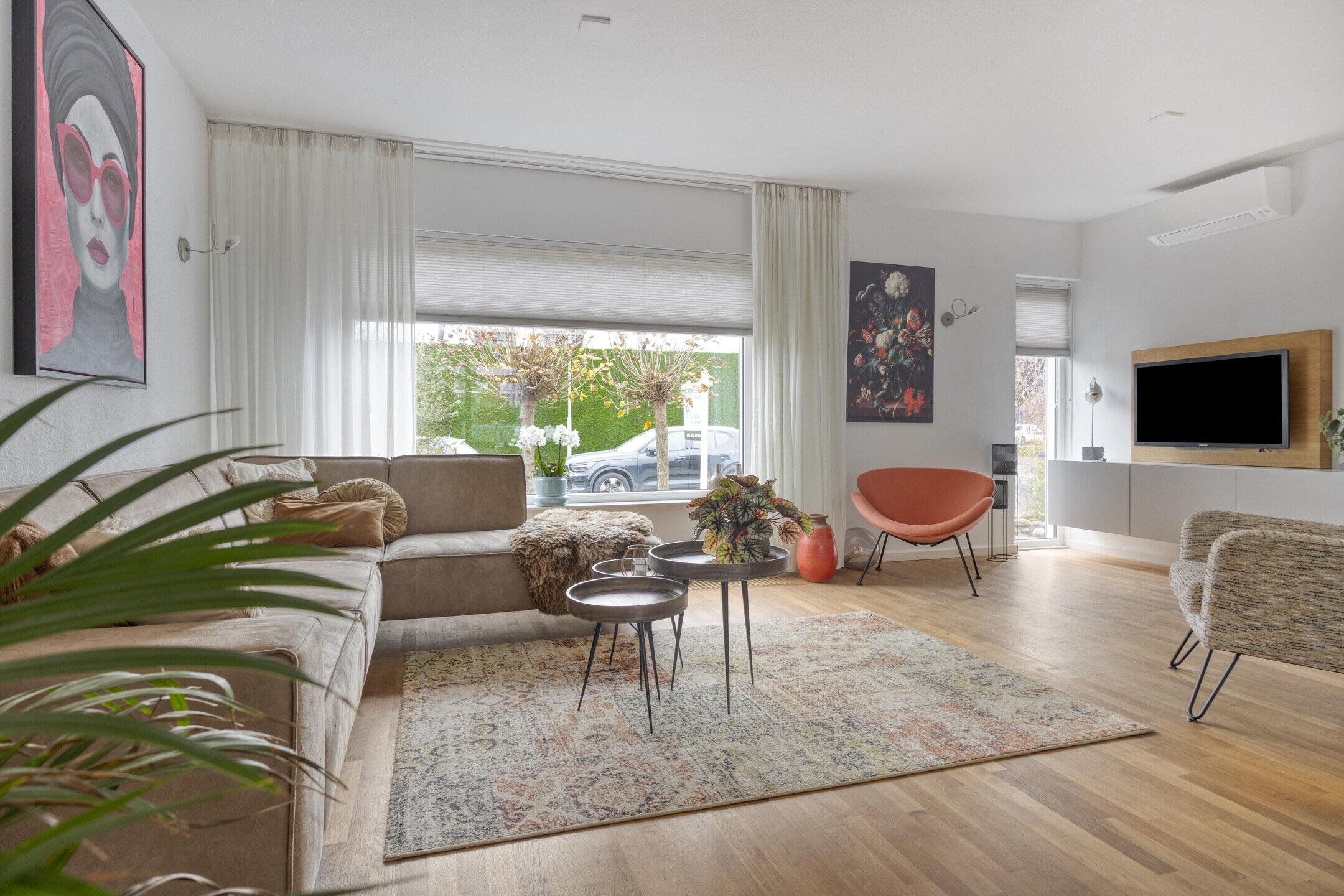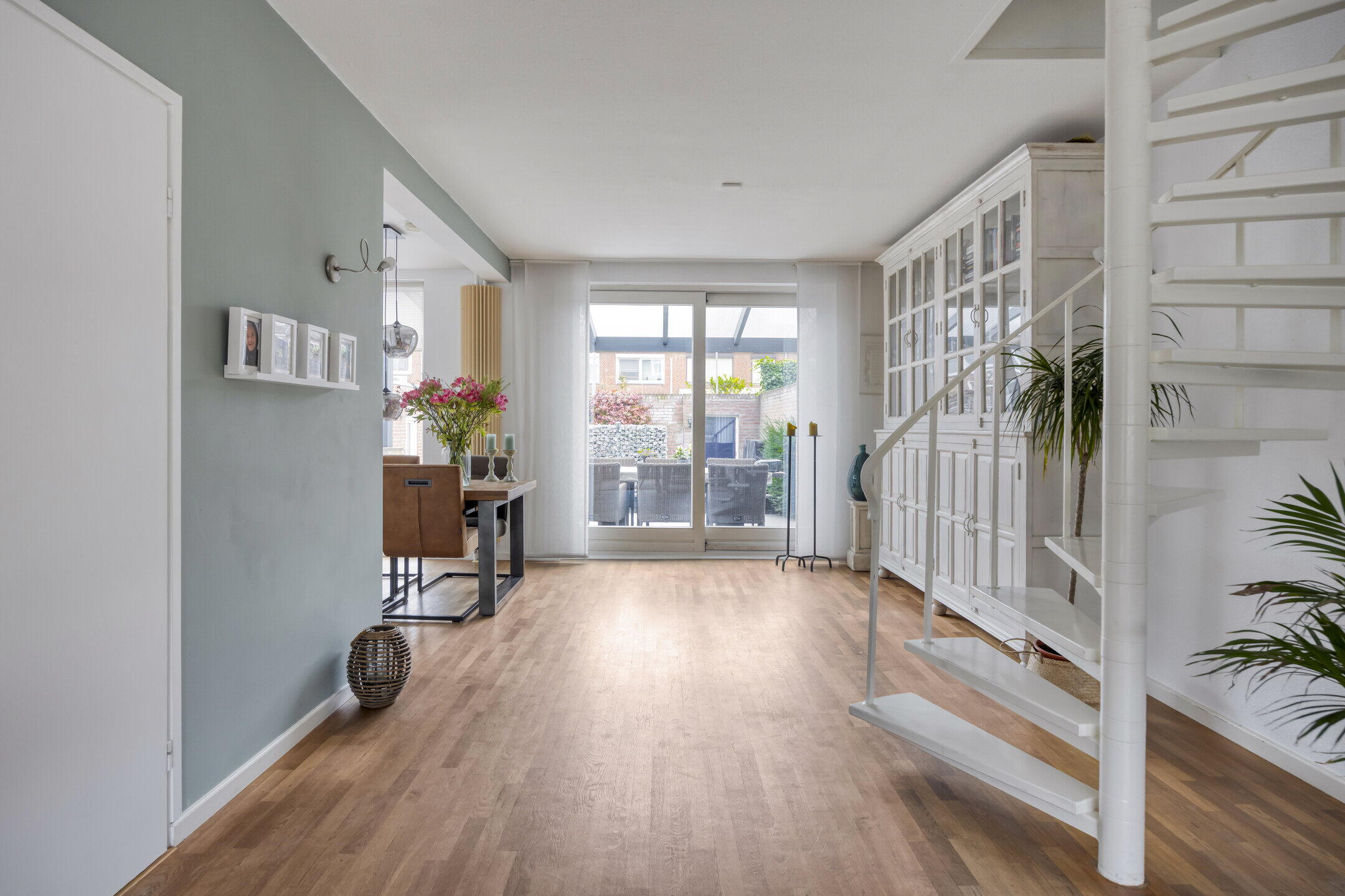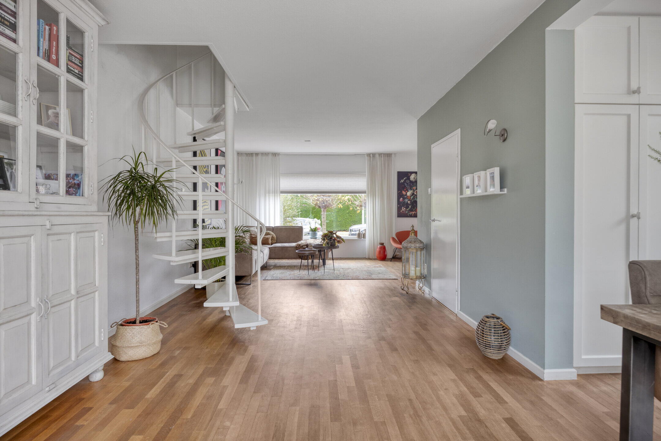 U-vormige living (circa 50 m²) met eikenhouten parketvloer, gashaard en grote raampartijen aan beide zijden voor optimaal daglicht. De open wenteltrap vormt een stijlvol element in de woonruimte zonder onnodig oppervlak in te nemen. Via de schuifpui is er direct contact met de achtertuin en het terras.