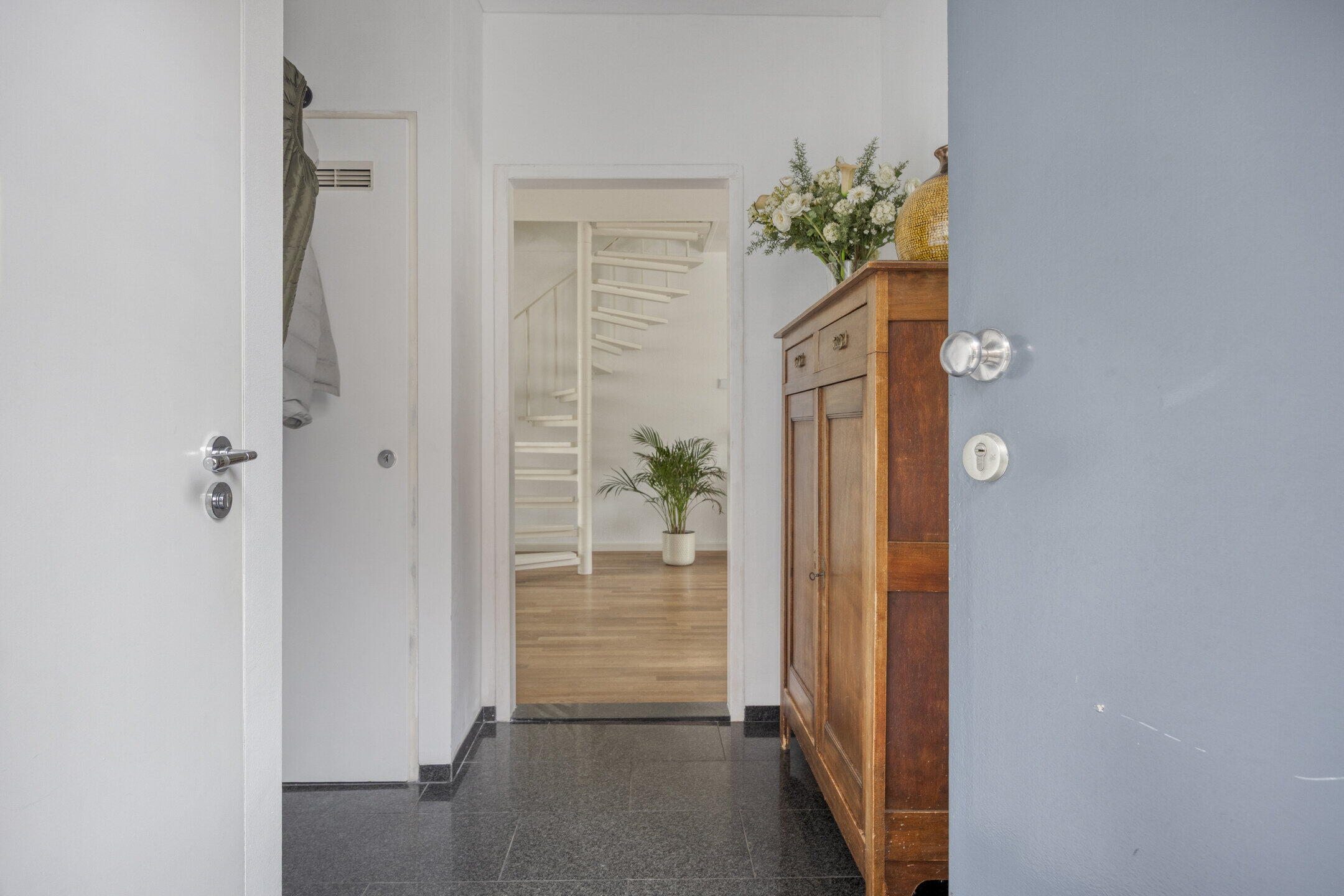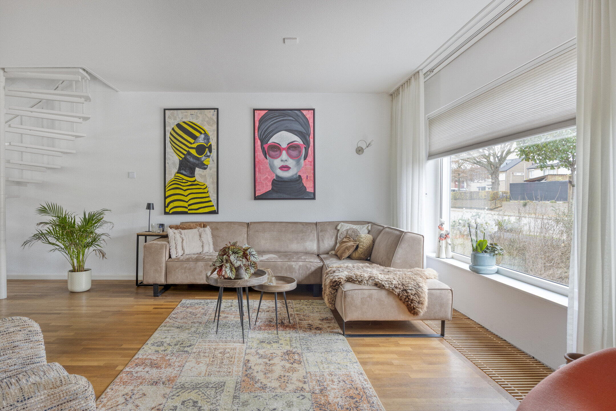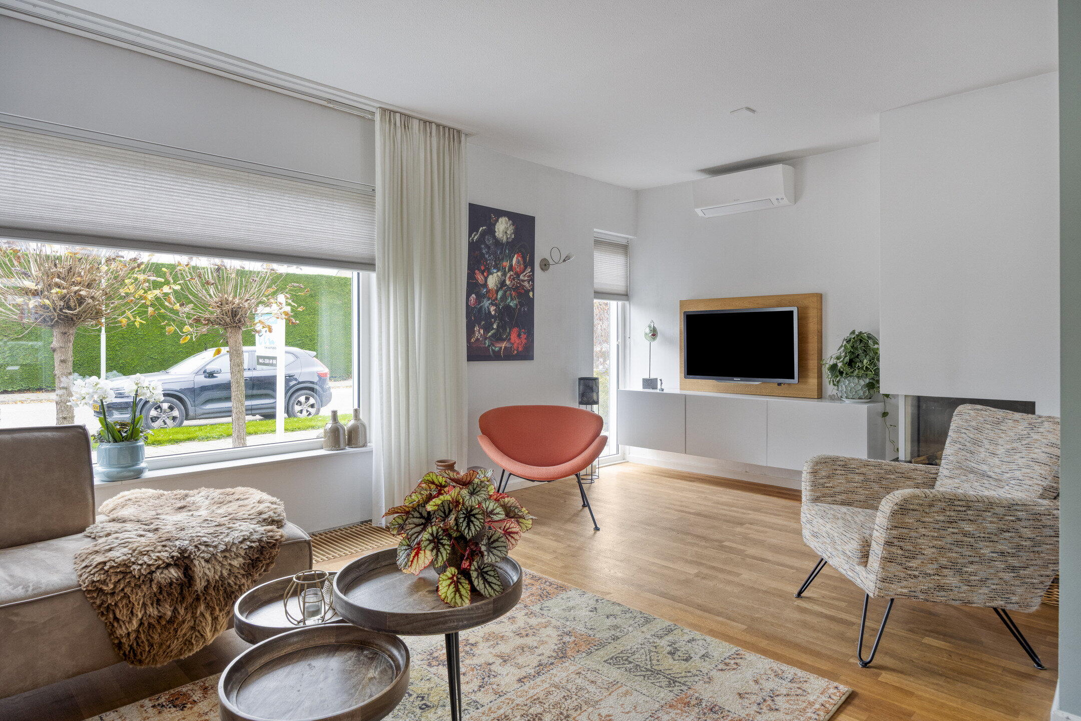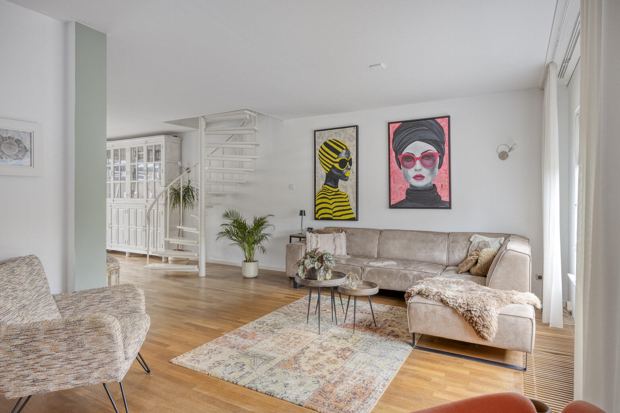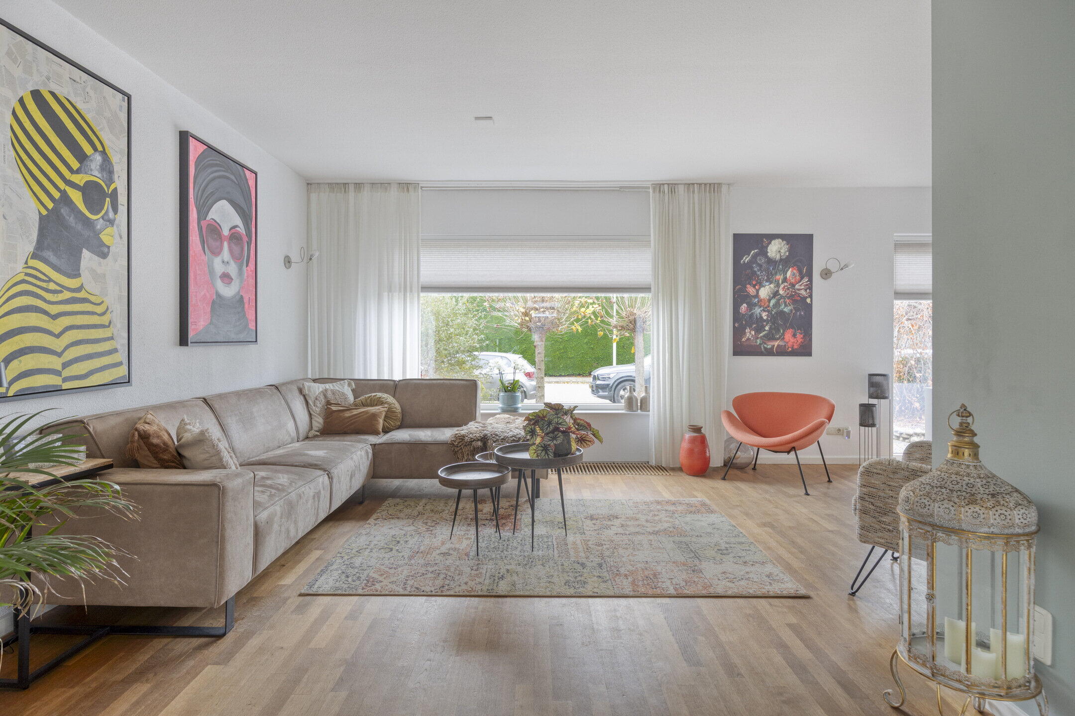 U-vormige living (circa 50 m²) met eikenhouten parketvloer, gashaard en grote raampartijen aan beide zijden voor optimaal daglicht. De open wenteltrap vormt een stijlvol element in de woonruimte zonder onnodig oppervlak in te nemen. Via de schuifpui is er direct contact met de achtertuin en het terras.