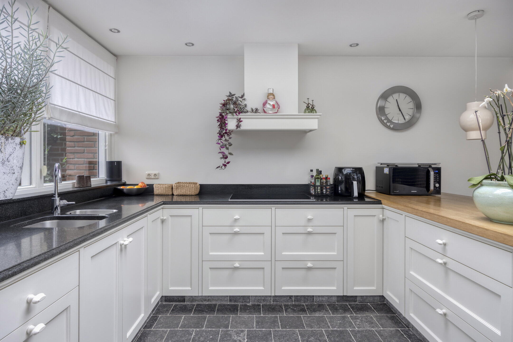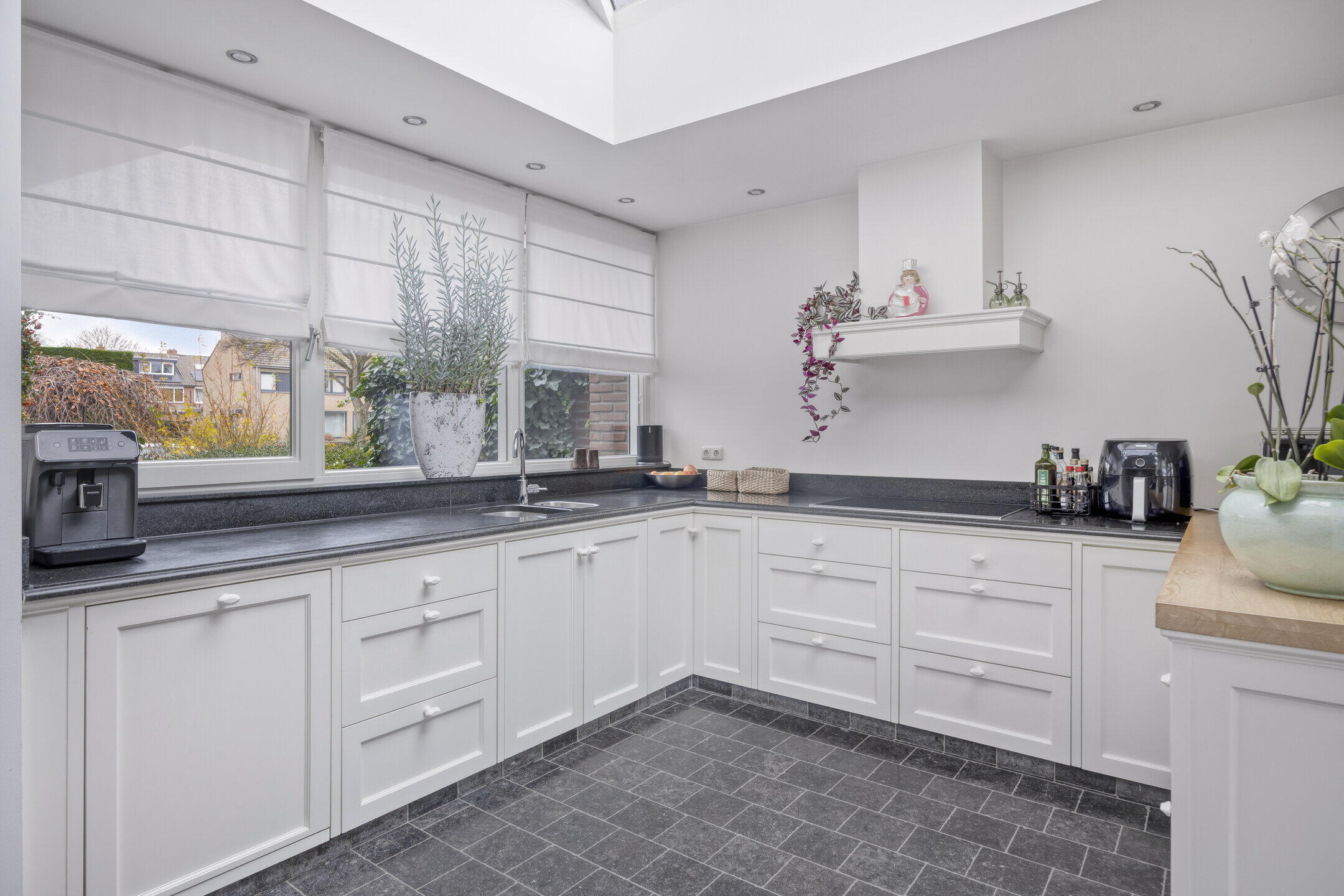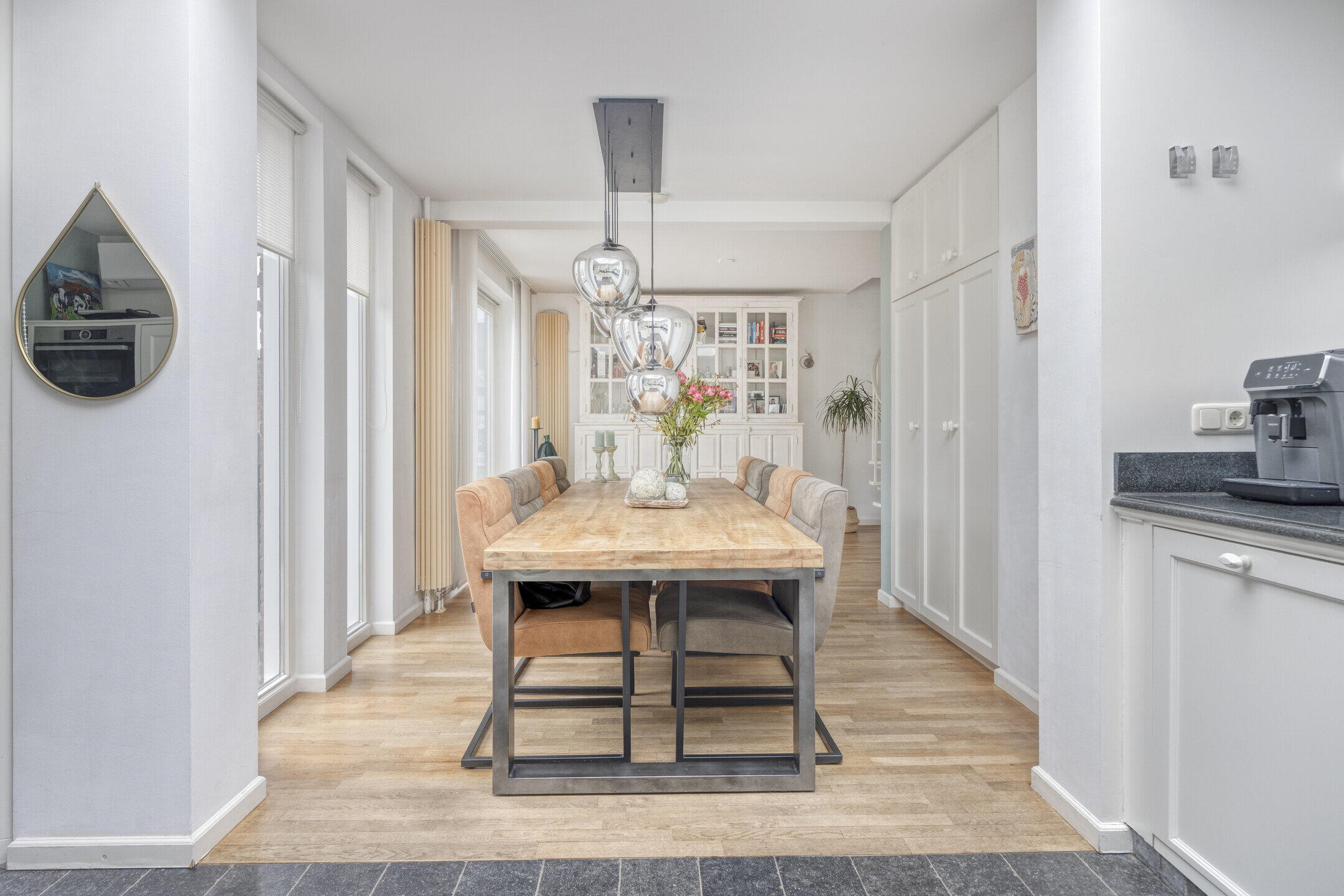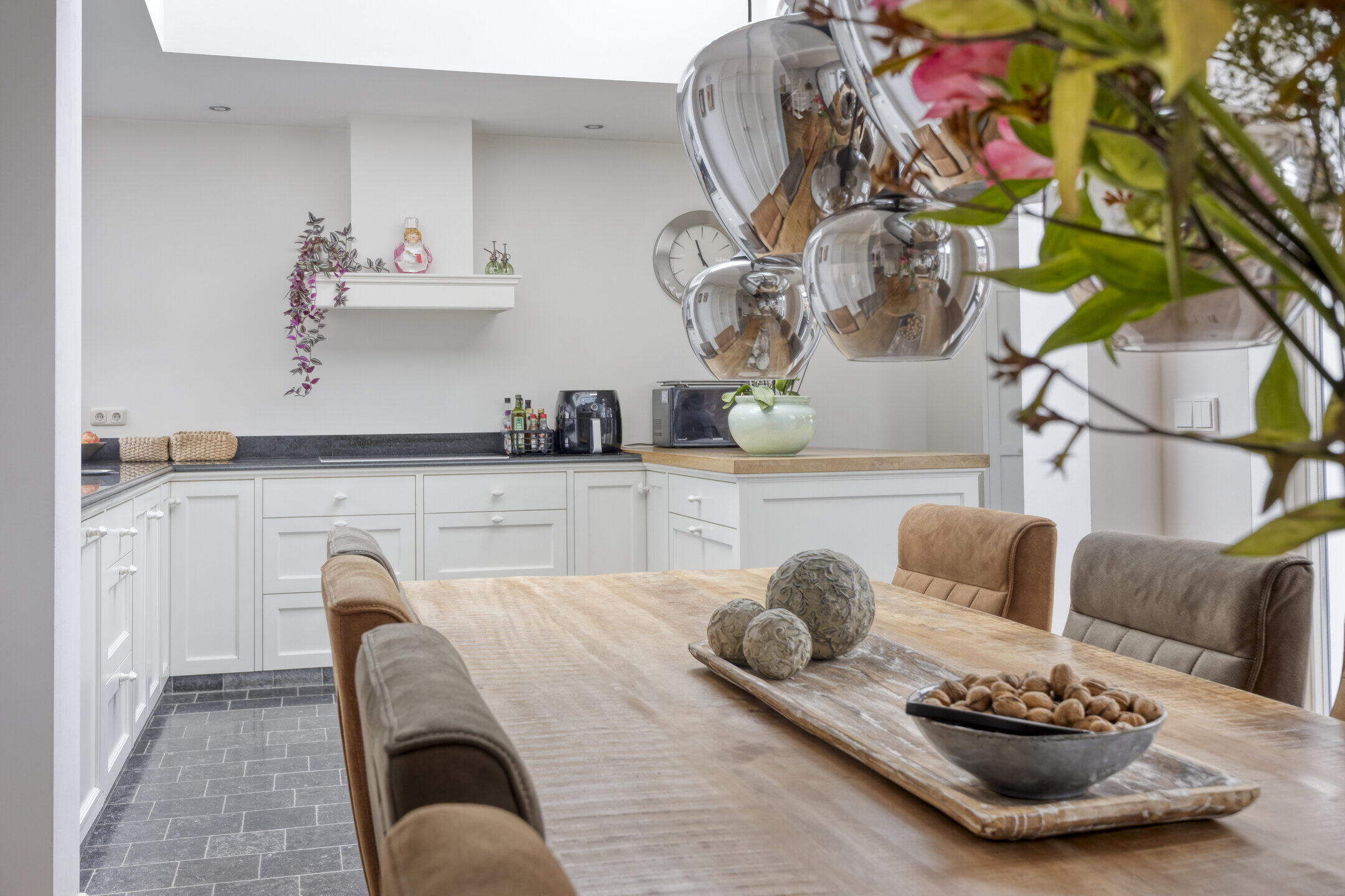 Woonkeuken ca. 18 m², aangebouwd in 2004, met natuursteenvloer met vloerverwarming en grote lichtstraat. De keukenopstelling is in een U-vorm, gezellig en praktisch, voorzien van hardstenen werkbladen, 5-pits inductiekookplaat, koelkast, vaatwasser, stoomoven en veel kastruimte. In de woonkeuken kun je uitstekend samen met vrienden koken en zelfs een 8-10 persoons eettafel kun je prima kwijt in de eetkamer.