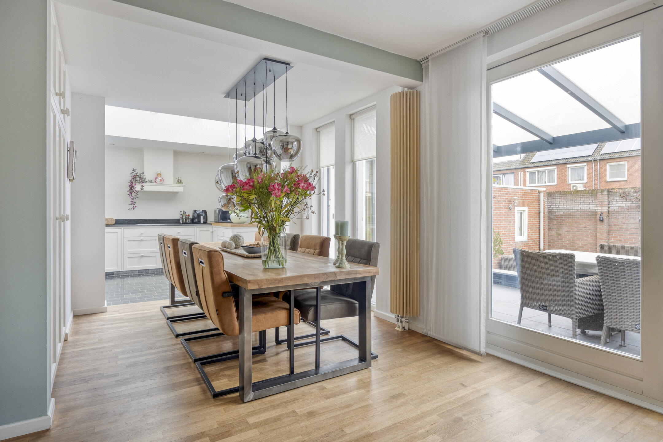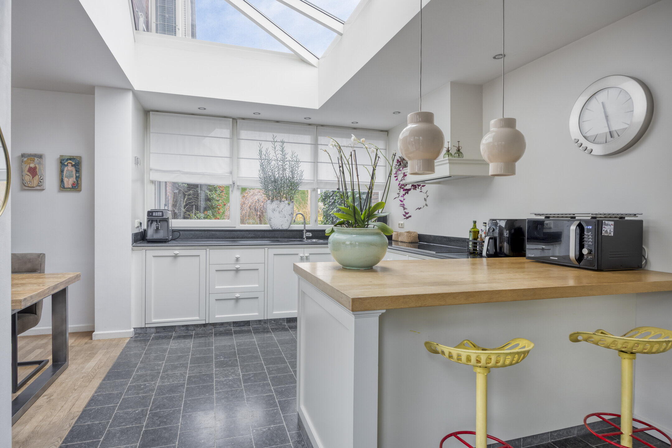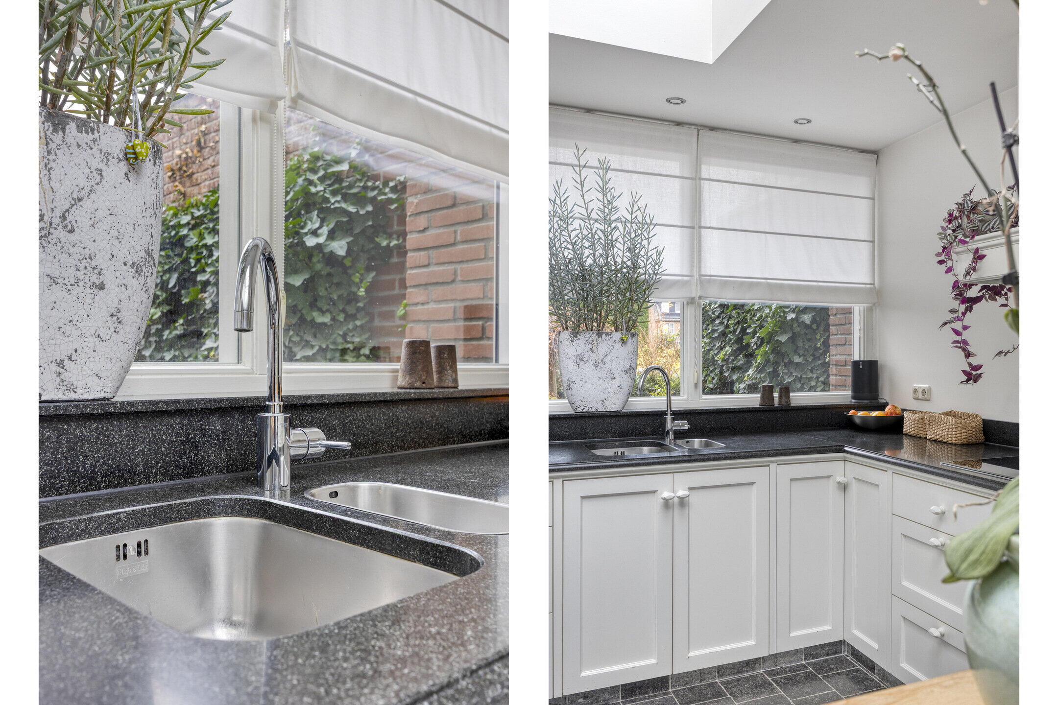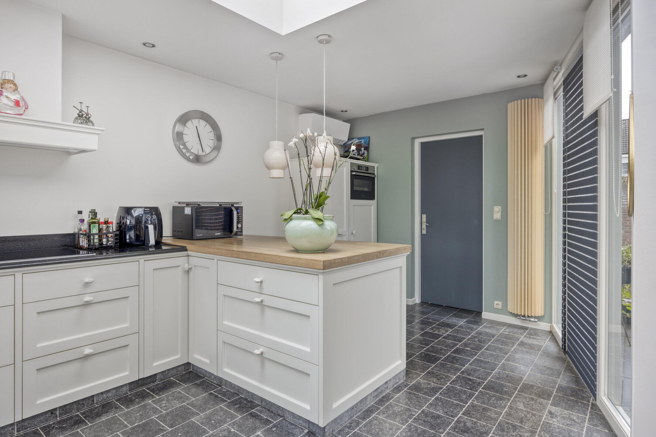 Woonkeuken ca. 18 m², aangebouwd in 2004, met natuursteenvloer met vloerverwarming en grote lichtstraat. De keukenopstelling is in een U-vorm, gezellig en praktisch, voorzien van hardstenen werkbladen, 5-pits inductiekookplaat, koelkast, vaatwasser, stoomoven en veel kastruimte. In de woonkeuken kun je uitstekend samen met vrienden koken en zelfs een 8-10 persoons eettafel kun je prima kwijt in de eetkamer.