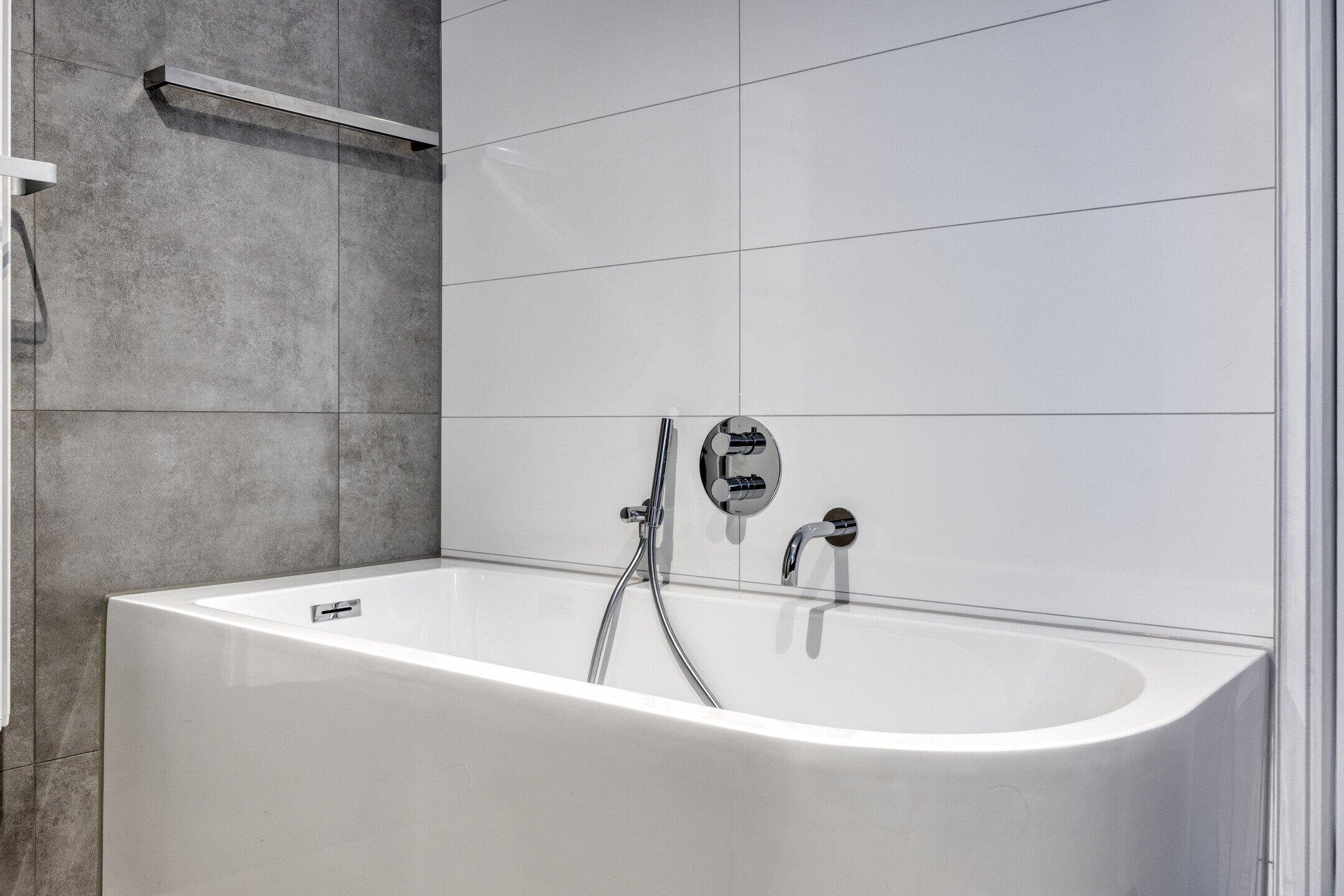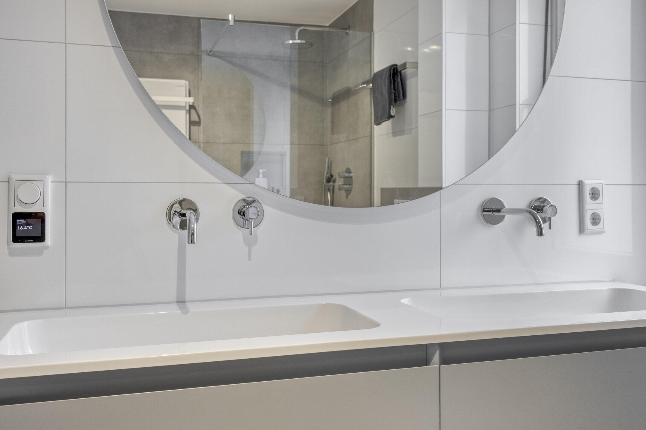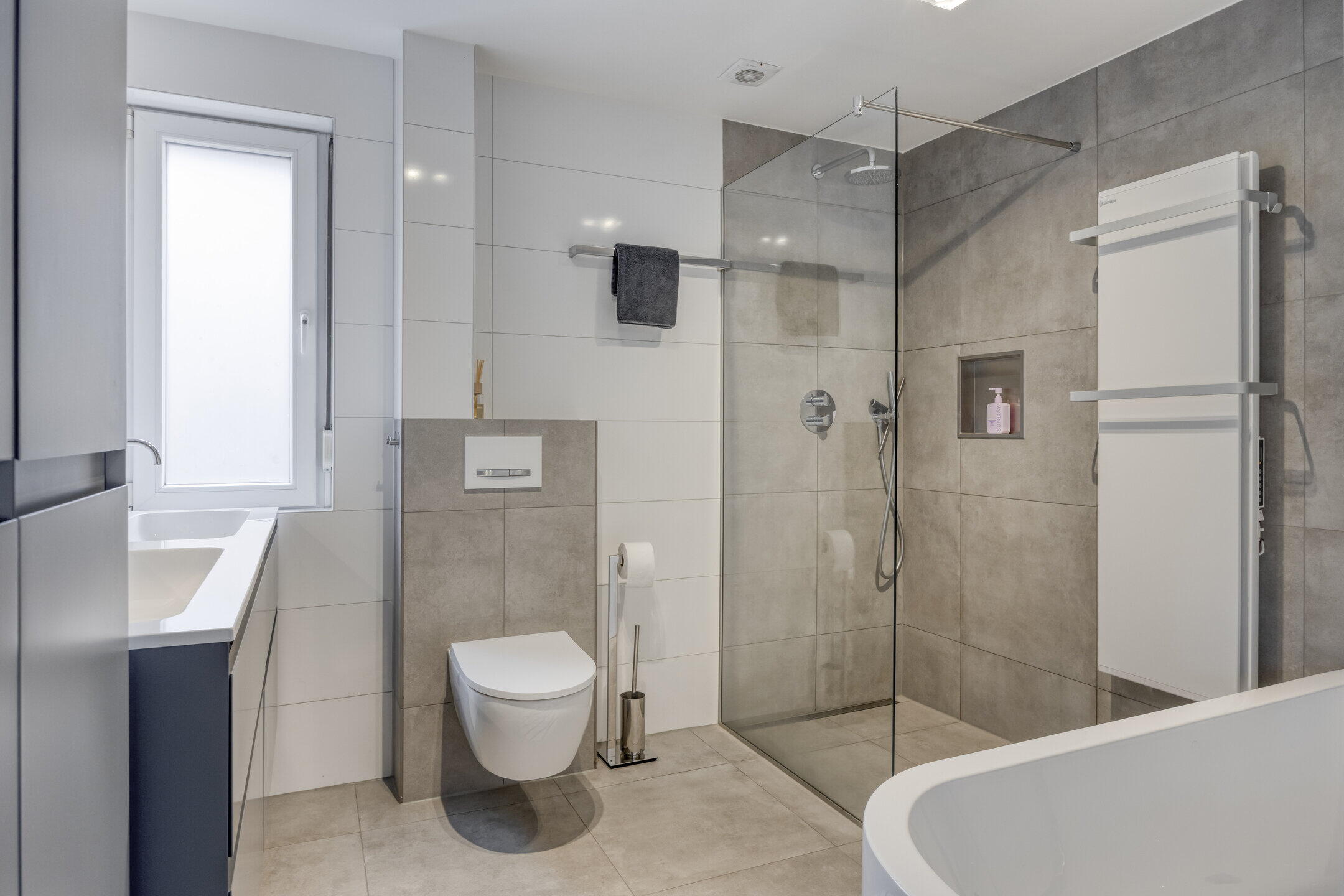Moderne complete badkamer (2.9 m x 2.4 m), volledig vernieuwd in 2024, v.v. elektrische vloervloerverwarming, elektrische radiator, heerlijk ligbad, ruime inloopdouche, wastafelmeubel met dubbele wastafel, tweede toilet, mechanische ventilatie en draaikiep raam. De grote ronde spiegel is ook voorzien van verwarming en verlichting rondom.