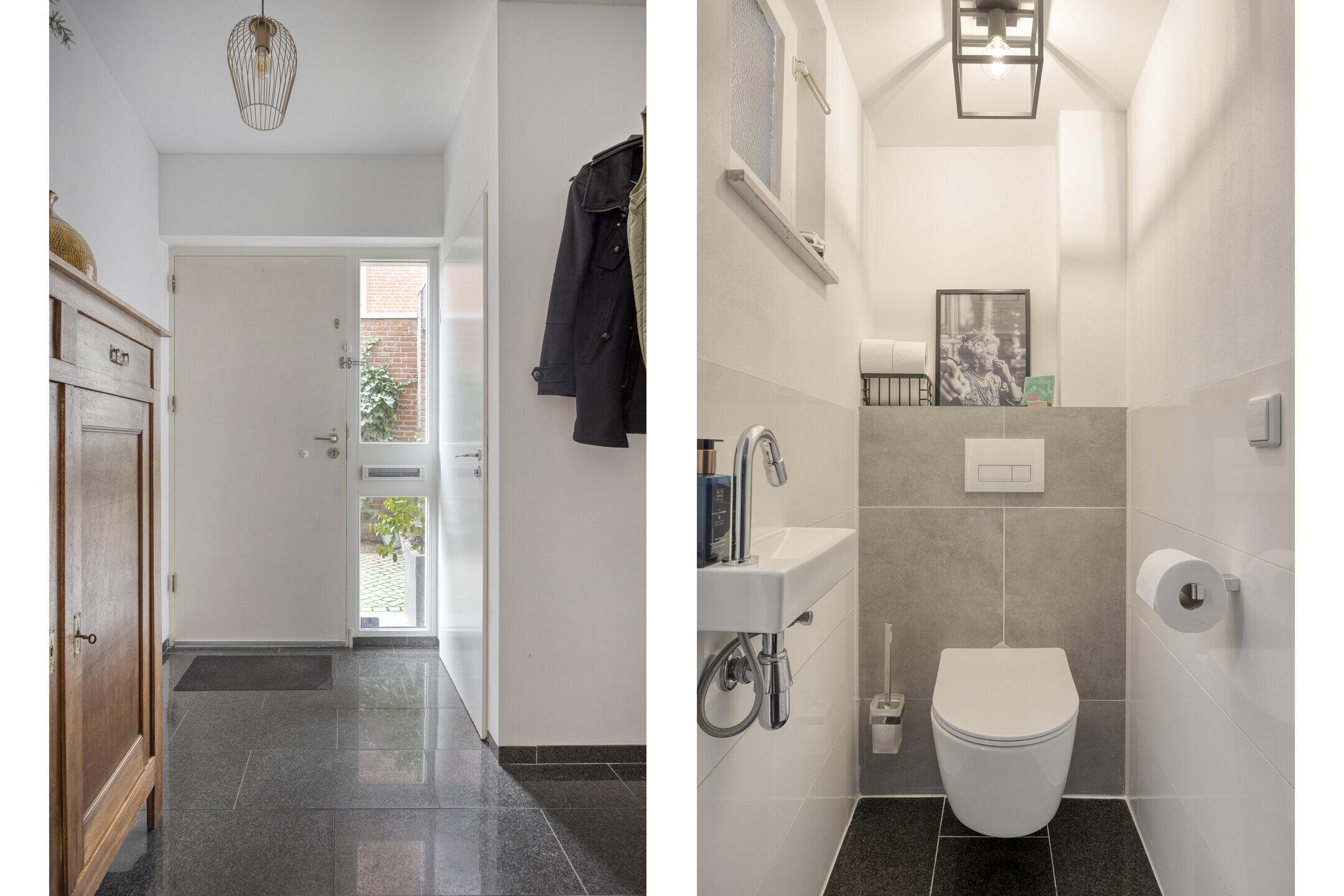 Hal met garderobe, modern toilet met fonteintje (2024) met raampje en de meterkast.