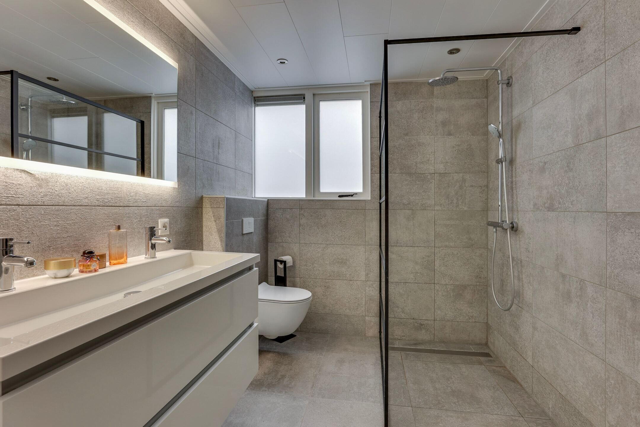 - Dubbele wastafel, inloopdouche, toilet, en wastafelmeubel