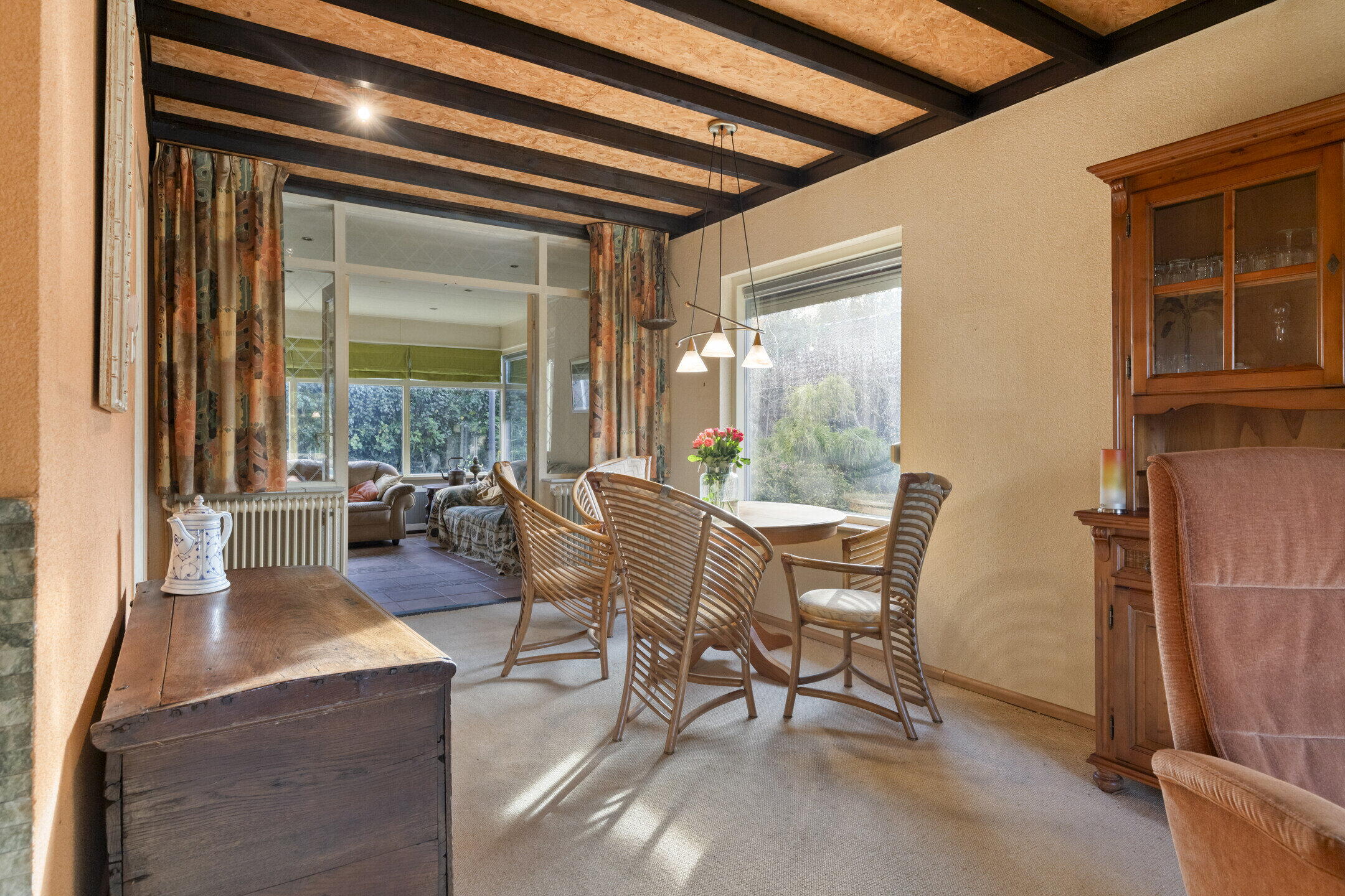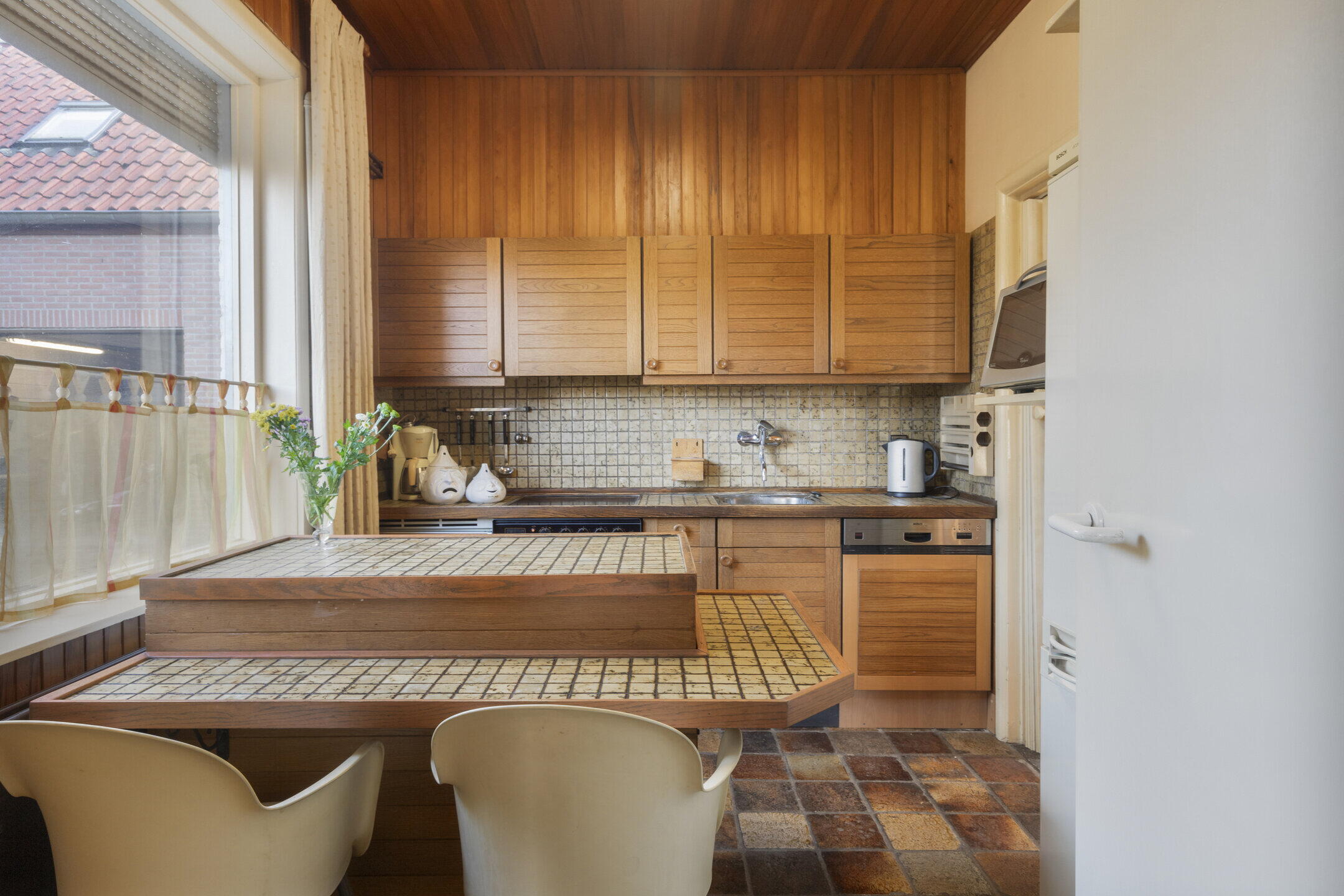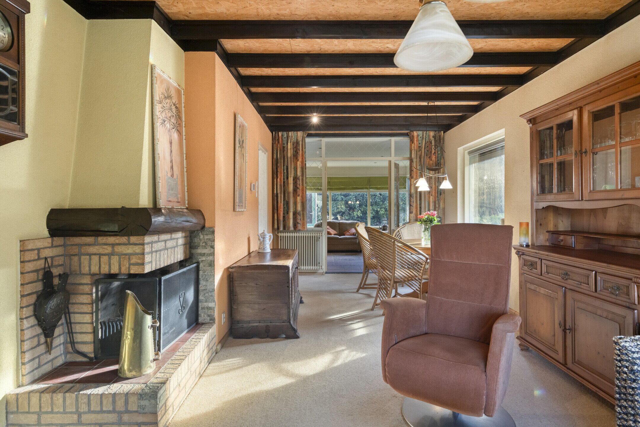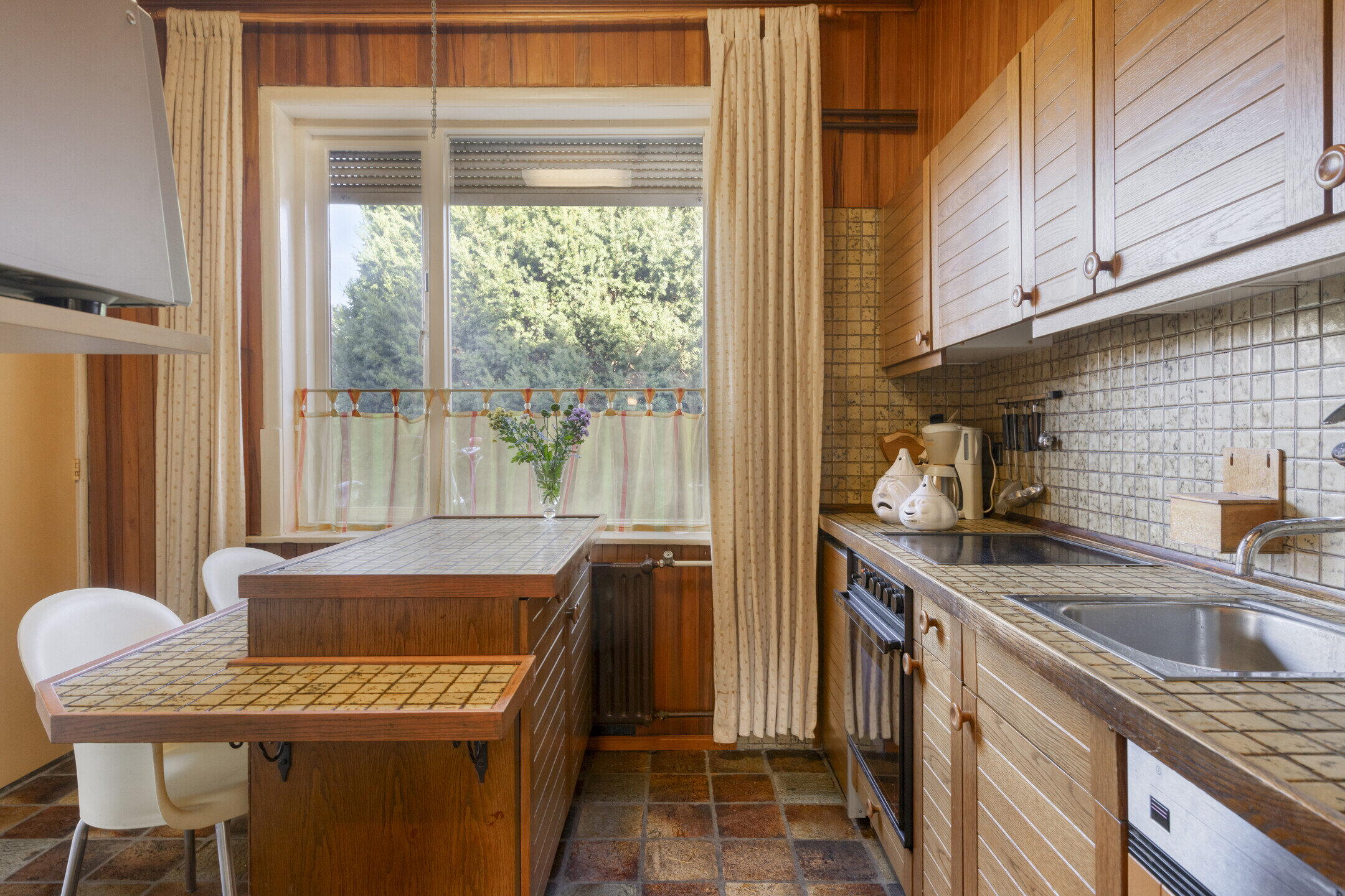 De woonkamer is ruim opgezet en wordt prachtig verlicht door ramen aan de voor- en zijkant van de woning. Aansluitend vind je een royale serre met grote raampartijen: perfect als extra zithoek, werkruimte of hobbykamer. Een echte eyecatcher is de authentieke haard in de woonkamer, die direct sfeer en karakter toevoegt. De keuken bevindt zich in een afgesloten ruimte en is bereikbaar via de hal. Met houten kastjes en authentieke details heeft de keuken een warme uitstraling. Dankzij het raam aan de zijkant is ook hier veel natuurlijk licht. De keuken is voorzien van een kookplaat, oven en vaatwasser, en biedt volop mogelijkheden om naar eigen smaak te moderniseren.
