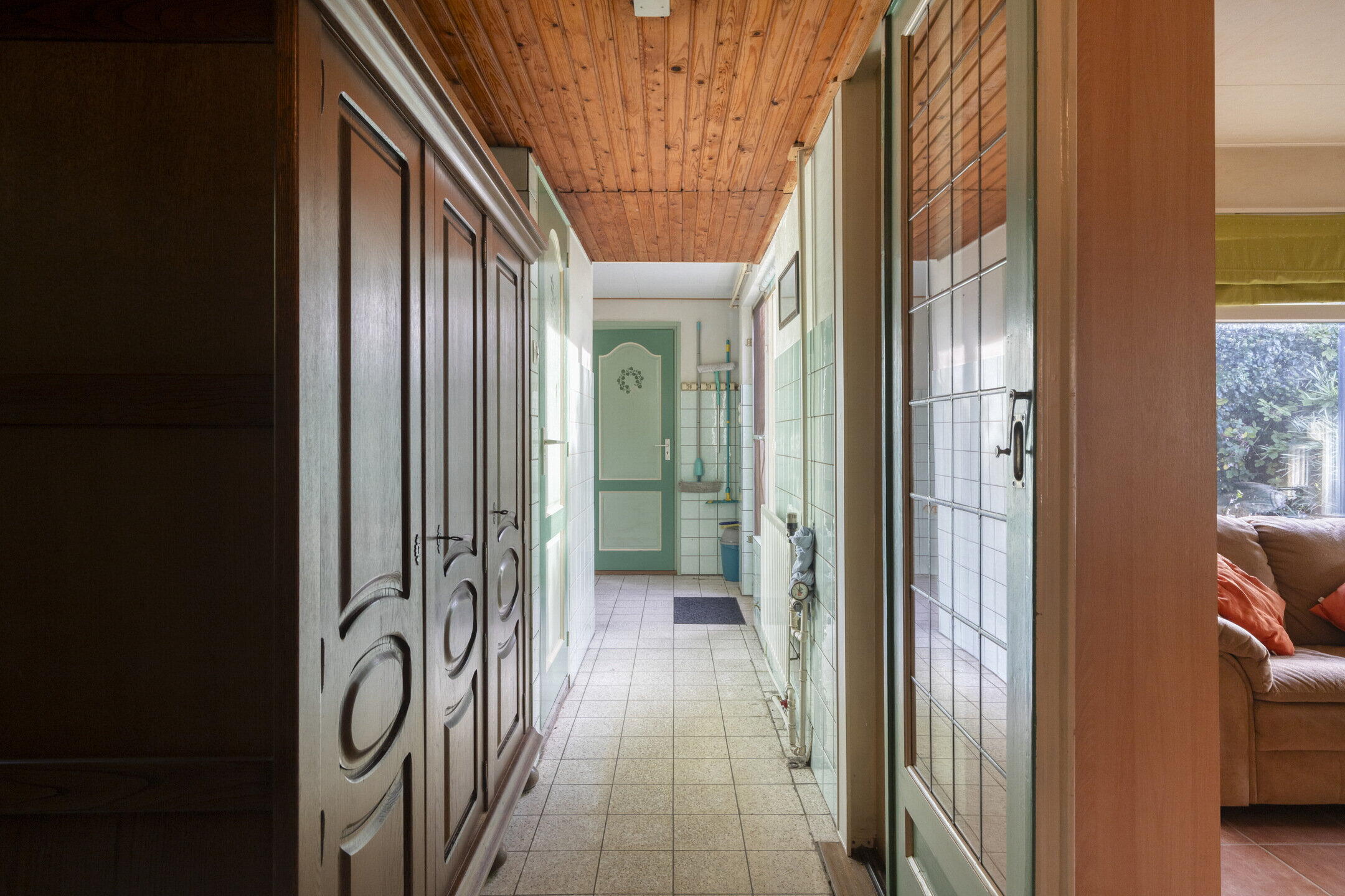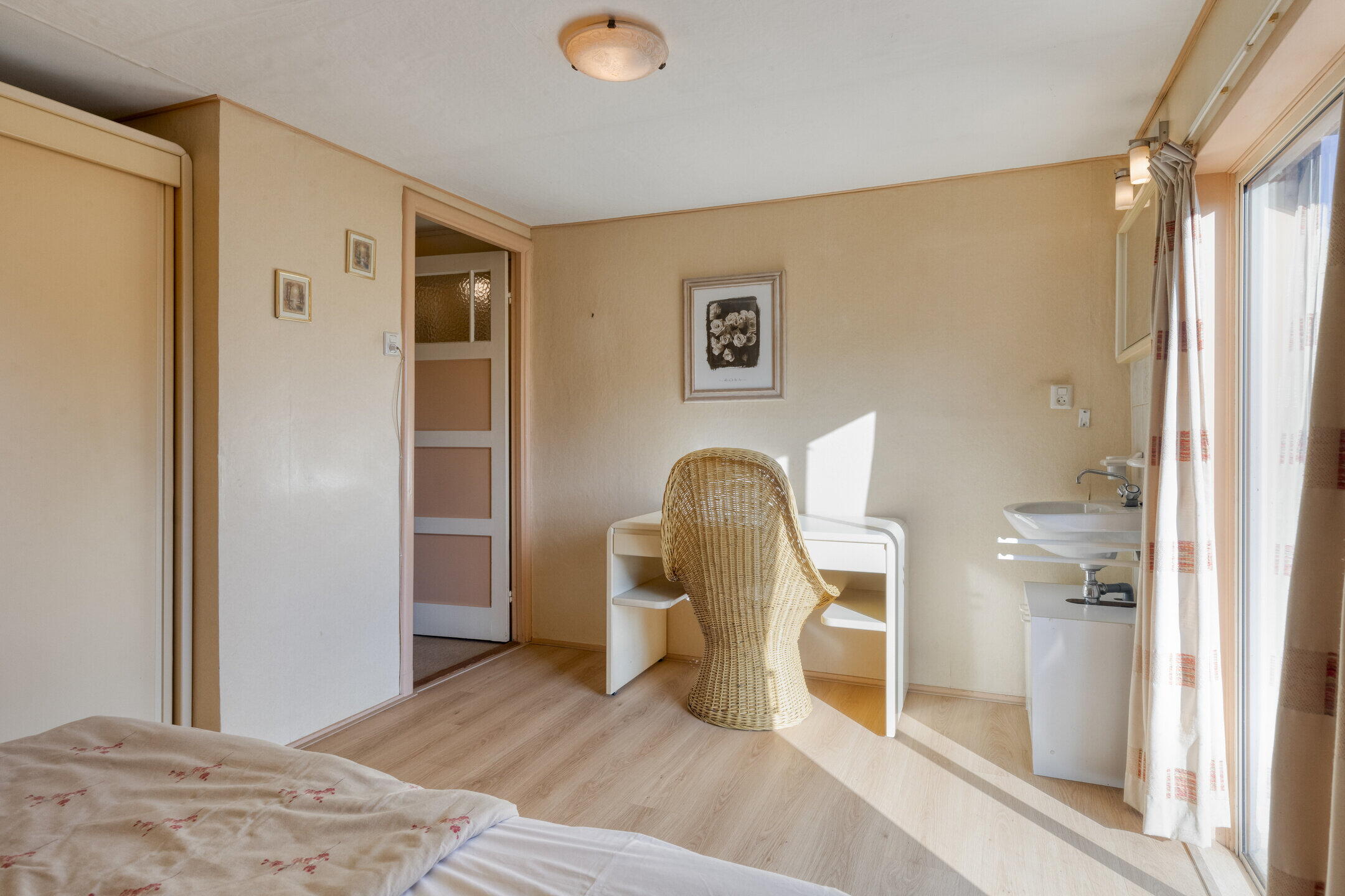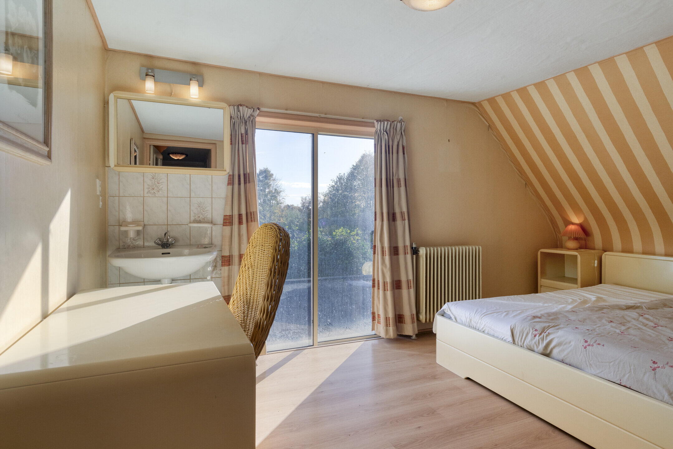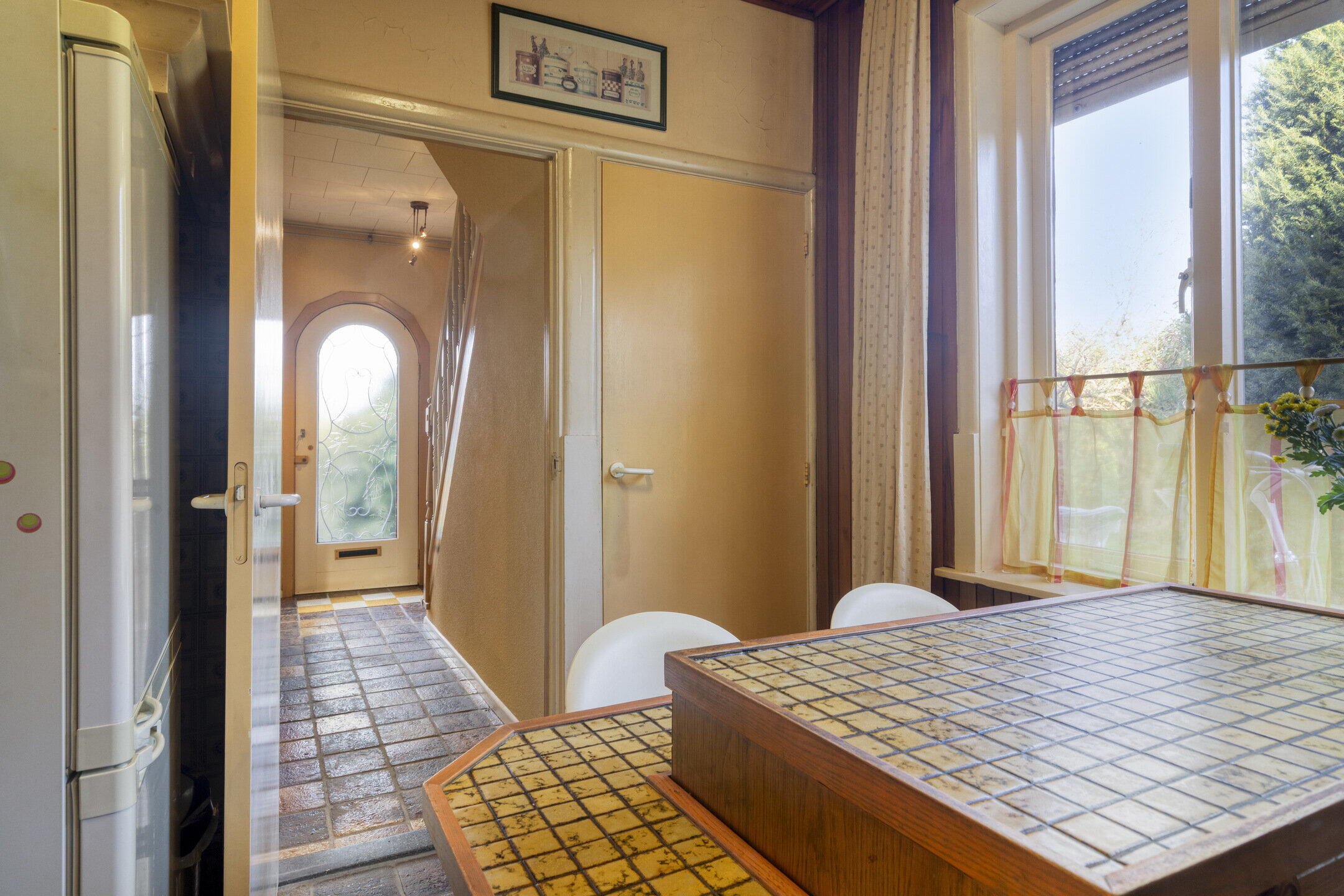 De woonkamer is ruim opgezet en wordt prachtig verlicht door ramen aan de voor- en zijkant van de woning. Aansluitend vind je een royale serre met grote raampartijen: perfect als extra zithoek, werkruimte of hobbykamer. Een echte eyecatcher is de authentieke haard in de woonkamer, die direct sfeer en karakter toevoegt. De keuken bevindt zich in een afgesloten ruimte en is bereikbaar via de hal. Met houten kastjes en authentieke details heeft de keuken een warme uitstraling. Dankzij het raam aan de zijkant is ook hier veel natuurlijk licht. De keuken is voorzien van een kookplaat, oven en vaatwasser, en biedt volop mogelijkheden om naar eigen smaak te moderniseren.