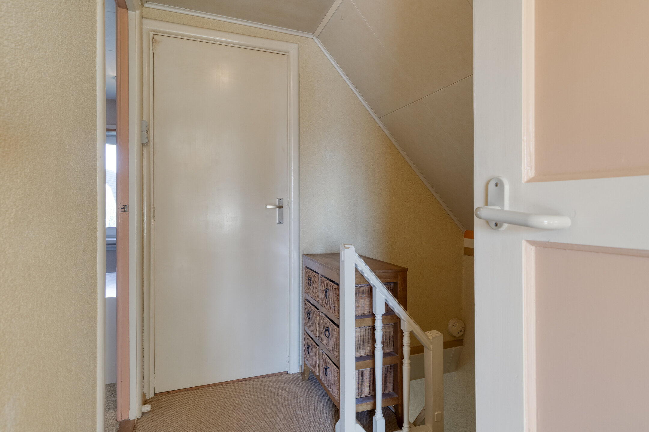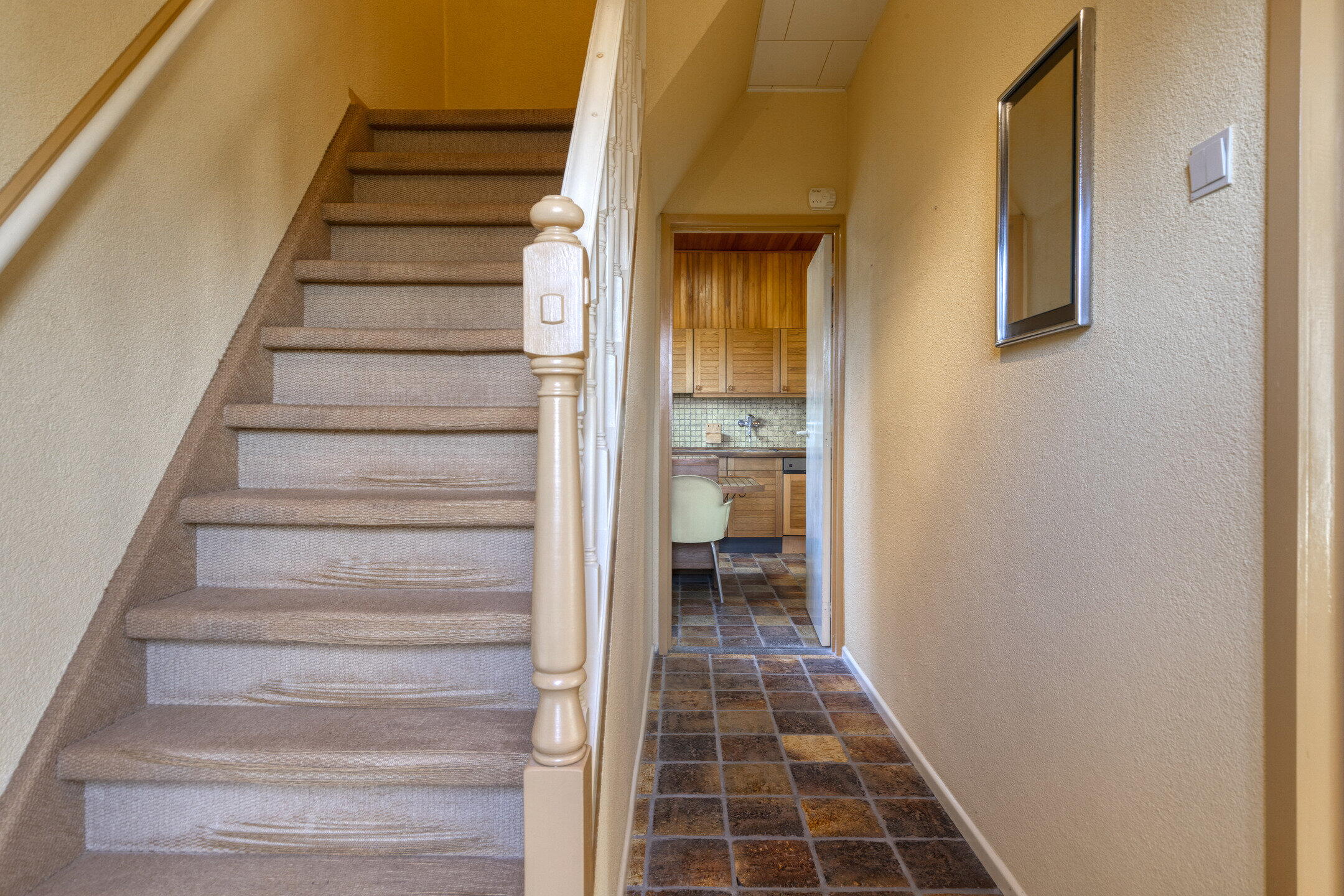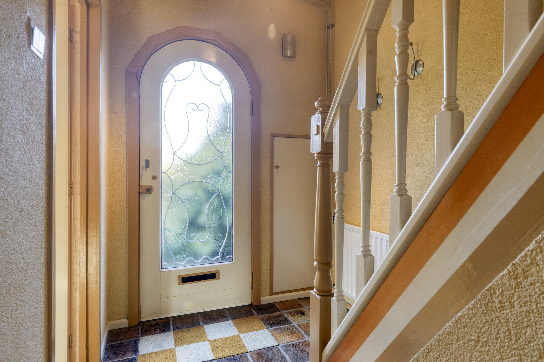Na het parkeren van de auto op je eigen oprit stap je binnen in de lichte en uitnodigende entree van de woning. De hal voelt ruim aan en vormt het centrale punt van het huis, met directe toegang tot de woonkamer, de afgesloten keuken en de trap naar de eerste verdieping.