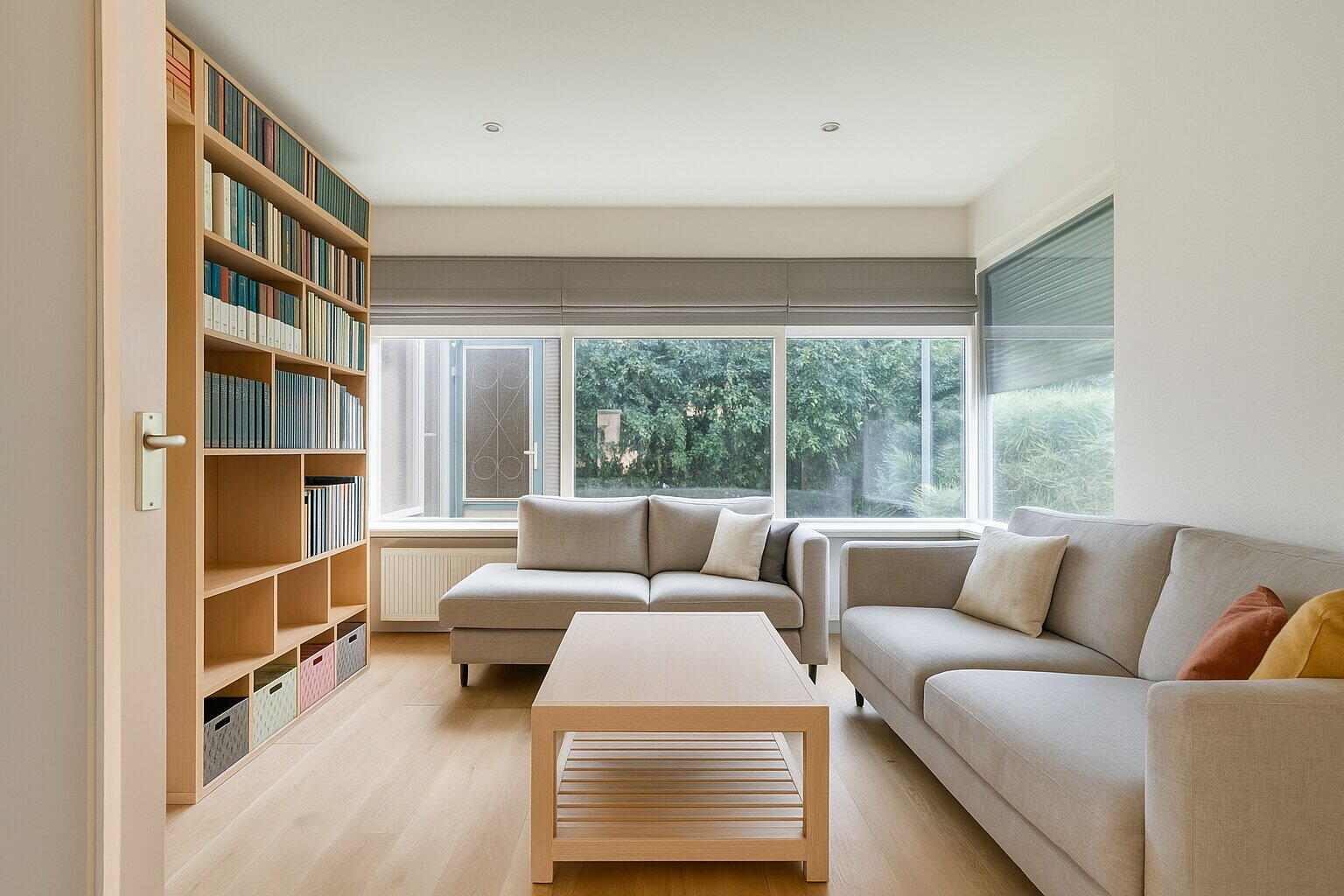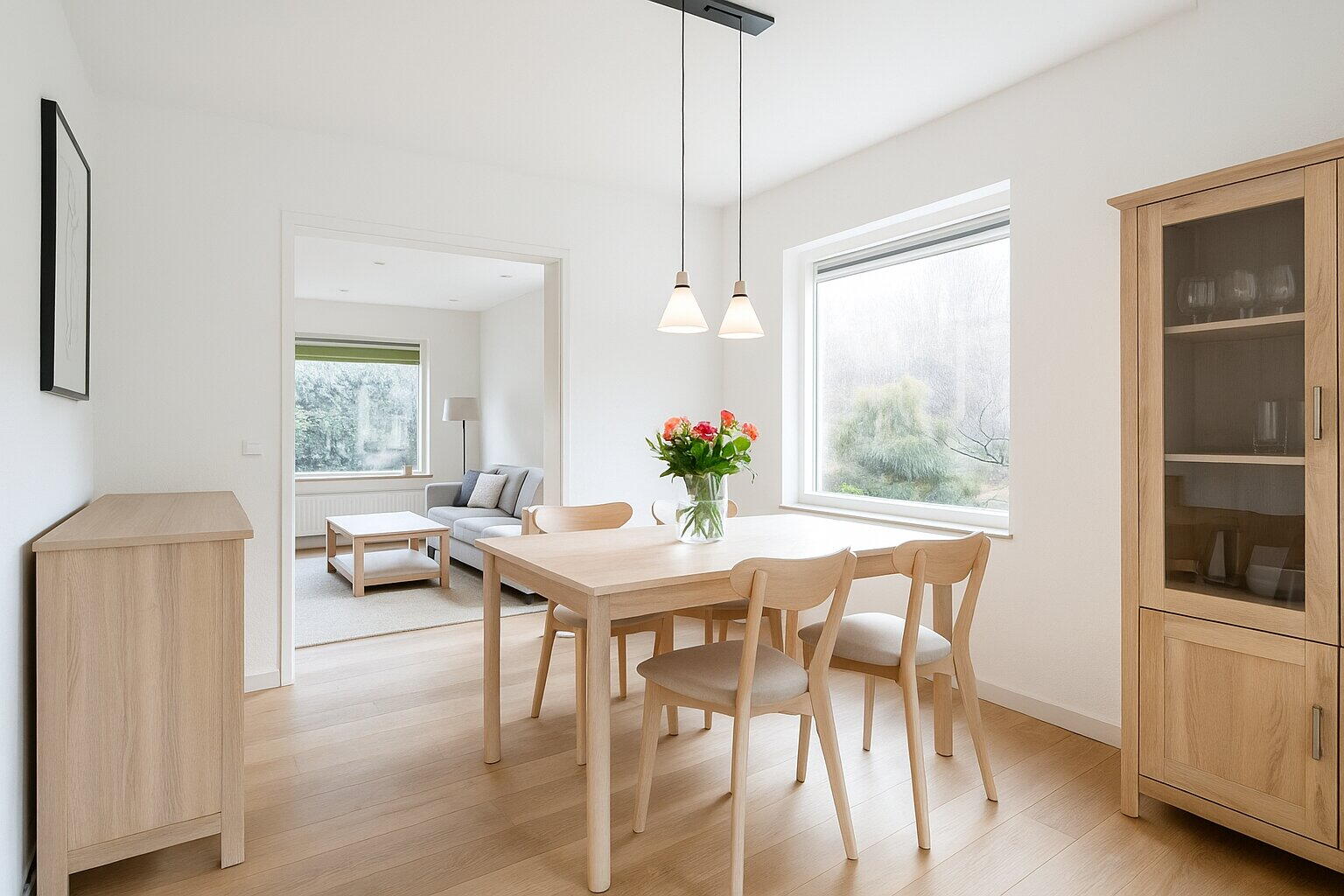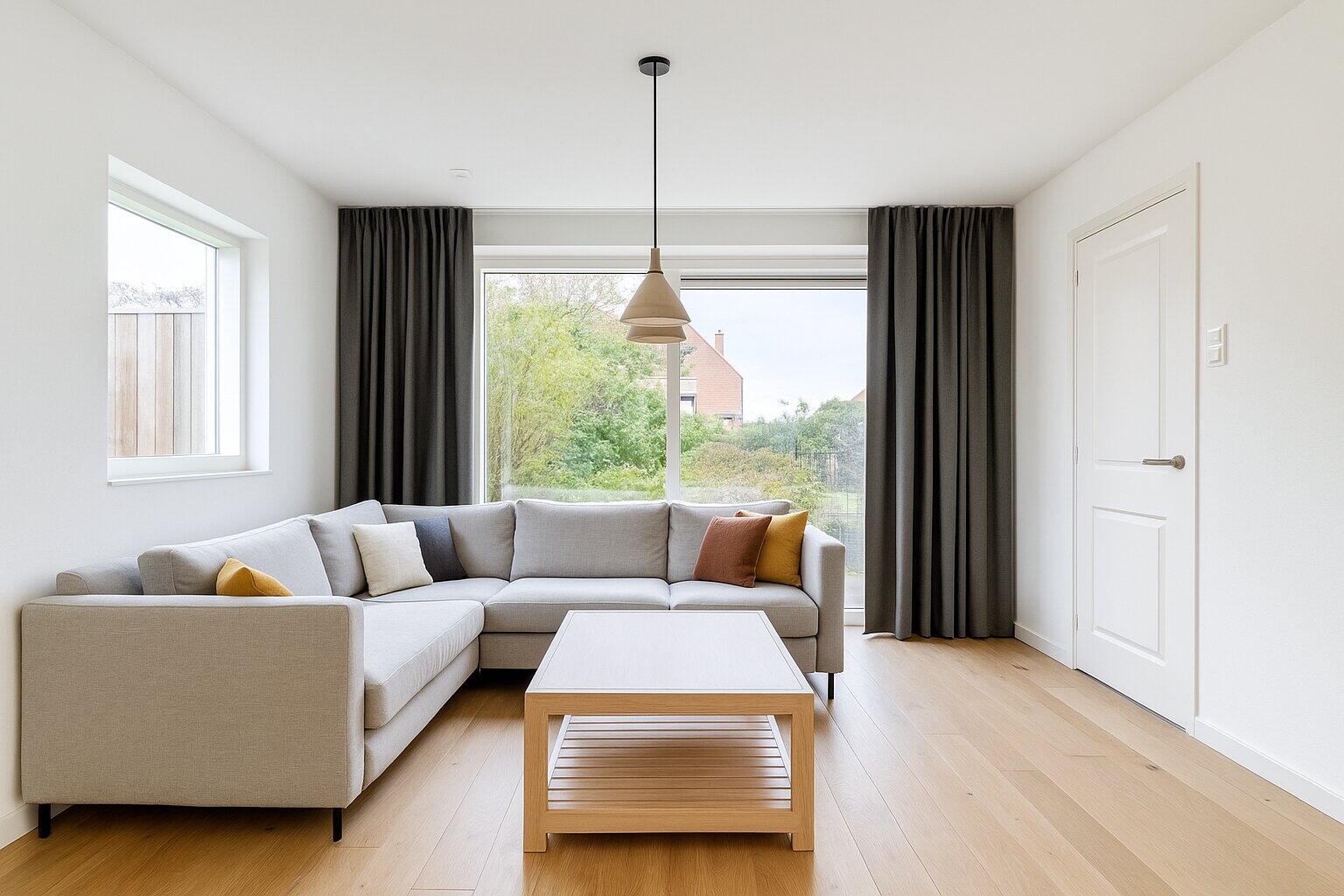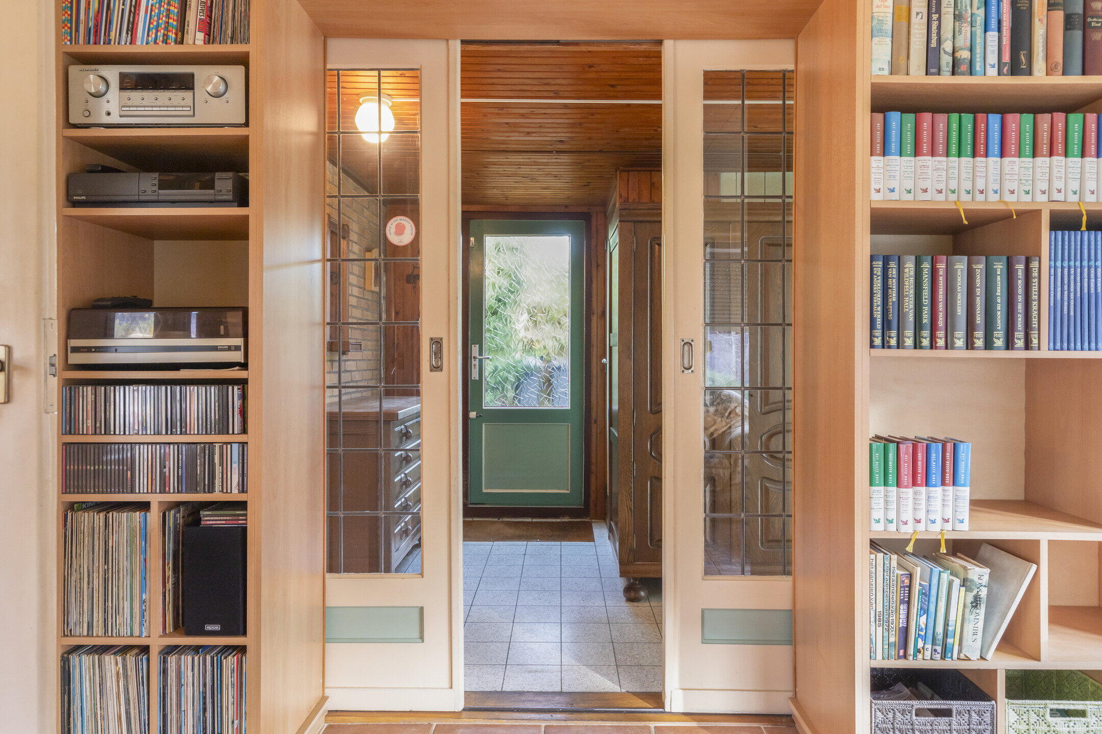 Na het parkeren van de auto op je eigen oprit stap je binnen in de lichte en uitnodigende entree van de woning. De hal voelt ruim aan en vormt het centrale punt van het huis, met directe toegang tot de woonkamer, de afgesloten keuken en de trap naar de eerste verdieping.
