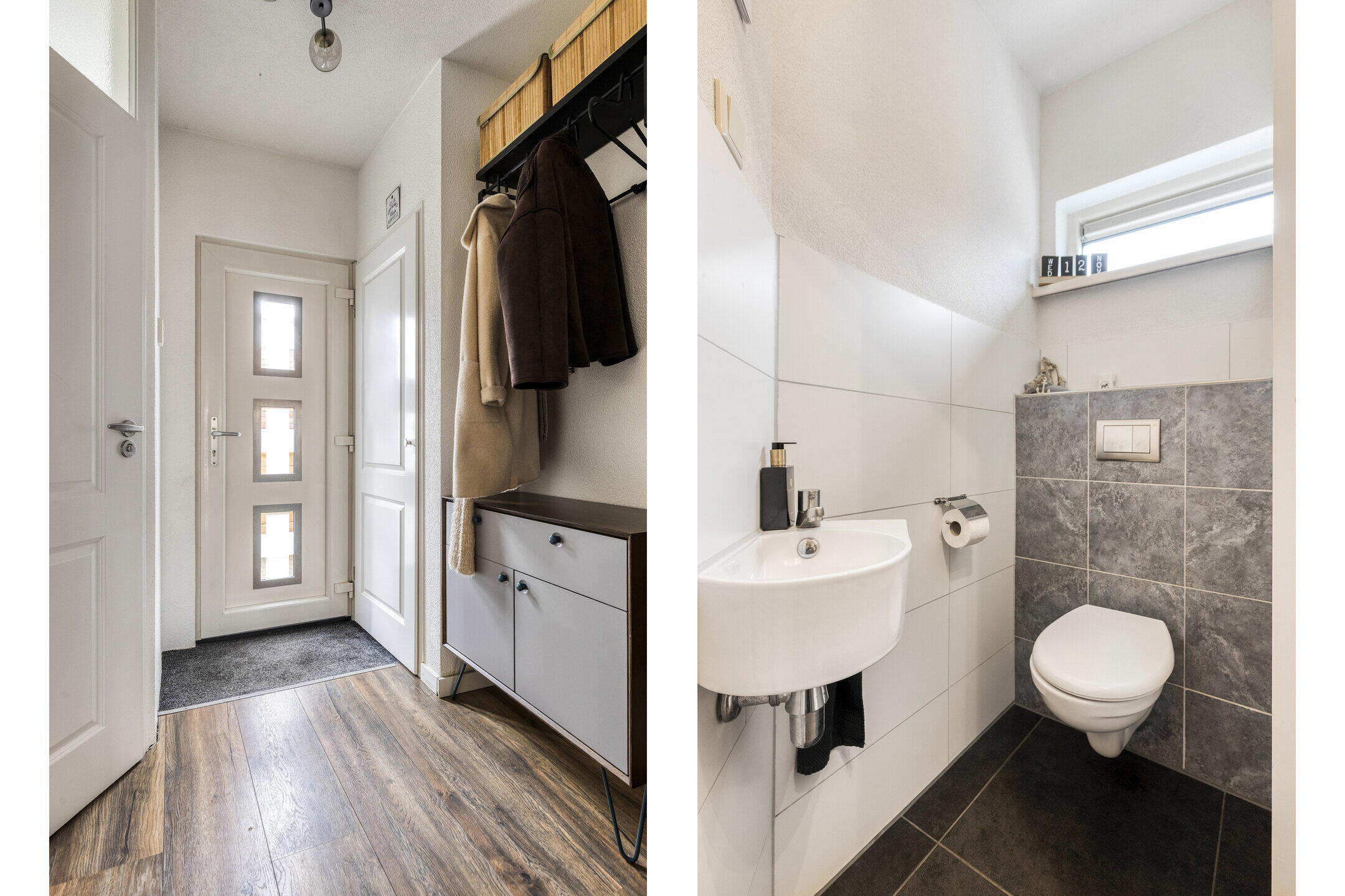 Je komt binnen in de ruime, verzorgde hal met een apart toilet. Alles is netjes afgewerkt en geeft meteen een warme en verzorgde eerste indruk – een welkom gevoel!