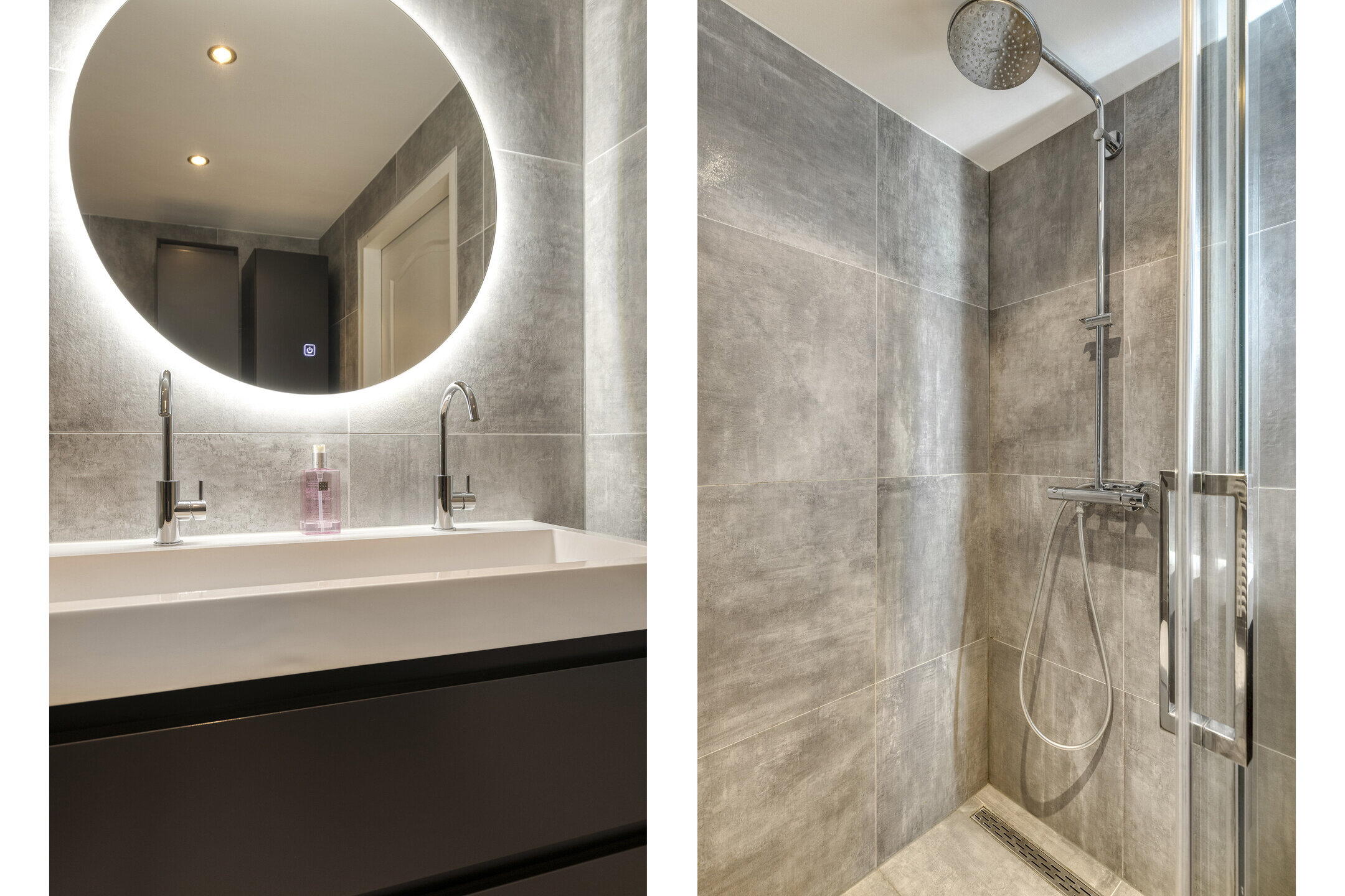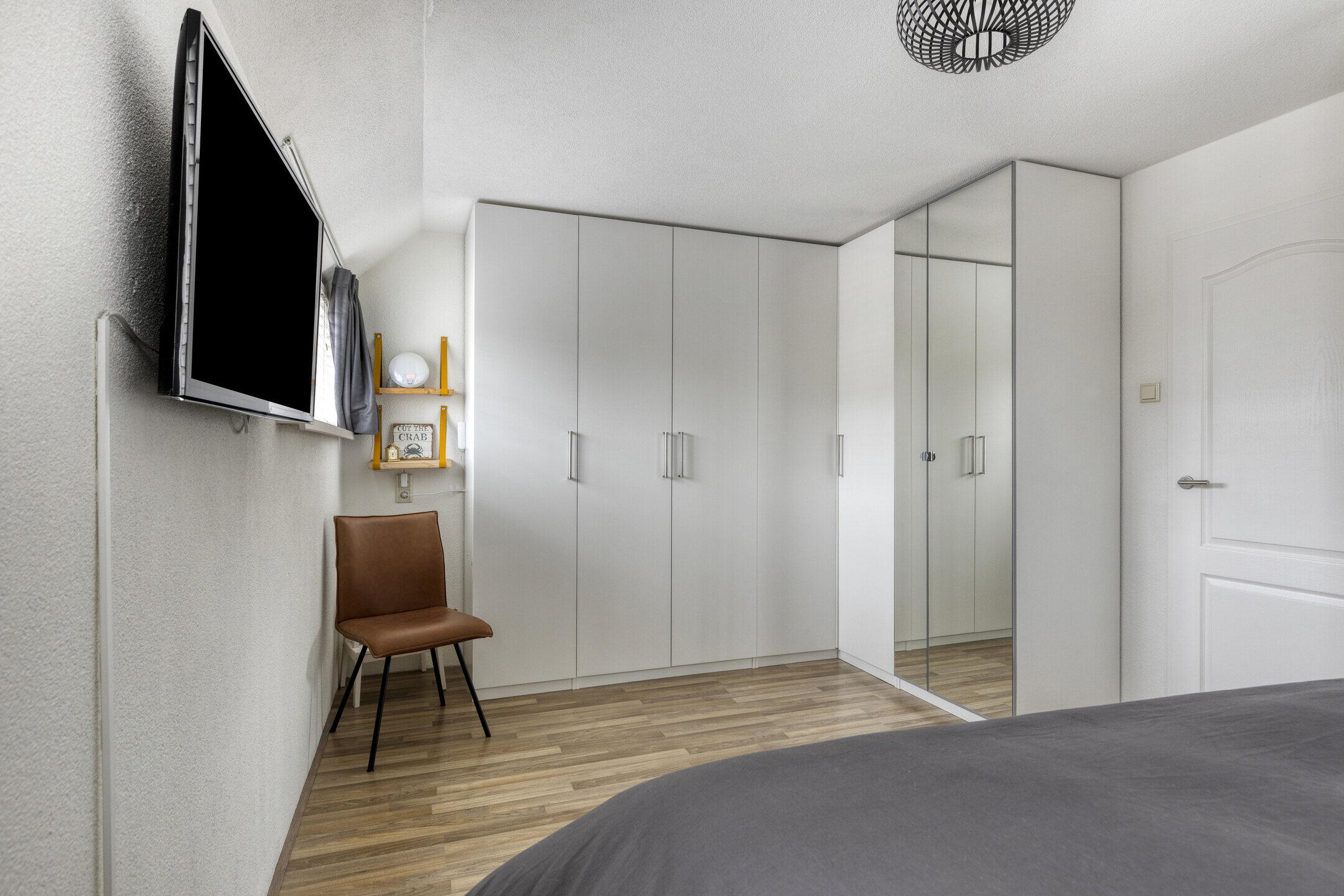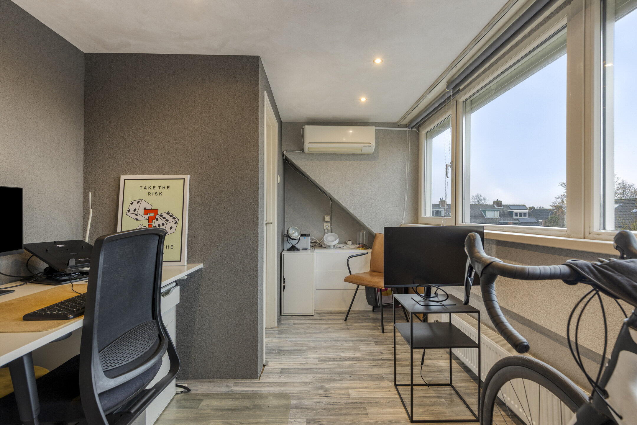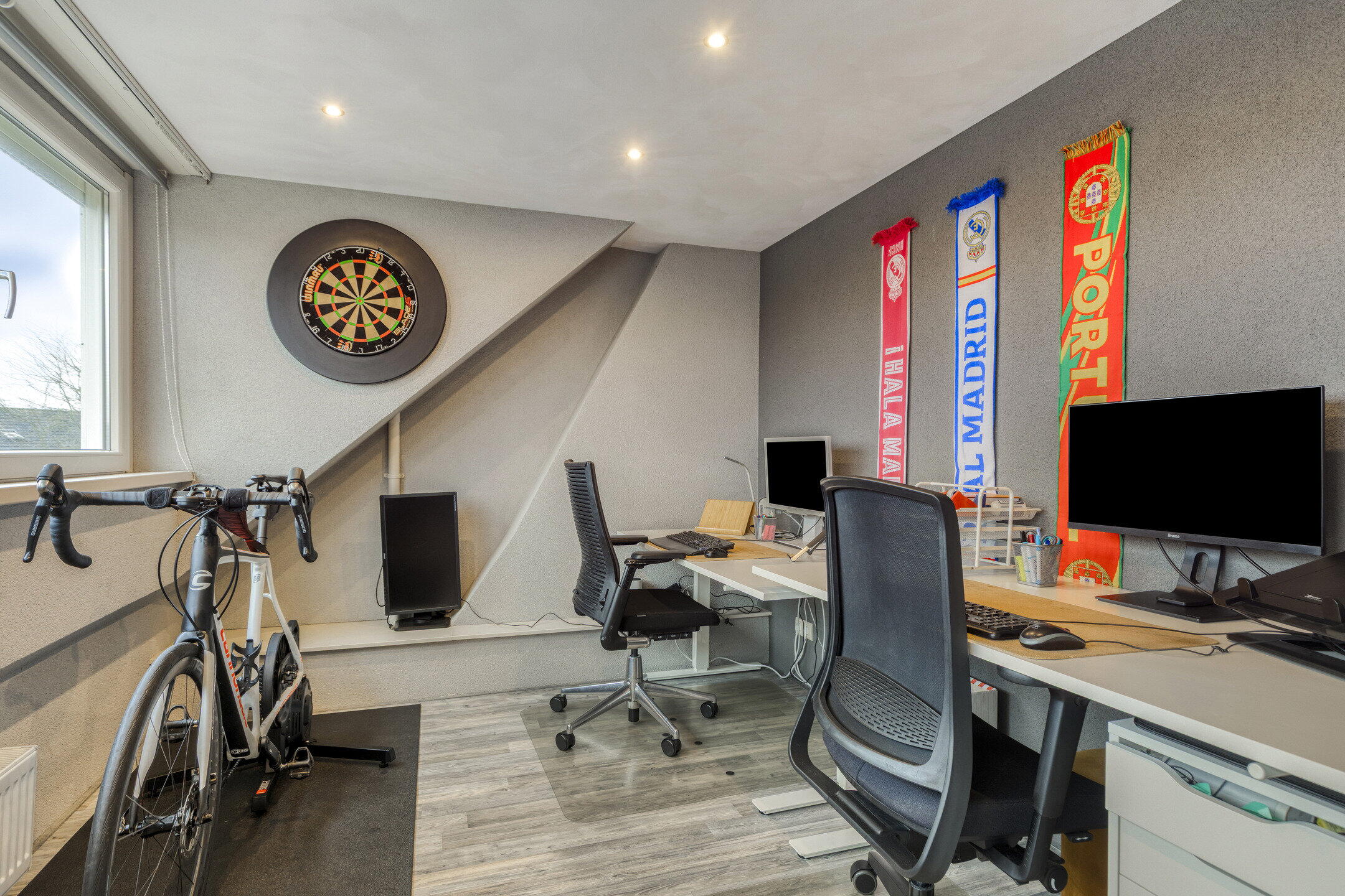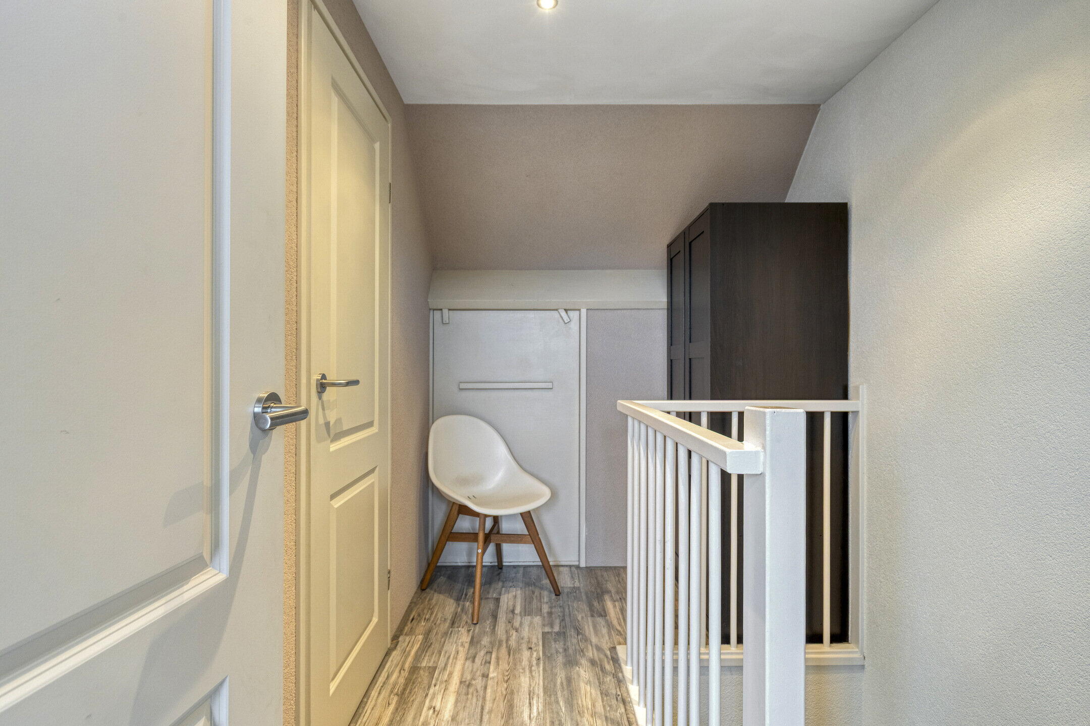 Op de eerste verdieping bevinden zich drie ruime slaapkamers, allemaal voorzien van veel lichtinval en keurig afgewerkt. De badkamer is modern en stijlvol met grijze tegels, een strak donkergrijs wastafelmeubel, een ruime inloopdouche en een tweede toilet – van alle gemakken voorzien. De tweede verdieping biedt nog een grote kamer, momenteel in gebruik als thuiskantoor. Deze ruimte is ook uitstekend geschikt als vierde slaapkamer en heeft veel lichtinval dankzij het grote dakraam. Daarnaast vind je hier een praktische wasruimte en extra opbergmogelijkheden.