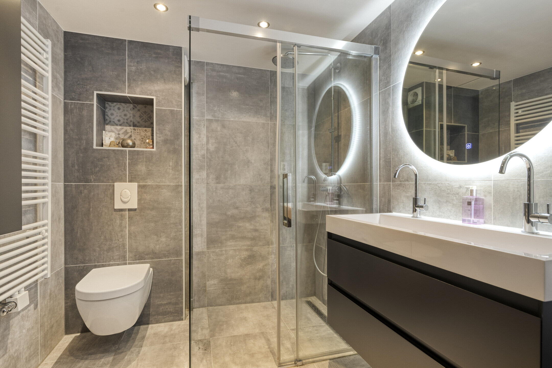 - Toilet, dubbele wastafel, wastafelmeubel, inloopdouche