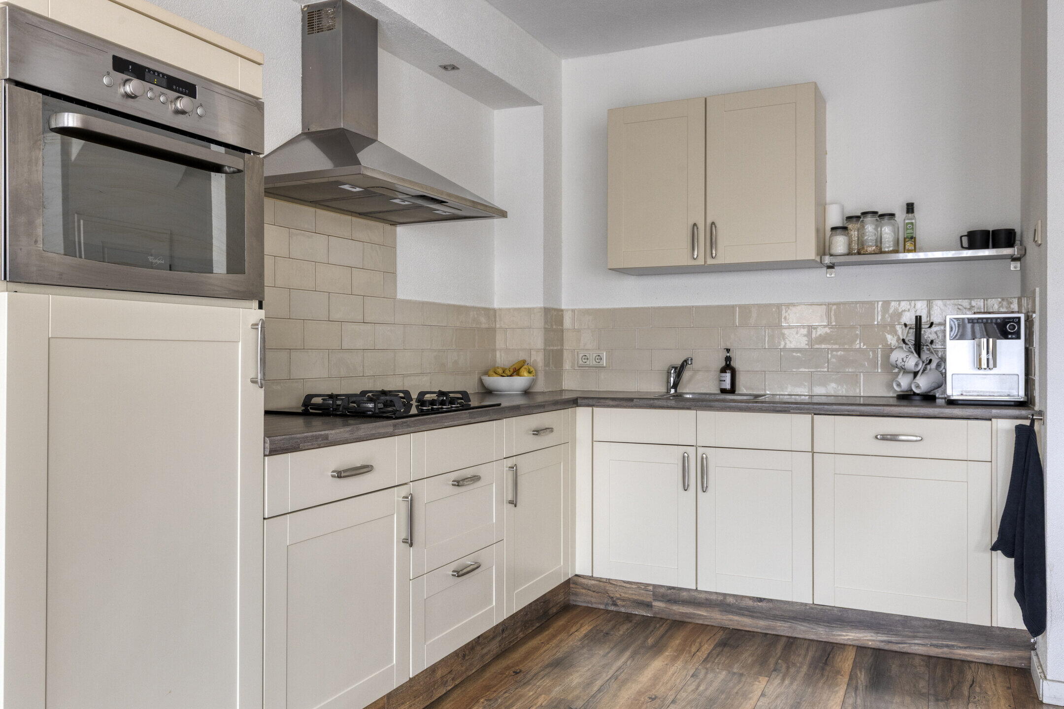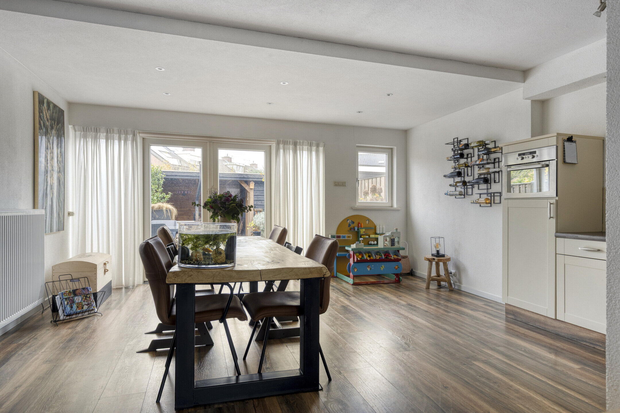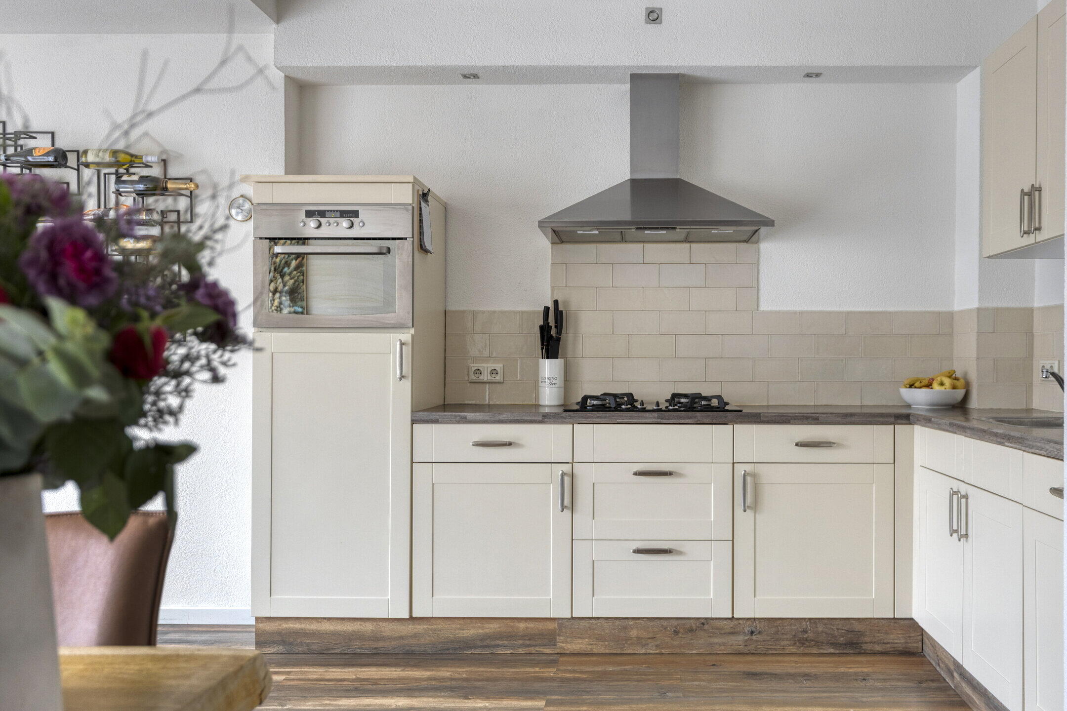 De woonkamer is een zee van ruimte met een grote zithoek aan de rechterzijde, perfect voor een flinke bank en gezellige tv-avonden. Dankzij het grote raam stroomt het daglicht rijkelijk naar binnen. De woonkamer loopt naadloos over in de eetkamer, maar de twee ruimtes voelen toch als aparte plekken – ideaal voor zowel ontspanning als gezellig tafelen. Via de openslaande deuren stap je zo de tuin in. De keuken is netjes en modern, uitgevoerd in een off-white kleur met een donker werkblad en voorzien van inbouwapparatuur. Het is een halfopen keuken, die voelt als een eigen plek in huis – heerlijk om in te koken én in te leven.