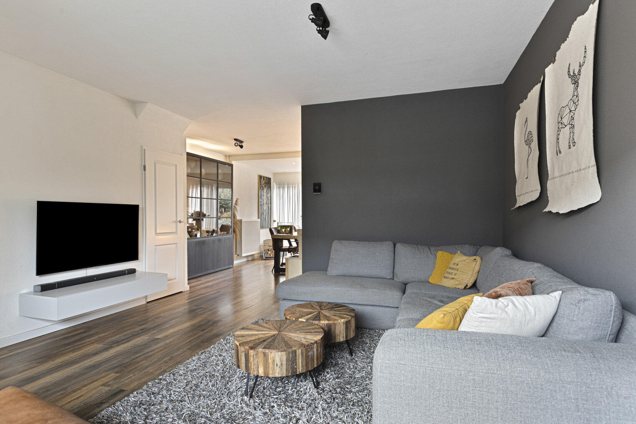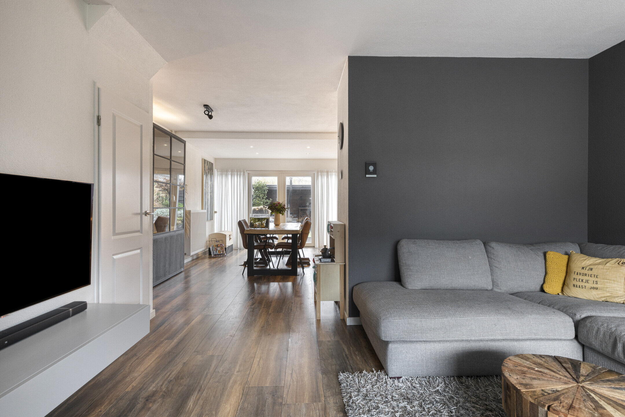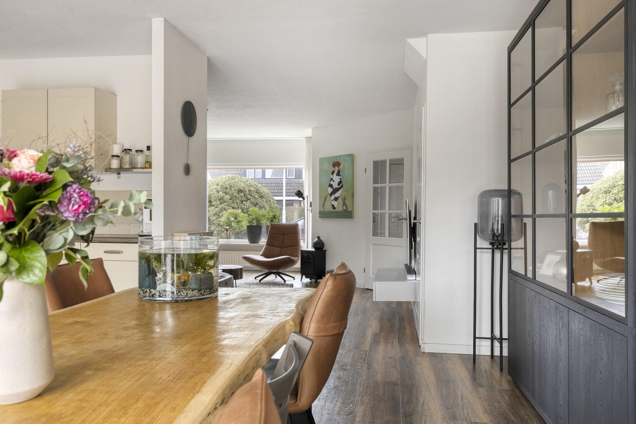 De woonkamer is een zee van ruimte met een grote zithoek aan de rechterzijde, perfect voor een flinke bank en gezellige tv-avonden. Dankzij het grote raam stroomt het daglicht rijkelijk naar binnen. De woonkamer loopt naadloos over in de eetkamer, maar de twee ruimtes voelen toch als aparte plekken – ideaal voor zowel ontspanning als gezellig tafelen. Via de openslaande deuren stap je zo de tuin in. De keuken is netjes en modern, uitgevoerd in een off-white kleur met een donker werkblad en voorzien van inbouwapparatuur. Het is een halfopen keuken, die voelt als een eigen plek in huis – heerlijk om in te koken én in te leven.