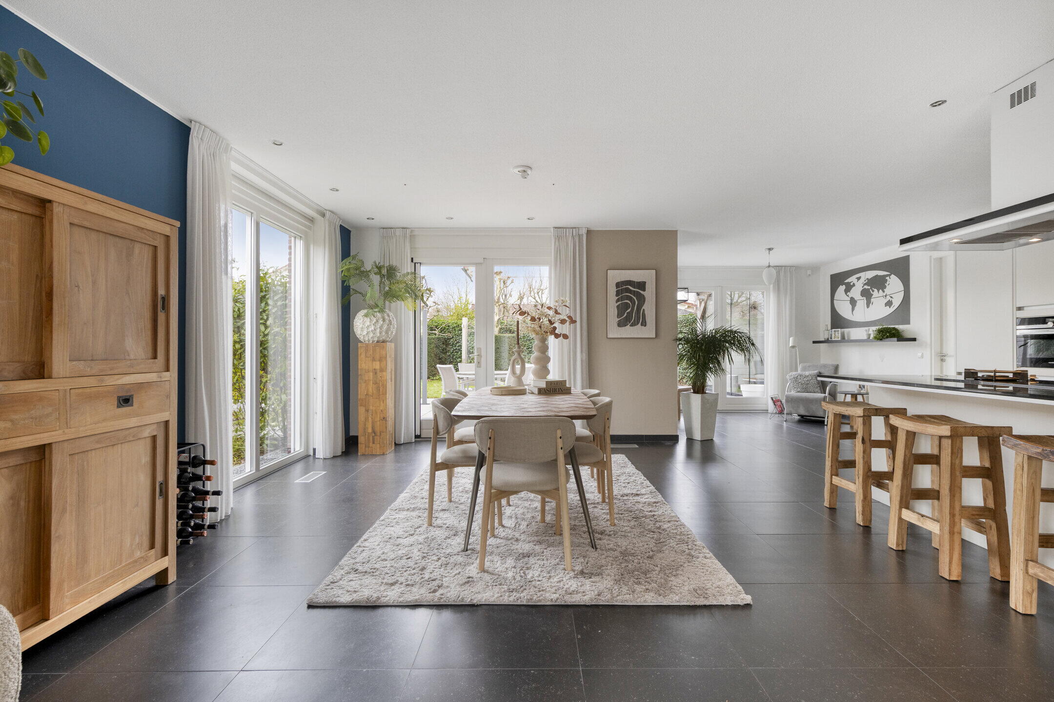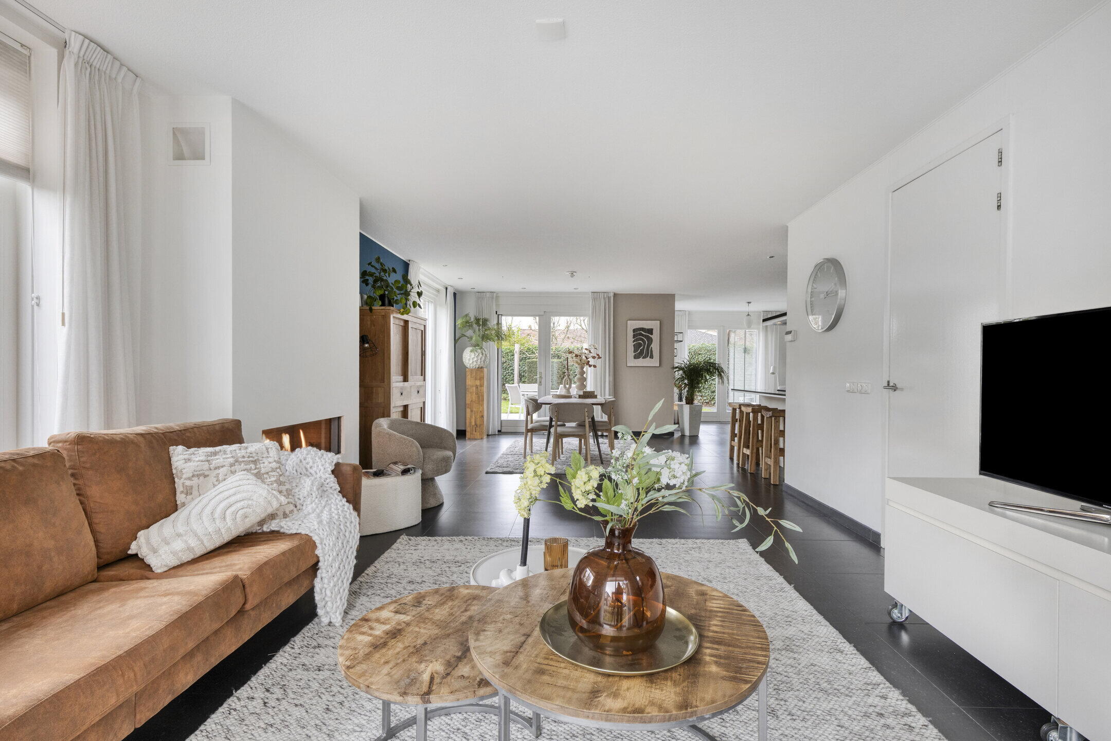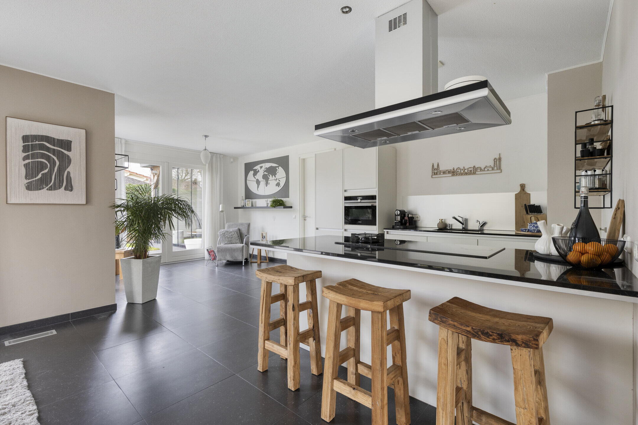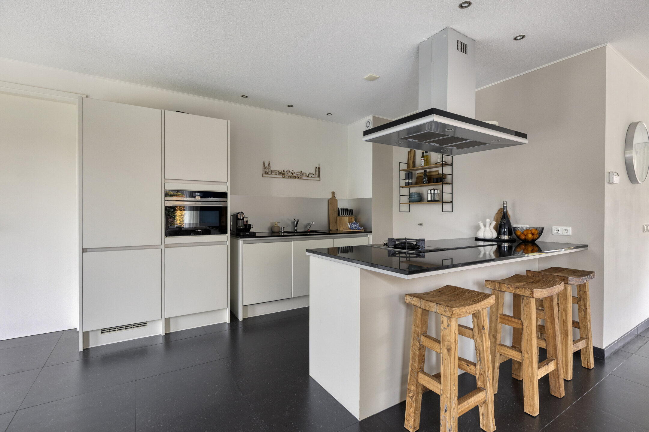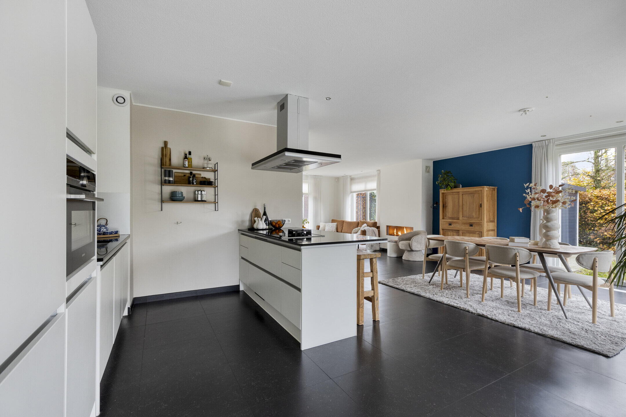 Wat een fijne sfeer! De zithoek met sierhaard geeft direct een huiselijk welkom. De woonkamer is ruim, licht en strak afgewerkt – dankzij de grote raampartijen en openslaande deuren naar de tuin is er een prachtige lichtinval. De open keuken is modern wit uitgevoerd, met een centraal kookeiland dat ook dienstdoet als gezellige zitplek. Perfect voor contact met je gasten tijdens het koken! Aansluitend is er nog een extra leefhoek – ideaal als leesruimte of speelhoek – ook hier zijn openslaande deuren naar buiten.