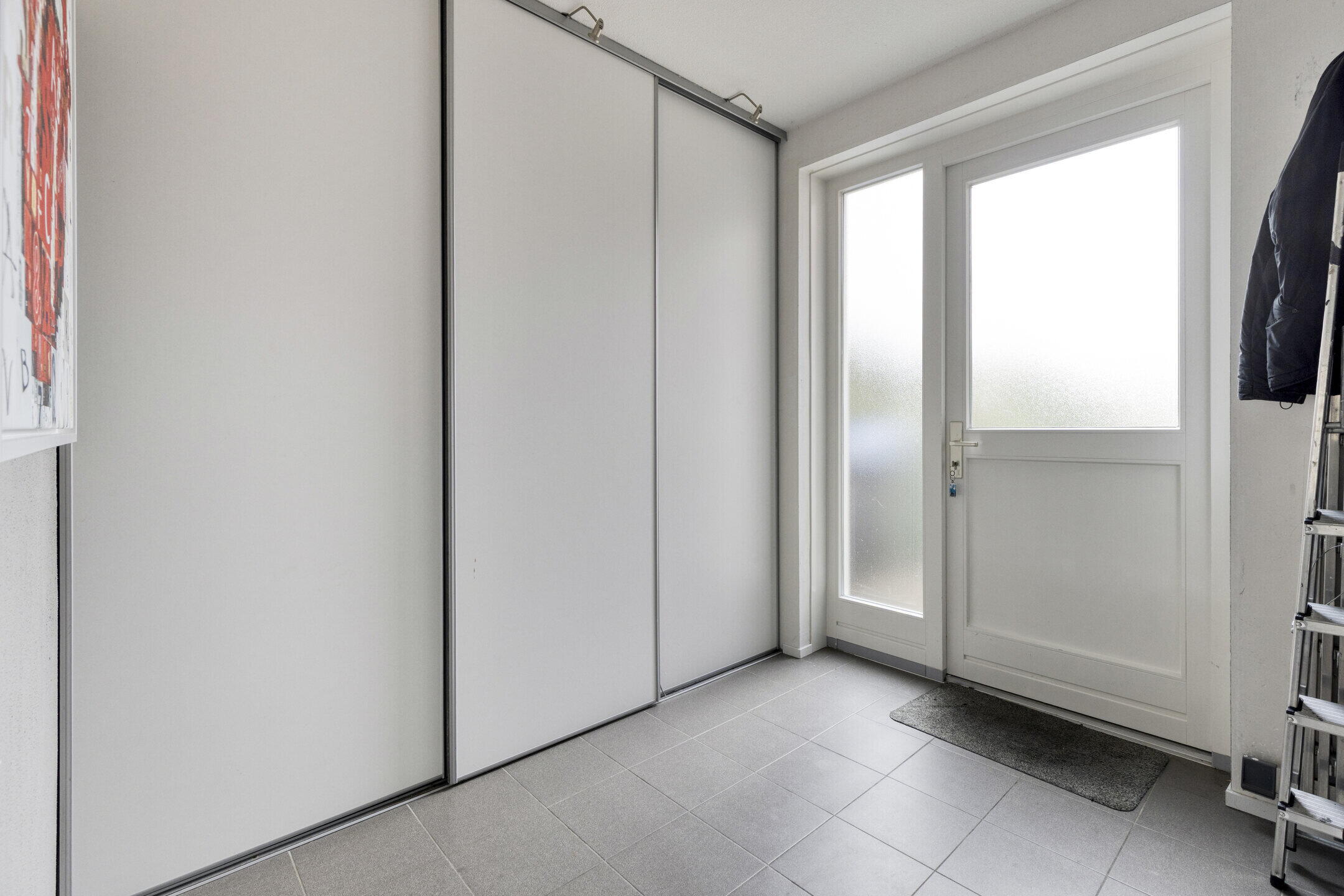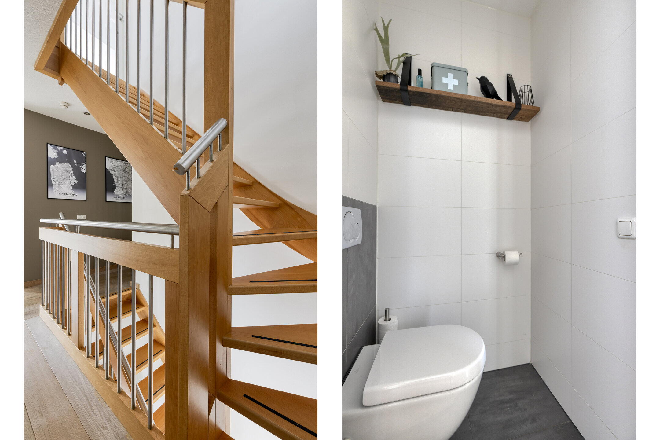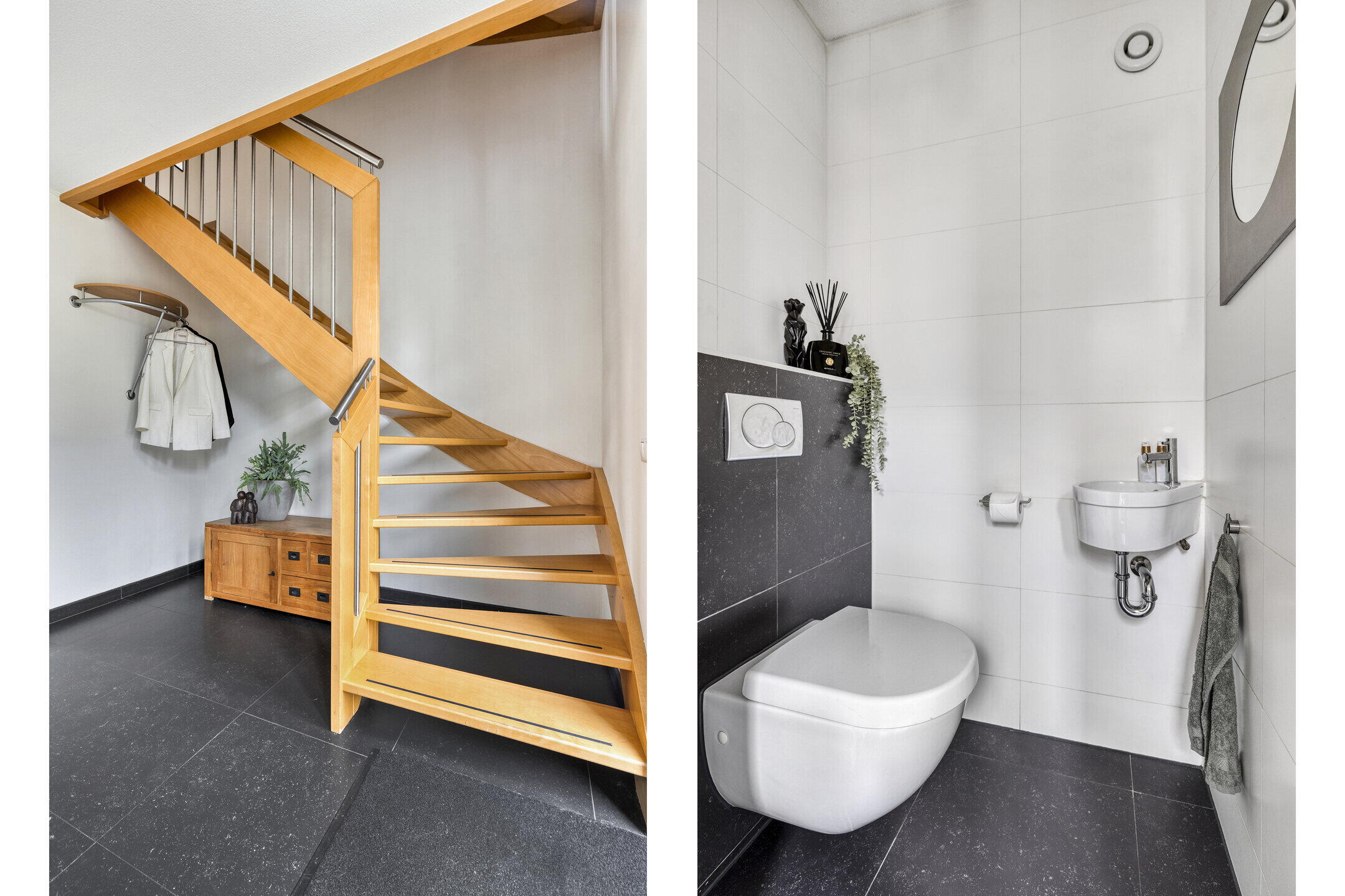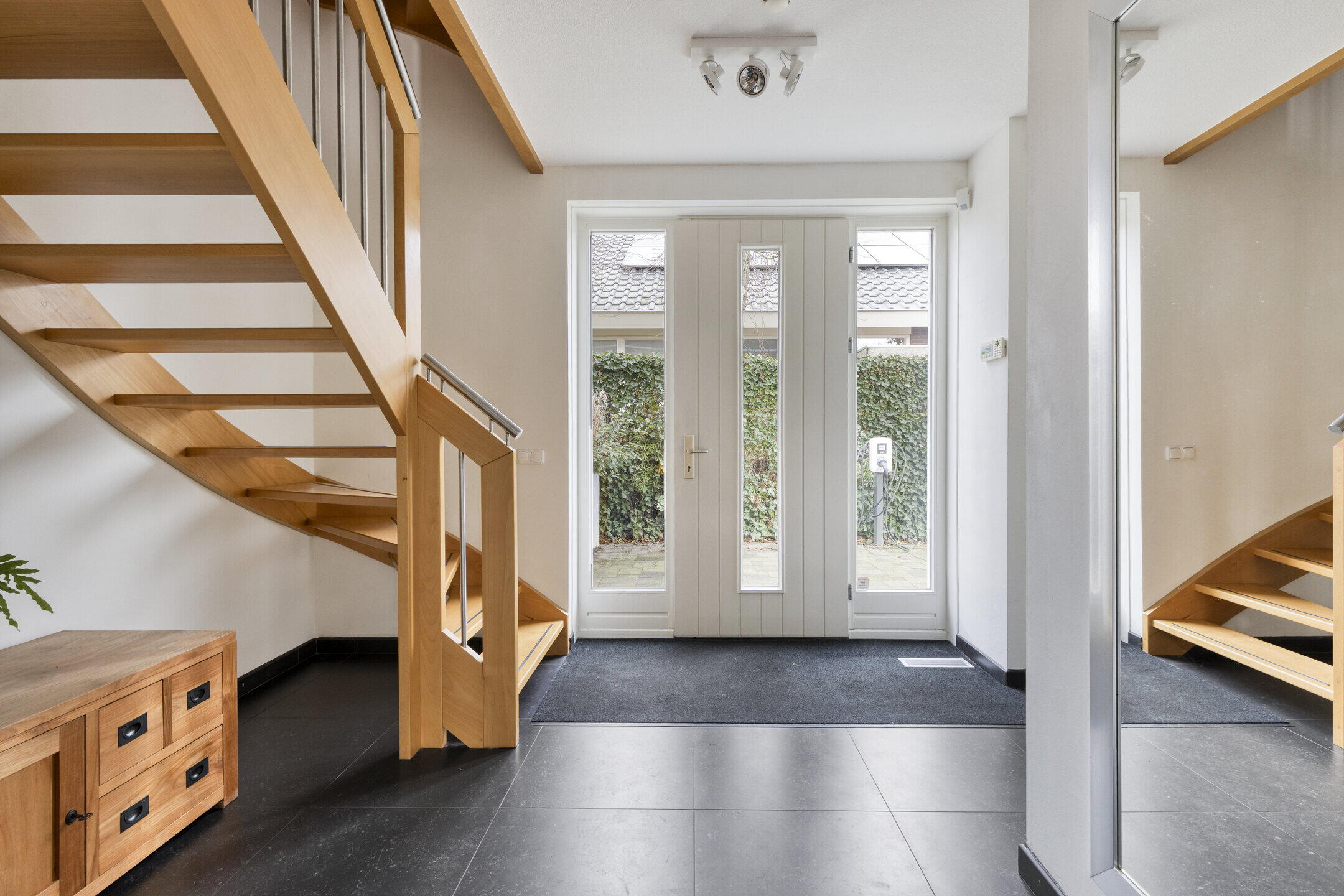 Je komt aan via de royale oprit (voorzien van laadpaal) en wordt meteen welkom geheten door een stijlvolle voordeur met extra raampartijen aan beide zijden. De ruime entree is strak afgewerkt en voorzien van nette plavuizen die doorlopen naar de woonkamer en keuken. Centraal in de hal staat een mooie houten trap. Ook het moderne toilet is vanuit de hal bereikbaar.