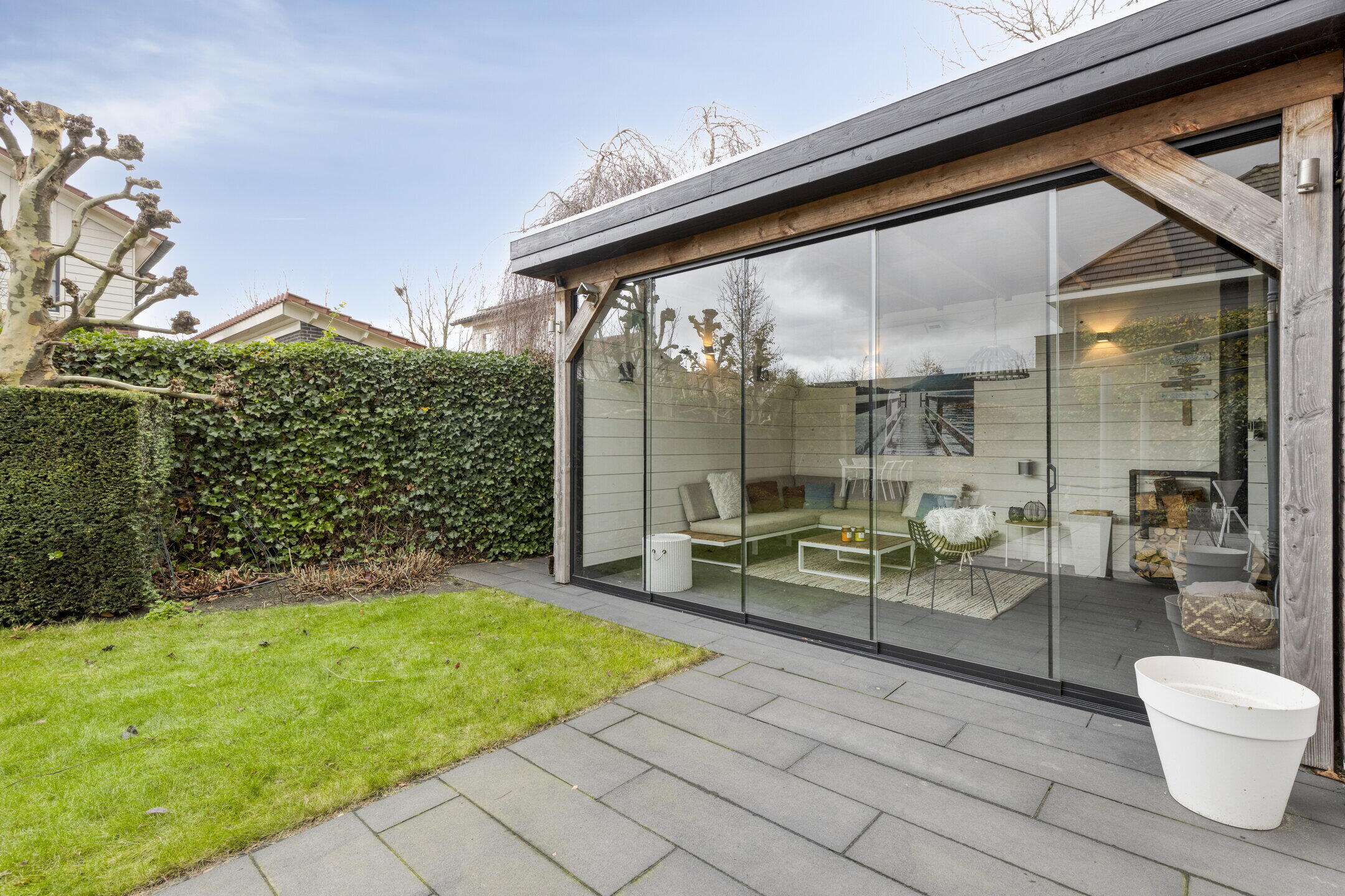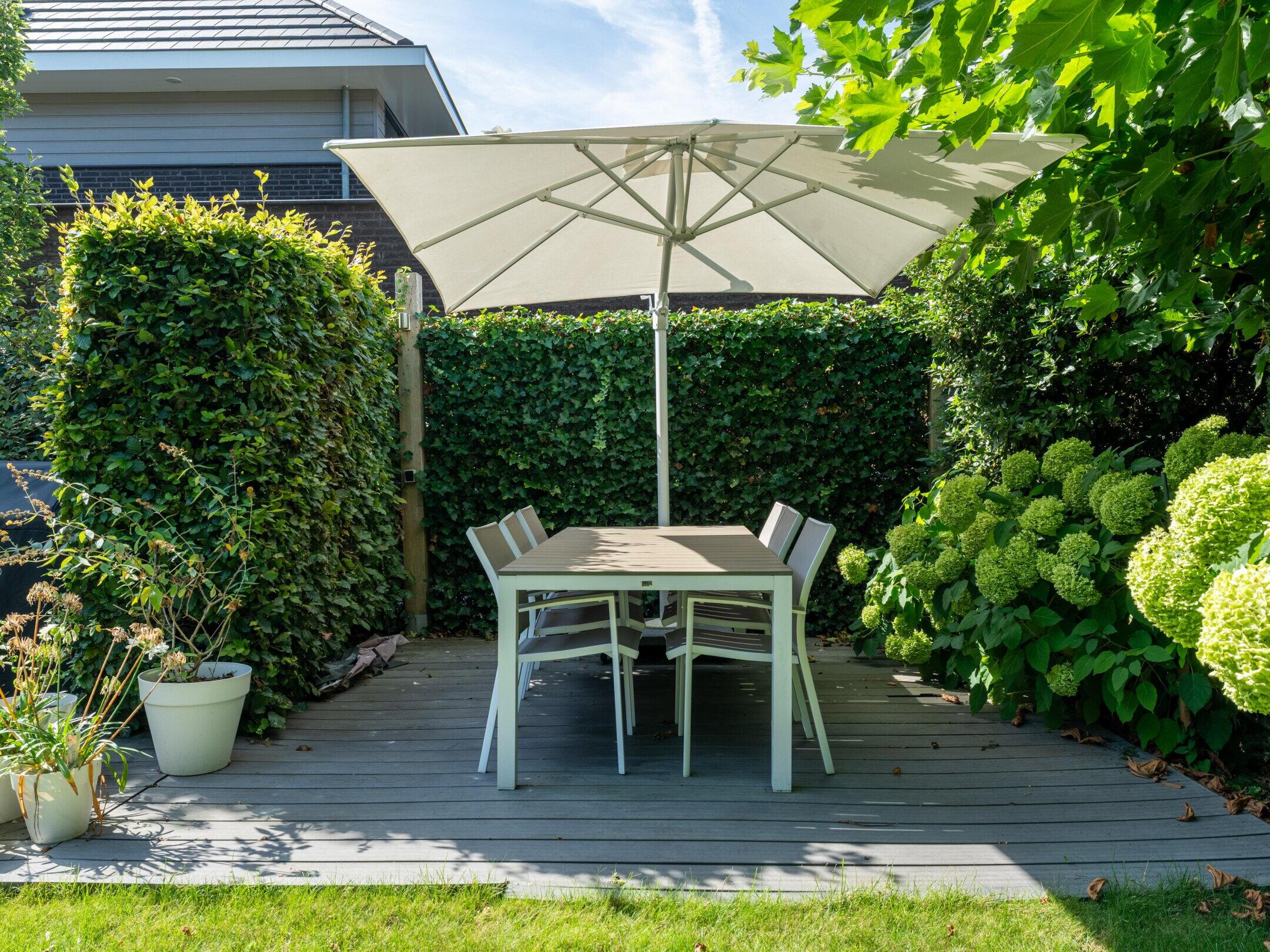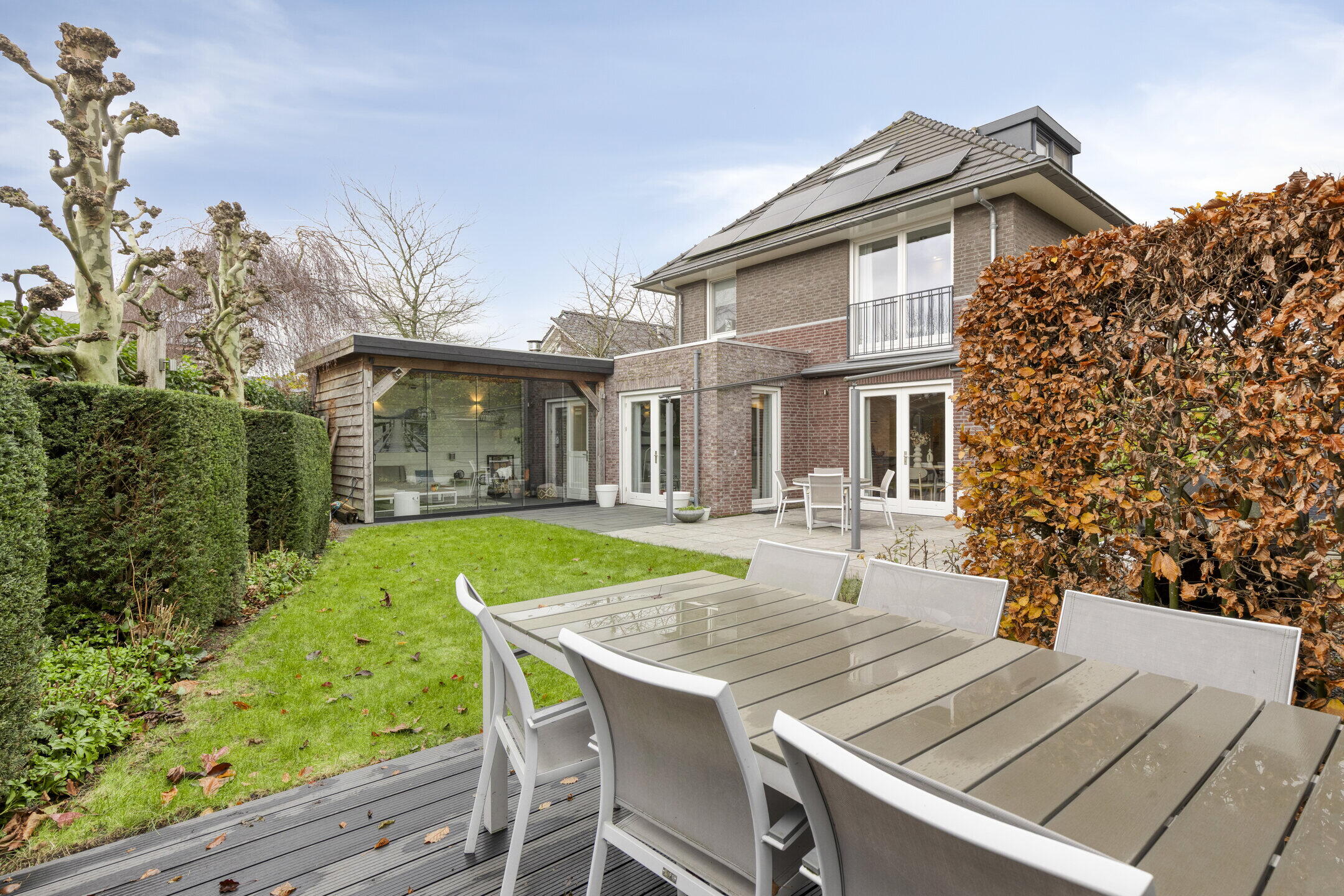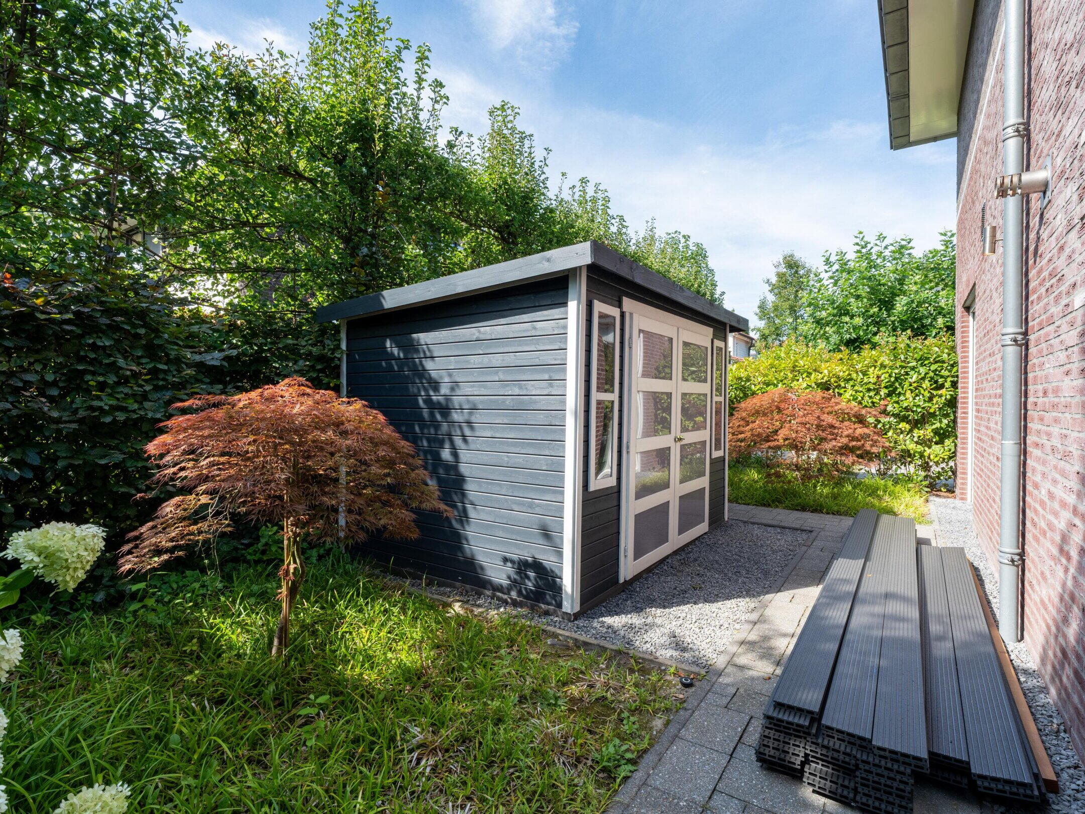 De tuin is een oase van rust en luxe. Mooie borders, meerdere terrassen en als eyecatcher natuurlijk de eerder genoemde tuinkamer. De tuin is bovendien voorzien van sprinklersysteem en tuinverlichting. Aan het grote terras bij de eetkamer bevindt zich een zonnescherm, zodat je ook op warme dagen in de schaduw kunt genieten. Aan de zijkant van de woning vindt je ook een praktisch schuurtje voor extra opbergruimte. Alles is tot in de puntjes verzorgd, je hoeft hier letterlijk niets meer aan te doen!