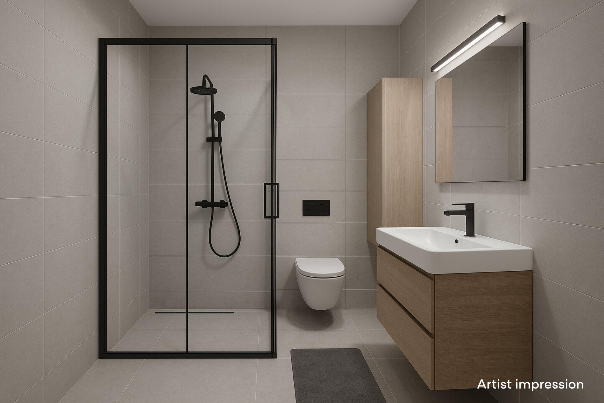 - Douche, wastafel, wastafelmeubel, wasmachineaansluiting