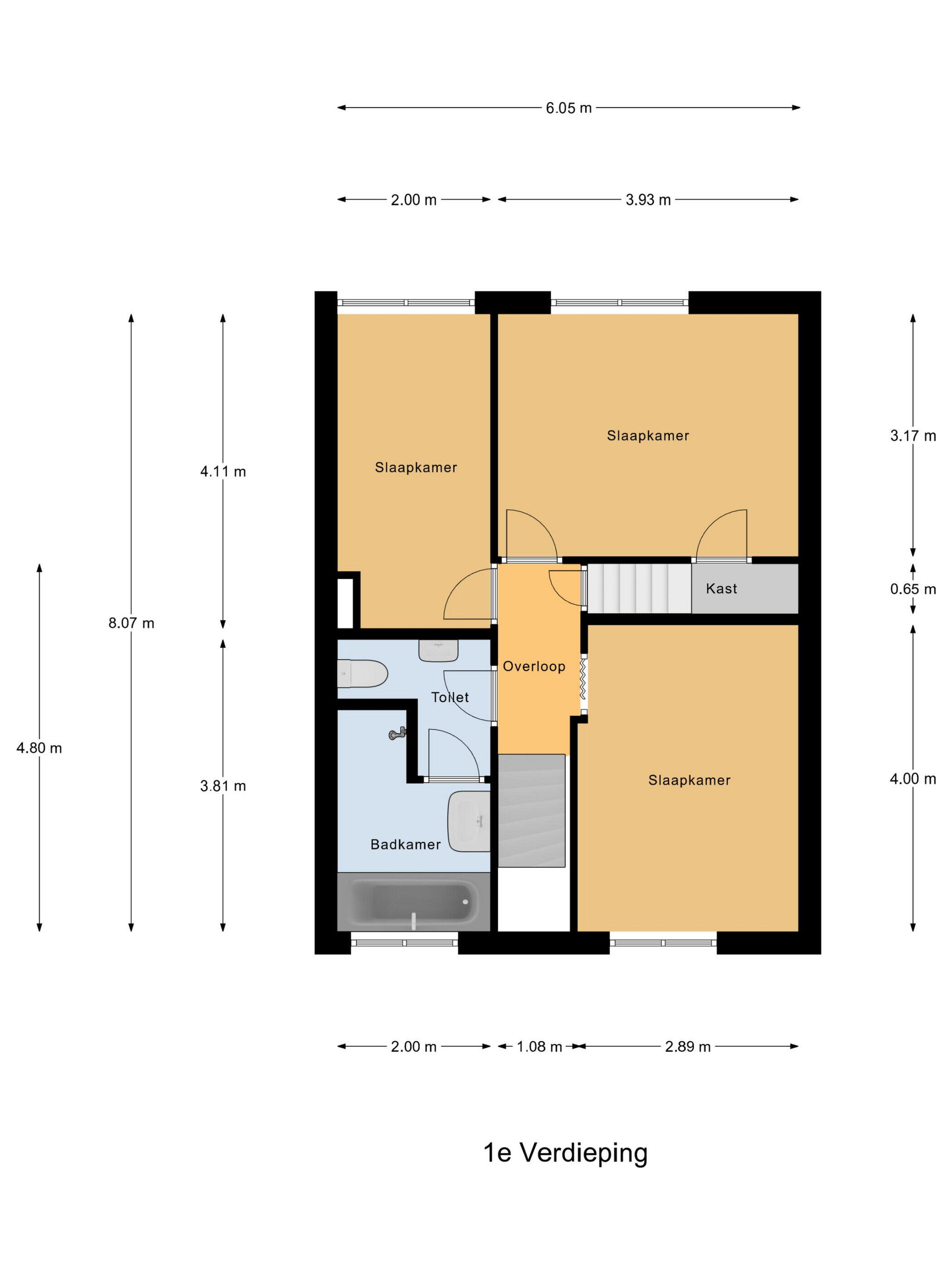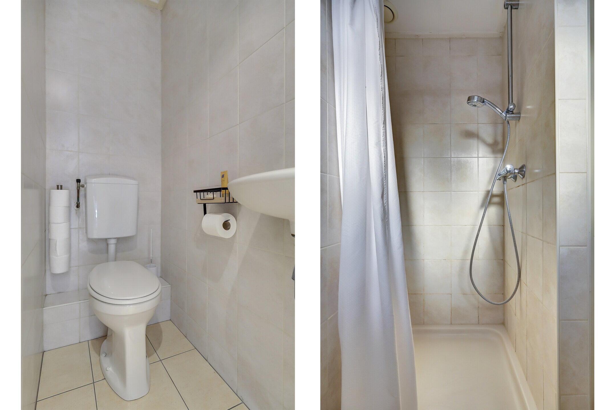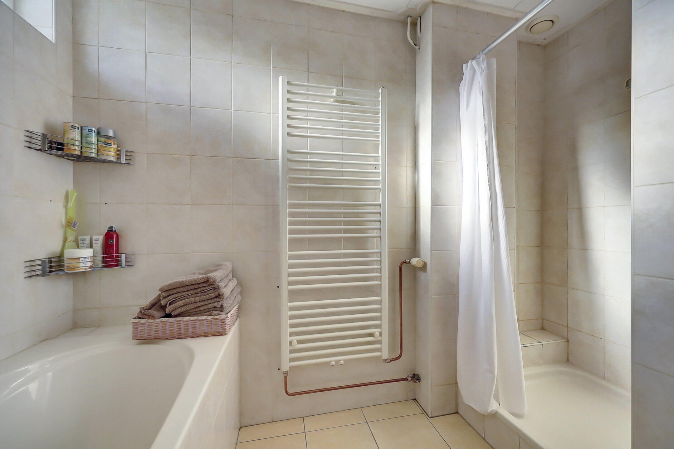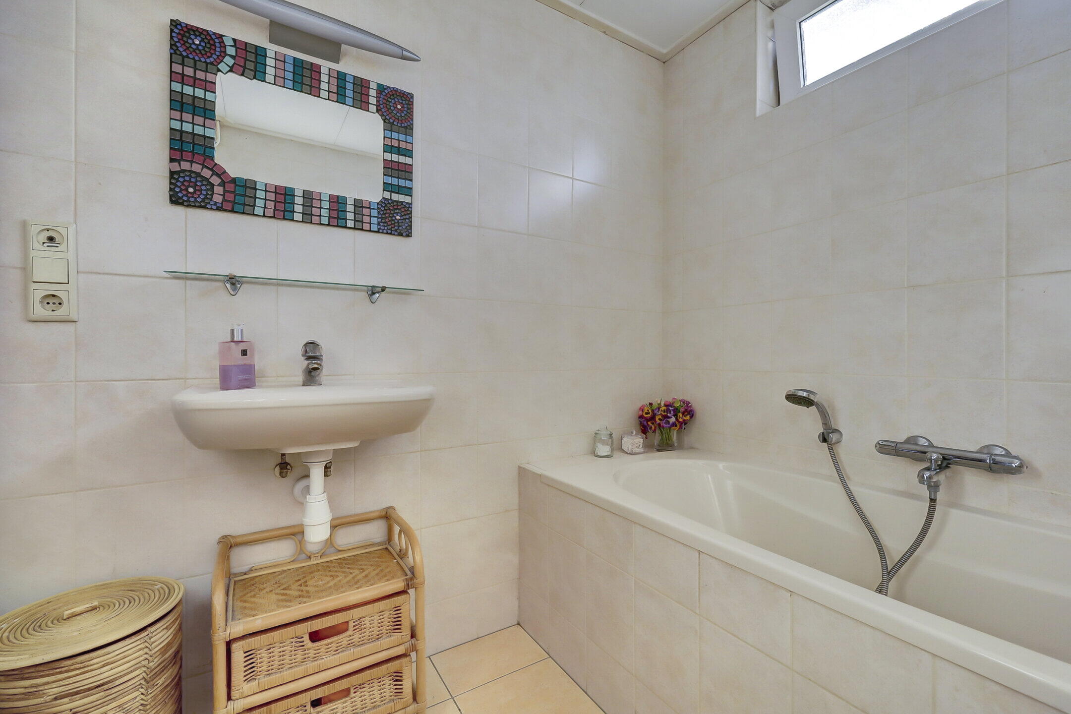 Eerste verdieping: overloop, drie slaapkamers en een sterk vergrootte badkamer met ligbad, douche en wastafel. Daarnaast een separate toiletruimte met een fonteintje.