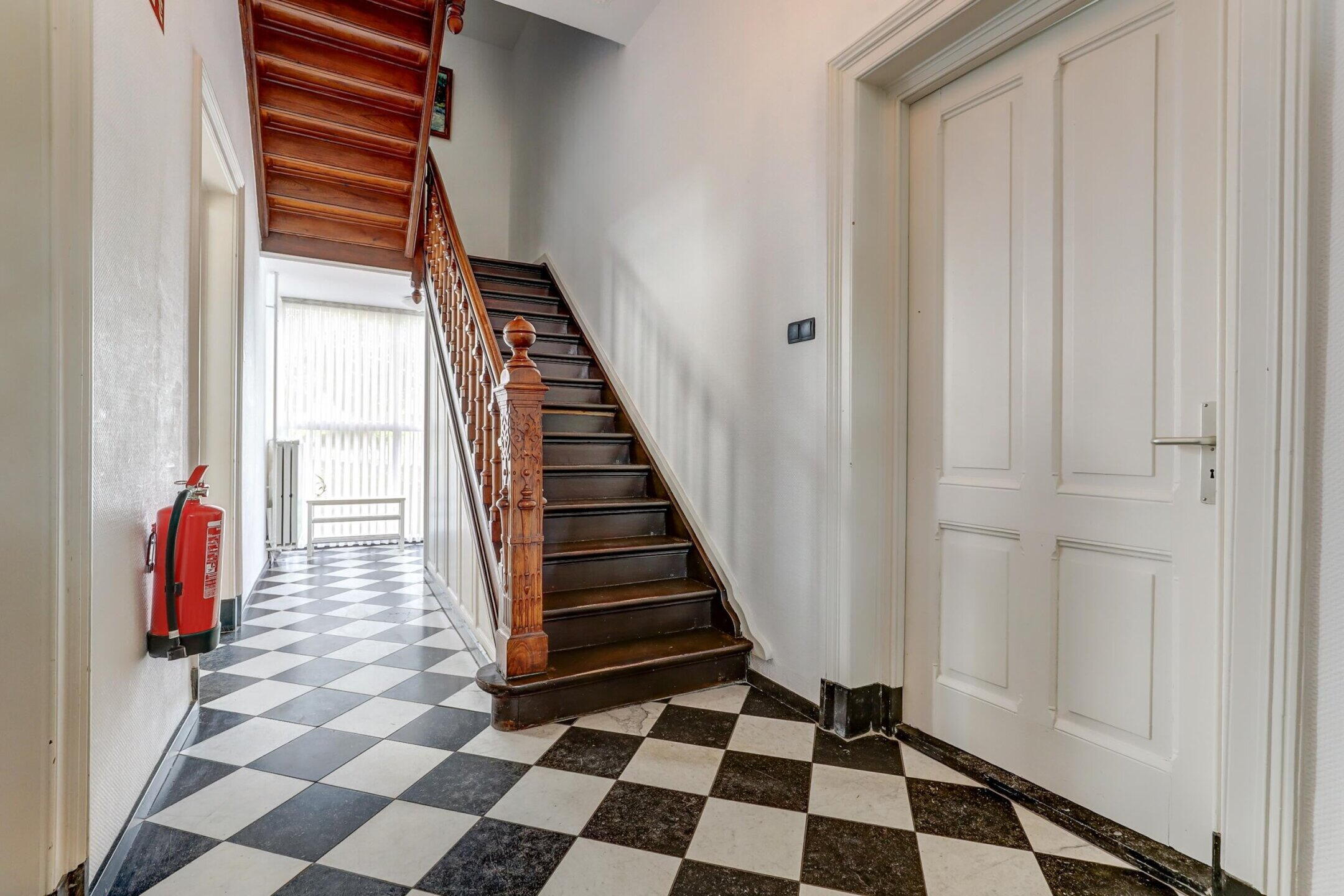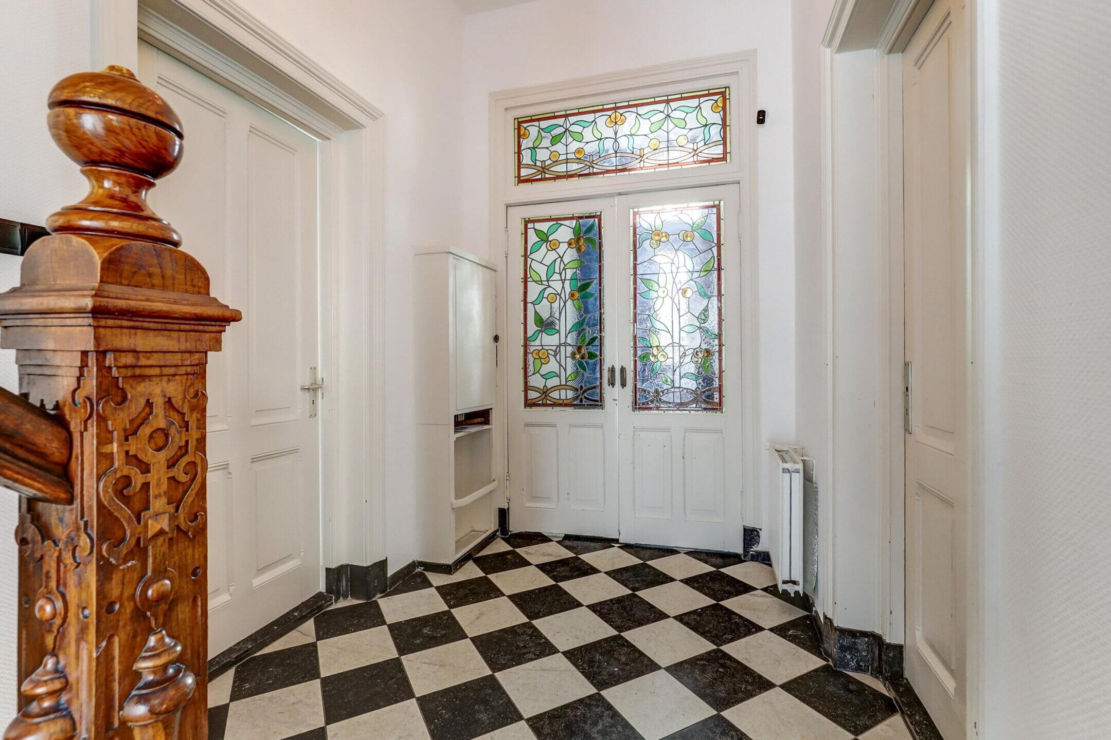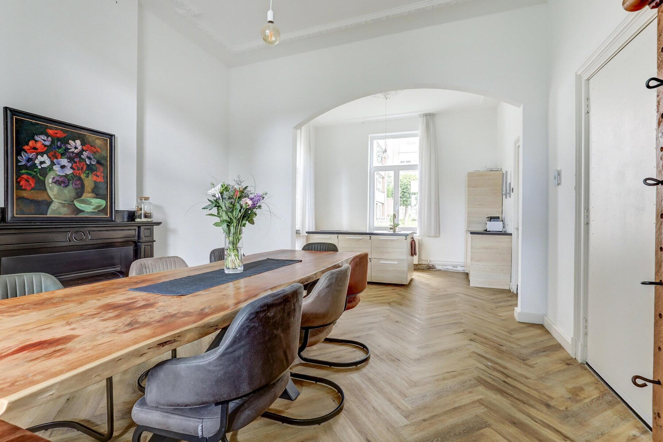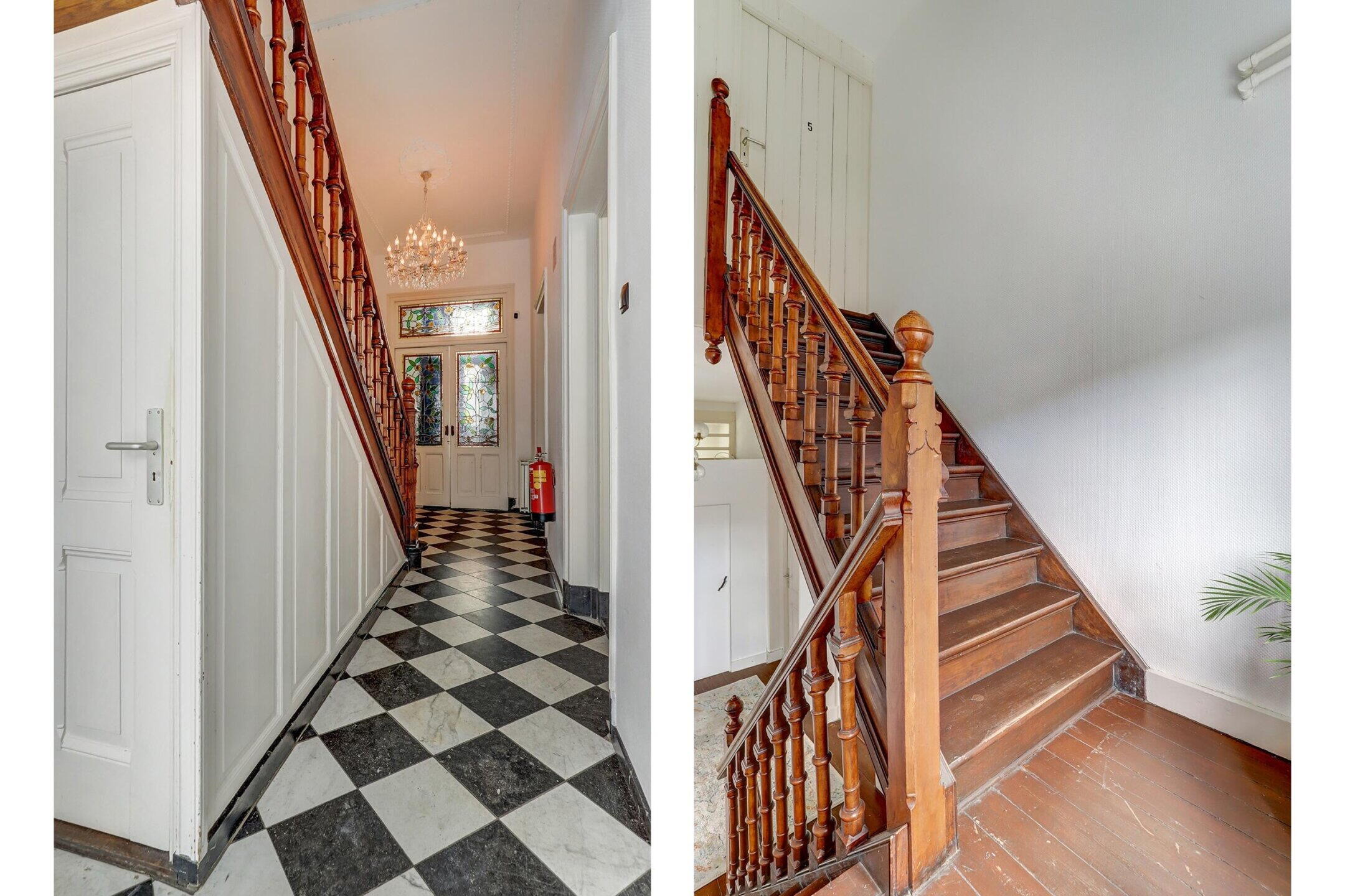 Imposante entree met authentieke trappartij. Woonkamer (ca. 6.49 x 4.25 m) met open haard, aparte eetkamer (ca. 4.48 x 4.26 m) met tweede haardpartij, en een moderne keuken (ca. 3.21 x 4.26 m) met kookeiland. Aan de achterzijde bevindt zich een extra hal met wasruimte en separaat toilet.