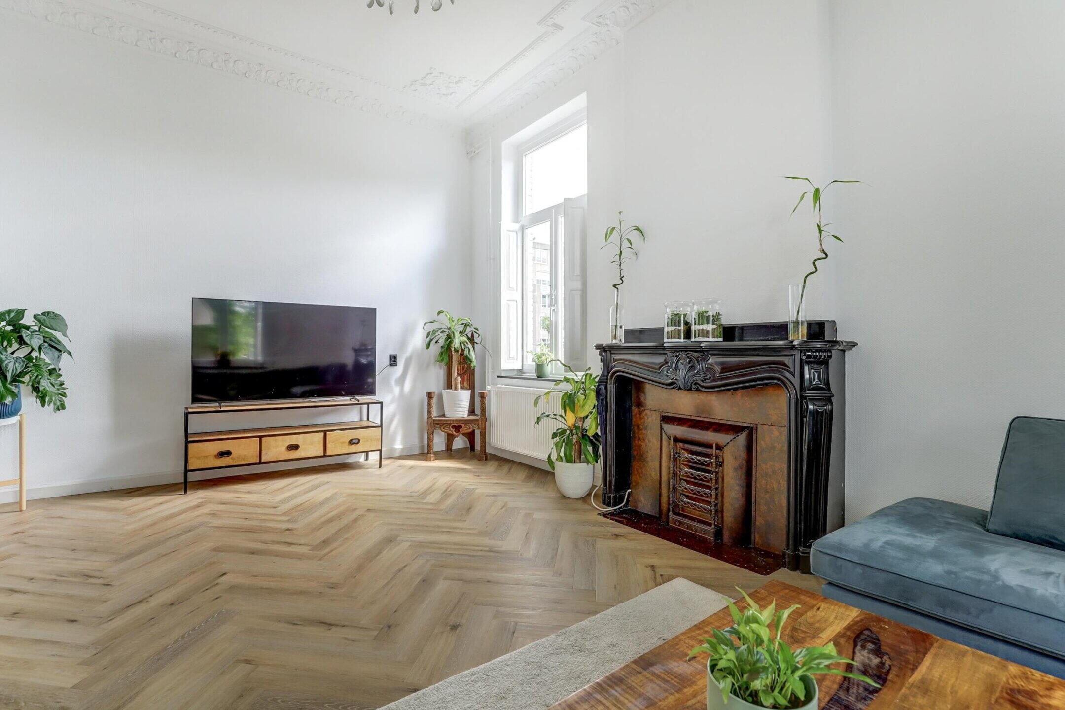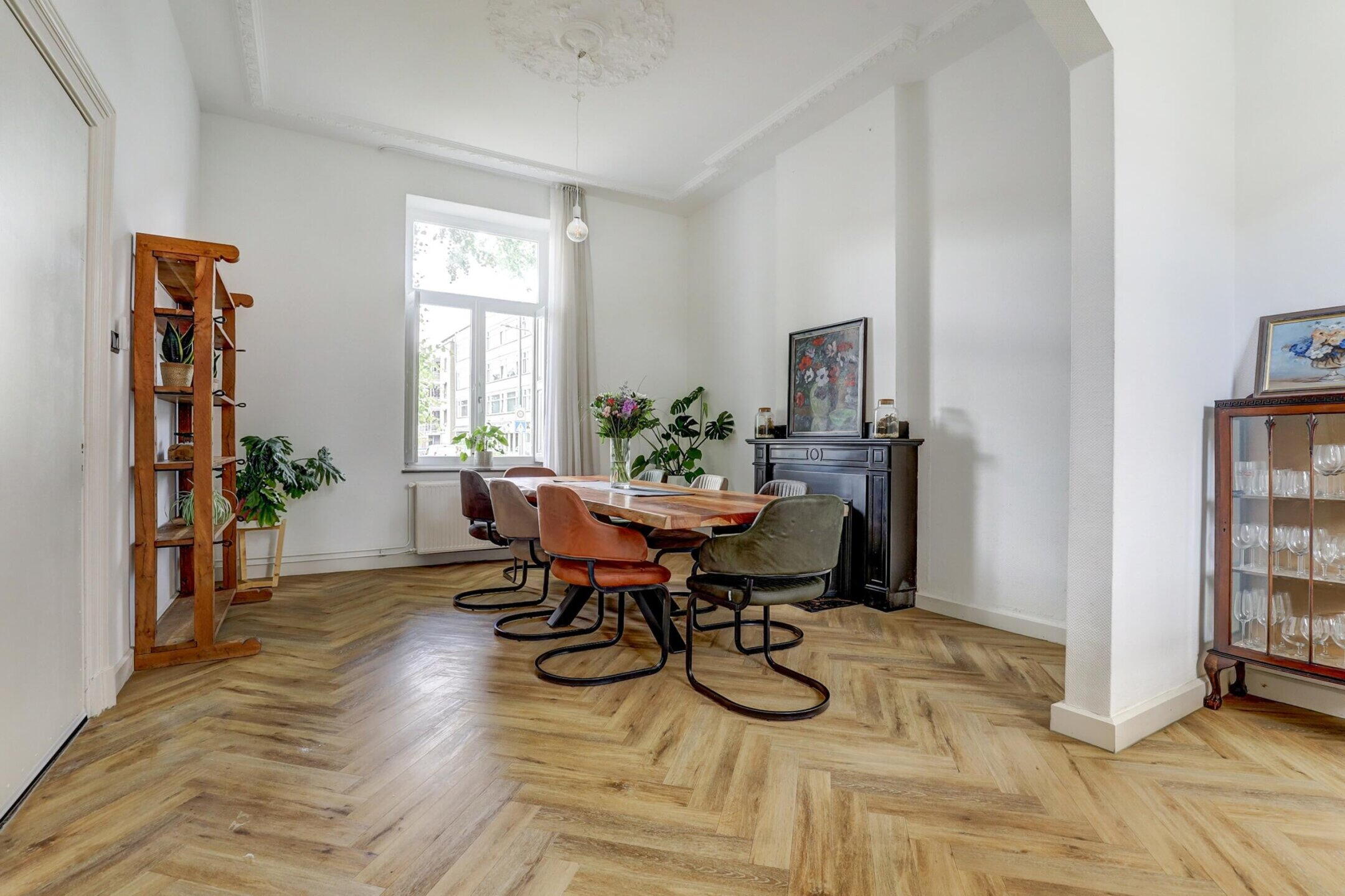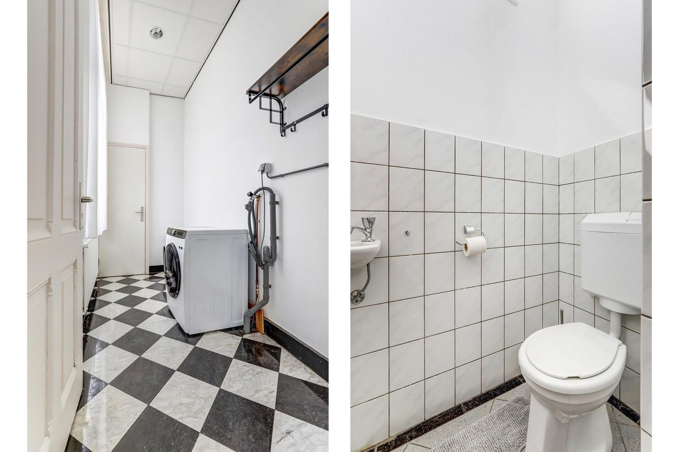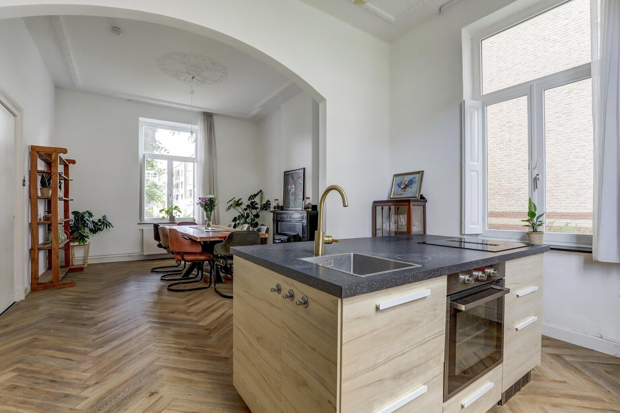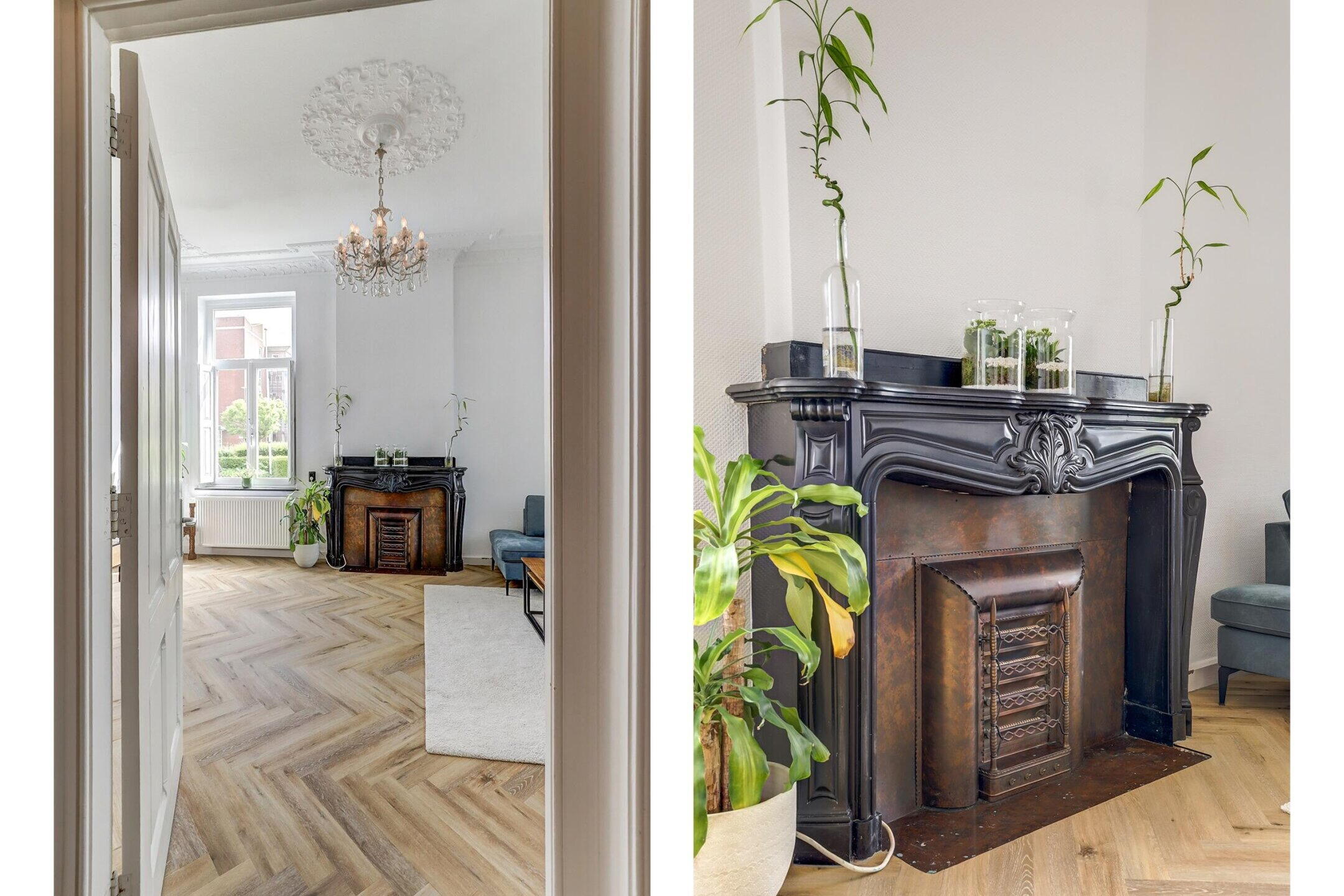 Imposante entree met authentieke trappartij. Woonkamer (ca. 6.49 x 4.25 m) met open haard, aparte eetkamer (ca. 4.48 x 4.26 m) met tweede haardpartij, en een moderne keuken (ca. 3.21 x 4.26 m) met kookeiland. Aan de achterzijde bevindt zich een extra hal met wasruimte en separaat toilet.