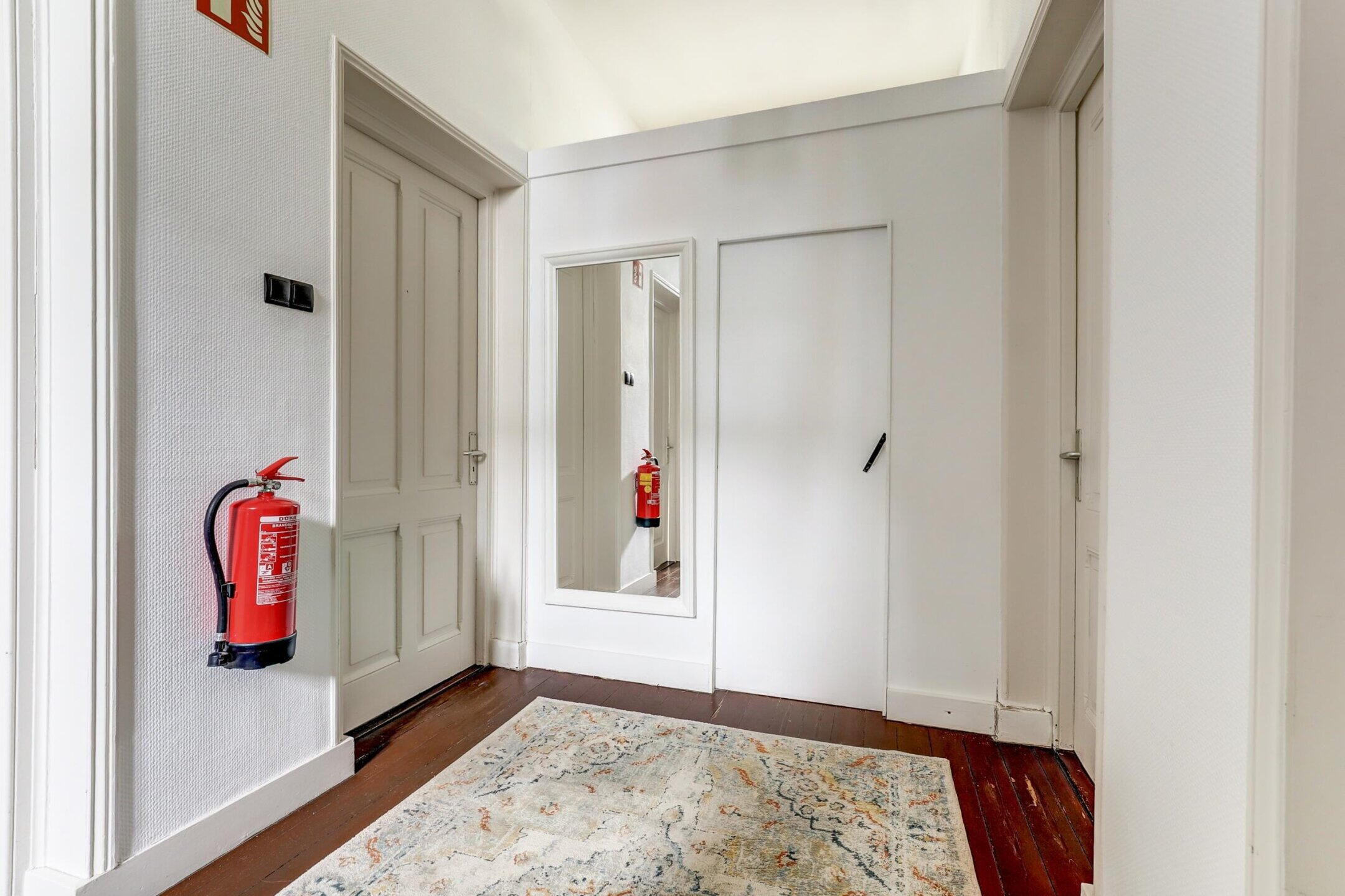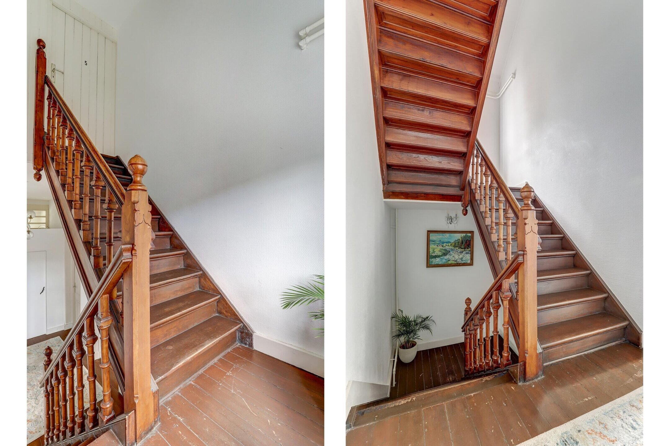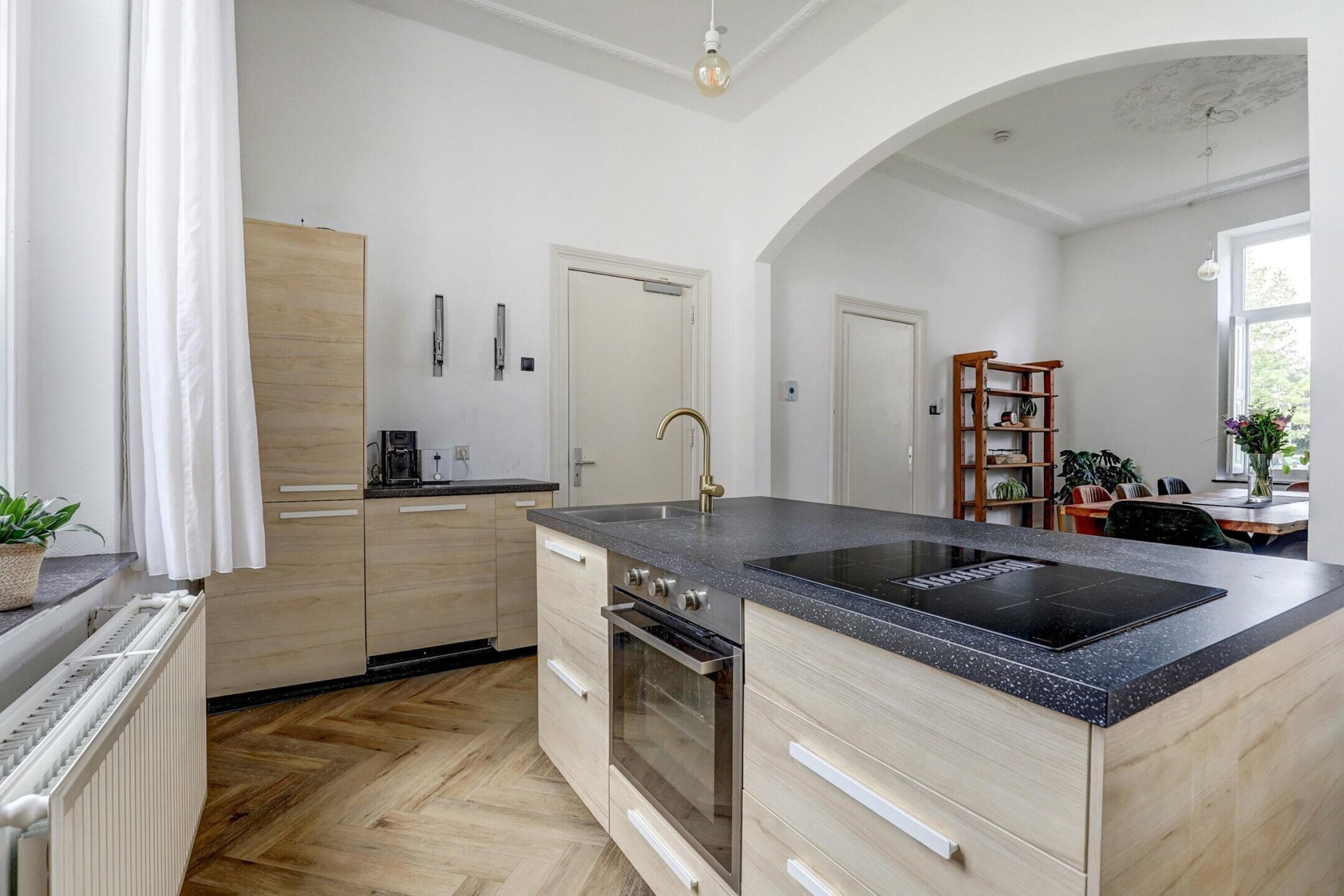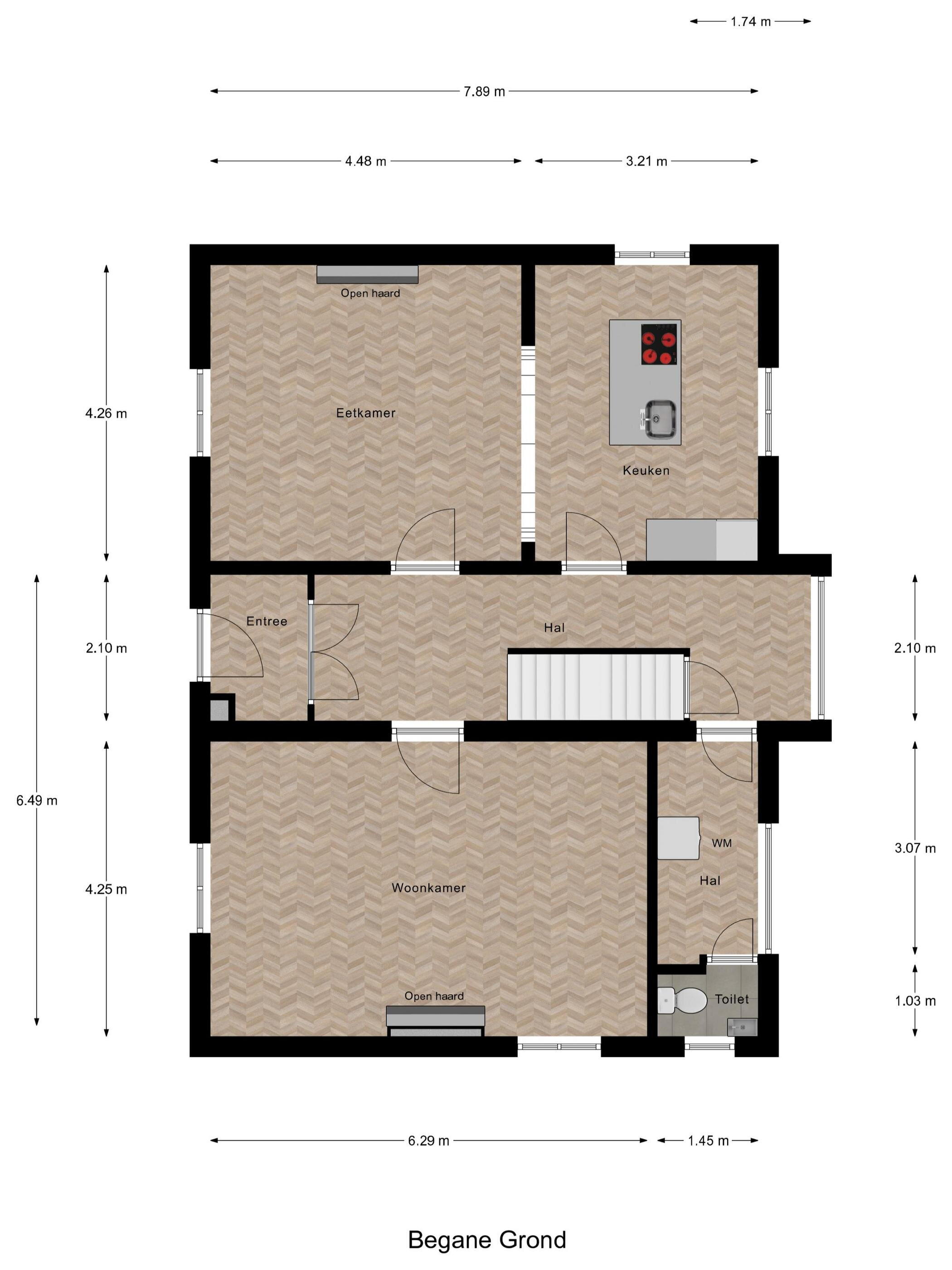 Imposante entree met authentieke trappartij. Woonkamer (ca. 6.49 x 4.25 m) met open haard, aparte eetkamer (ca. 4.48 x 4.26 m) met tweede haardpartij, en een moderne keuken (ca. 3.21 x 4.26 m) met kookeiland. Aan de achterzijde bevindt zich een extra hal met wasruimte en separaat toilet.