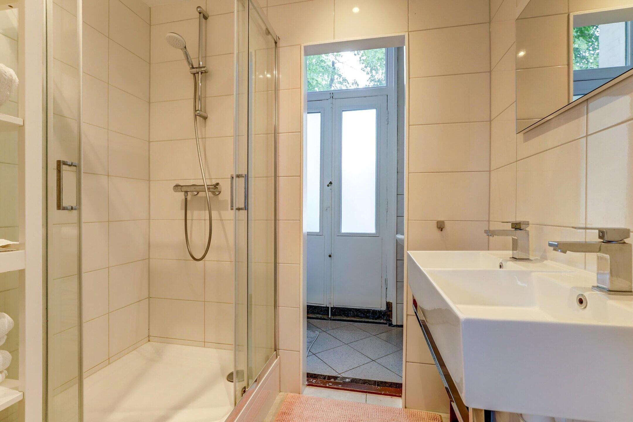 Badkamer met douche, dubbele wastafel, toilet en toegang tot het balkon.