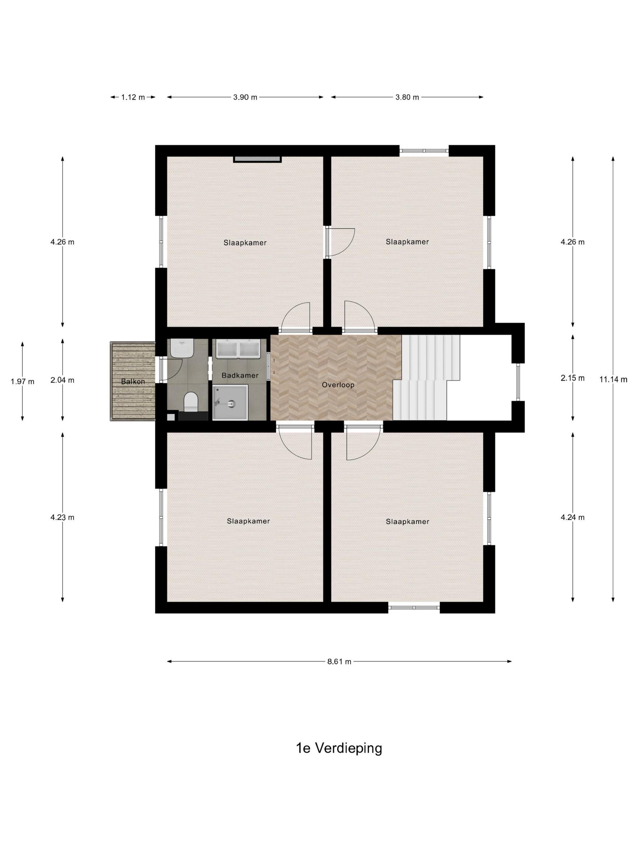 * Slaapkamer 1: ca. 3.90 x 4.26 m