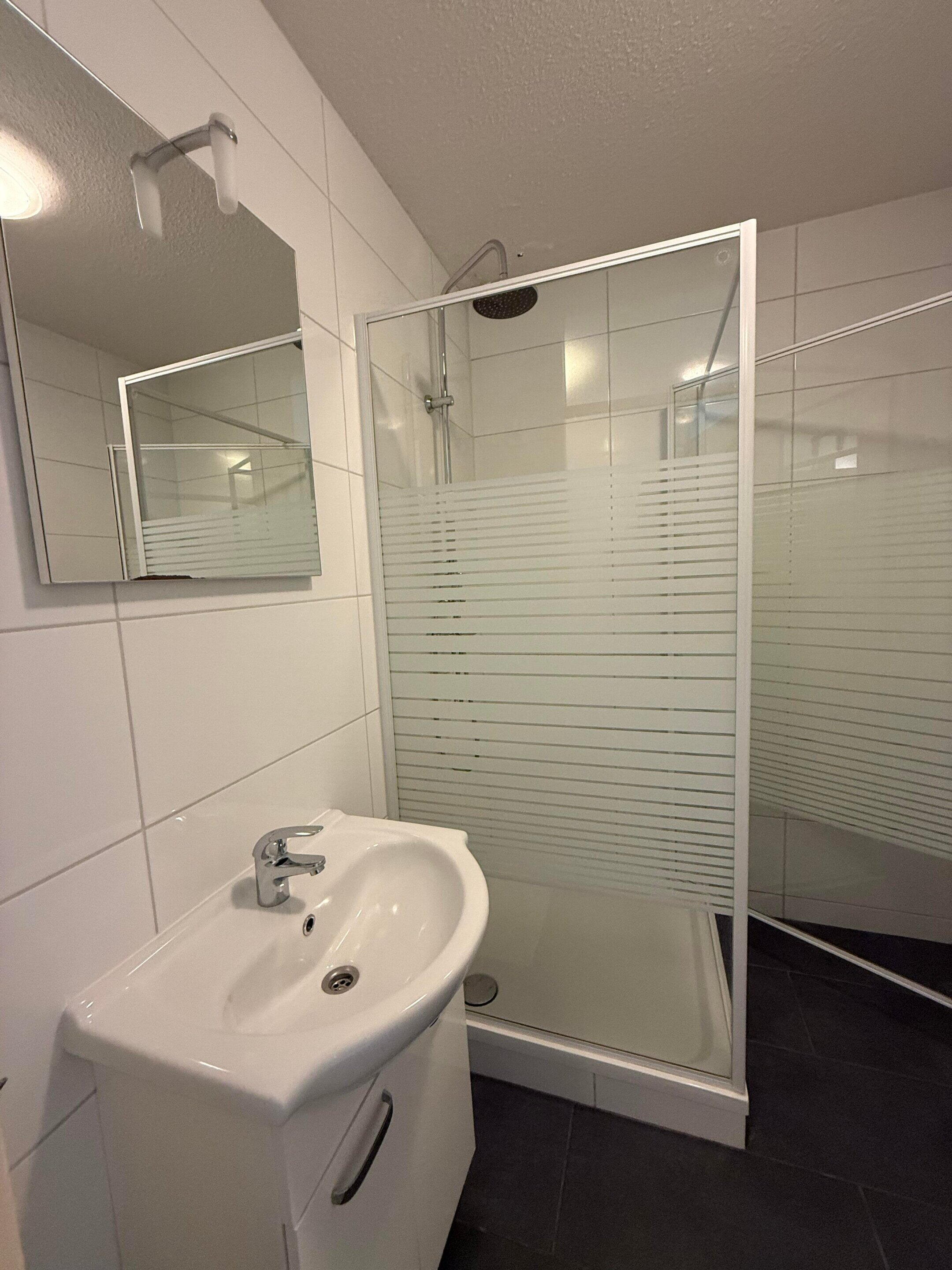 De badkamer is uitgerust met een separate douche en een praktisch wasmeubel, waarmee u dagelijks geniet van comfort en functionaliteit.