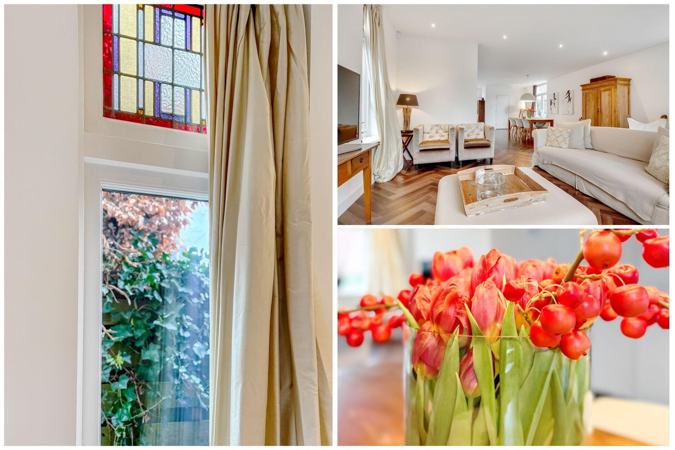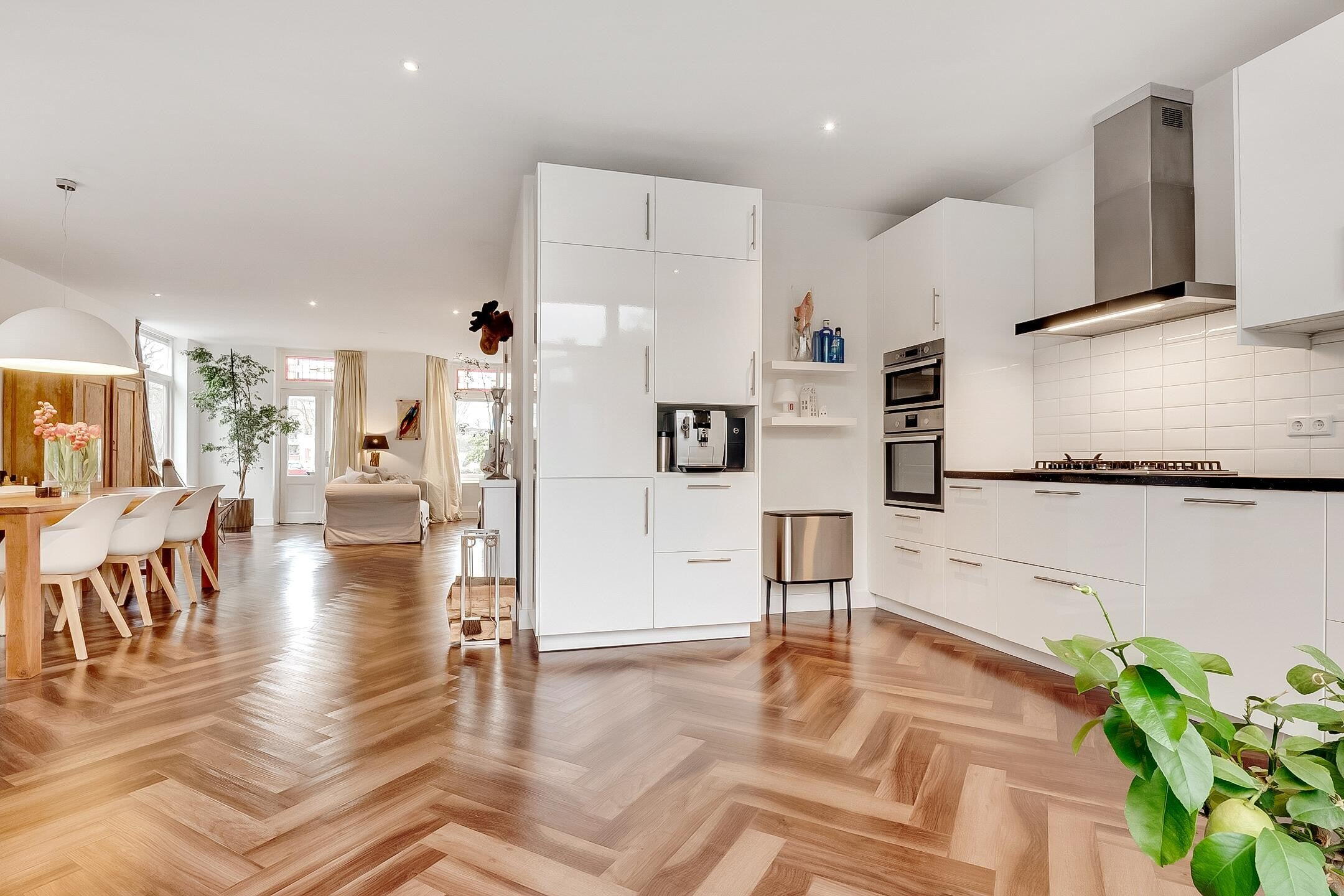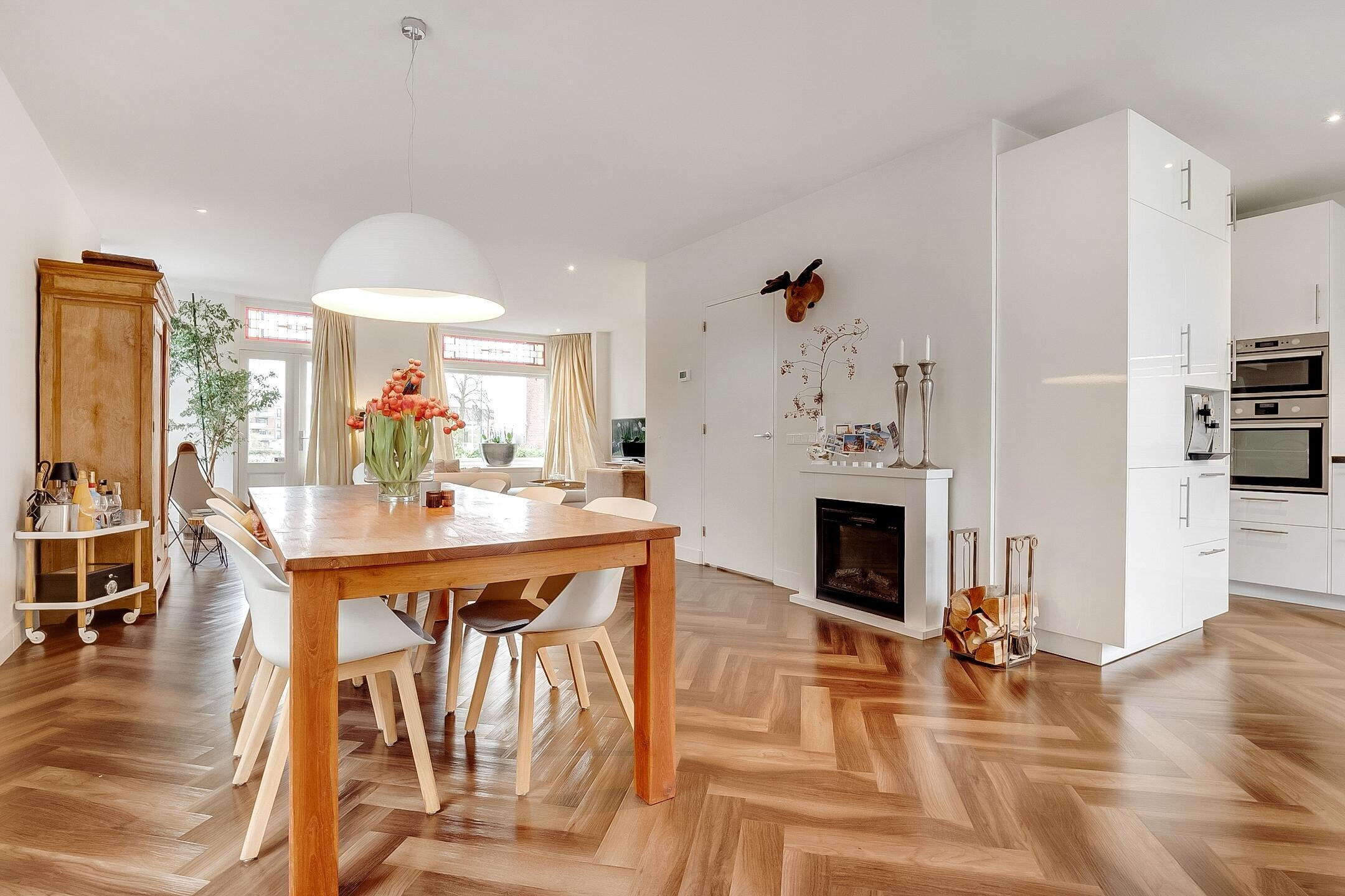 Via de stijlvolle entree bereikt u de royale en lichte woonkamer met karakteristieke erker. De gehele begane grond is afgewerkt met een hoogwaardige pvc-vloer voorzien van vloerverwarming. De luxe, recent geplaatste keuken is uitgerust met alle denkbare inbouwapparatuur en vormt een perfecte combinatie van comfort en design. Openslaande deuren geven toegang tot de zonnige, op het zuiden gelegen tuin. Verder beschikt de begane grond over een modern toilet met fonteintje en een aparte cv-ruimte.