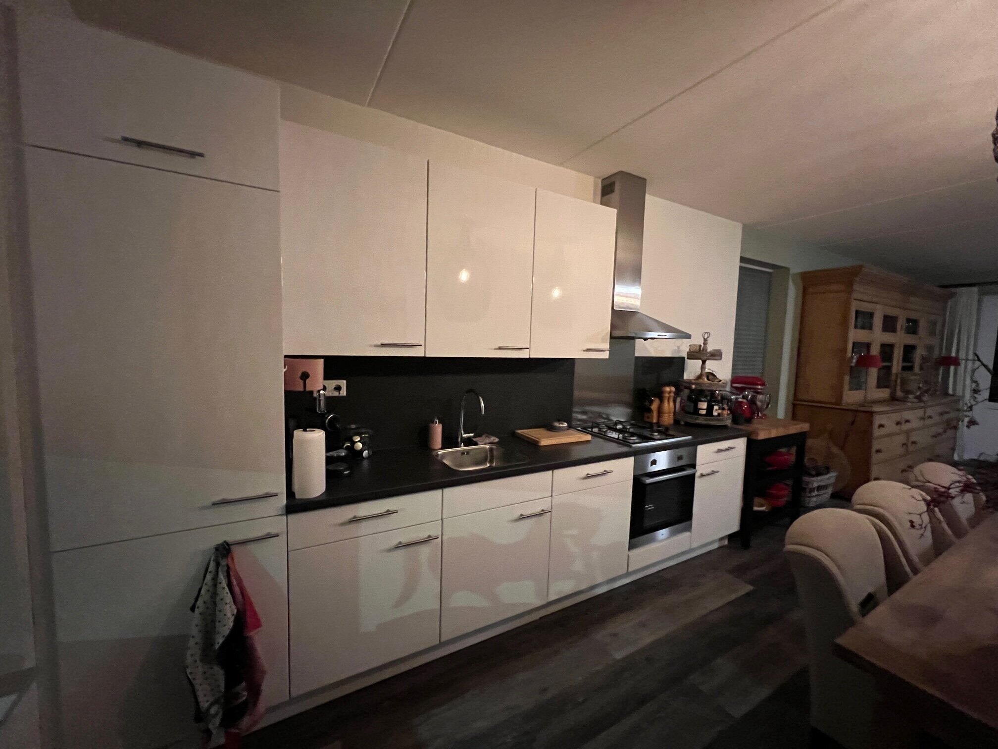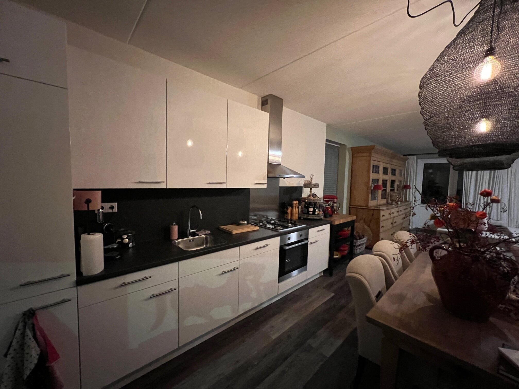 Indeling: Ruime hal met toilet en trap naar 1e verdieping, ruime woonkamer voorzien van pvc vloer met vloerverwarming. Fraaie moderne keuken met inbouwapparatuur.