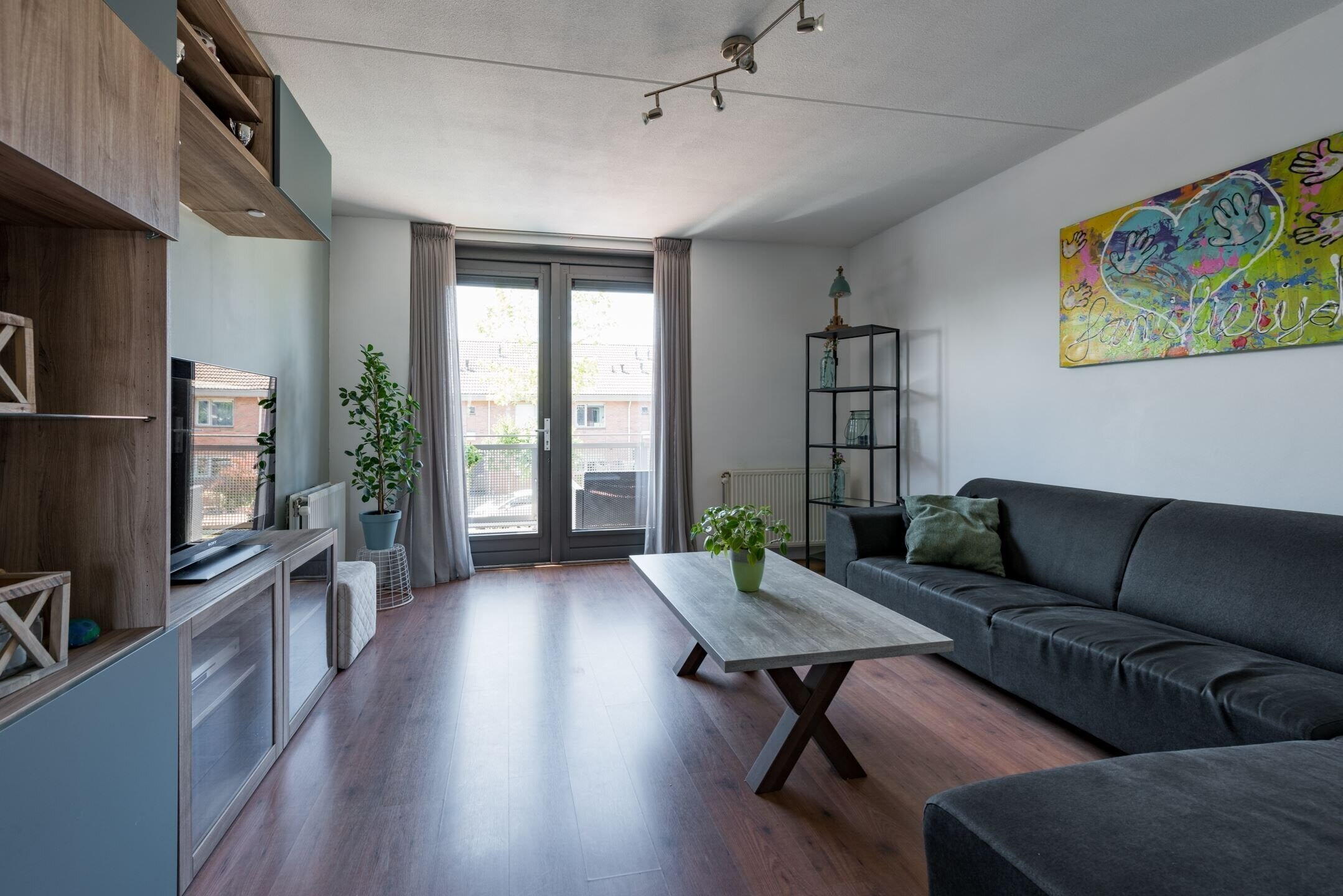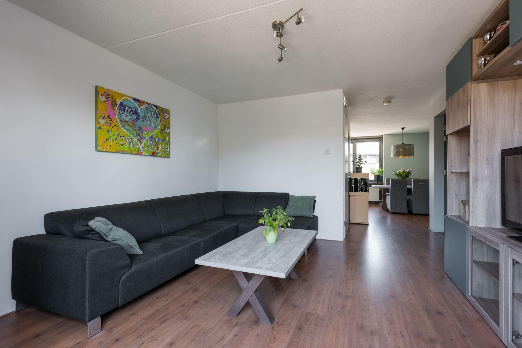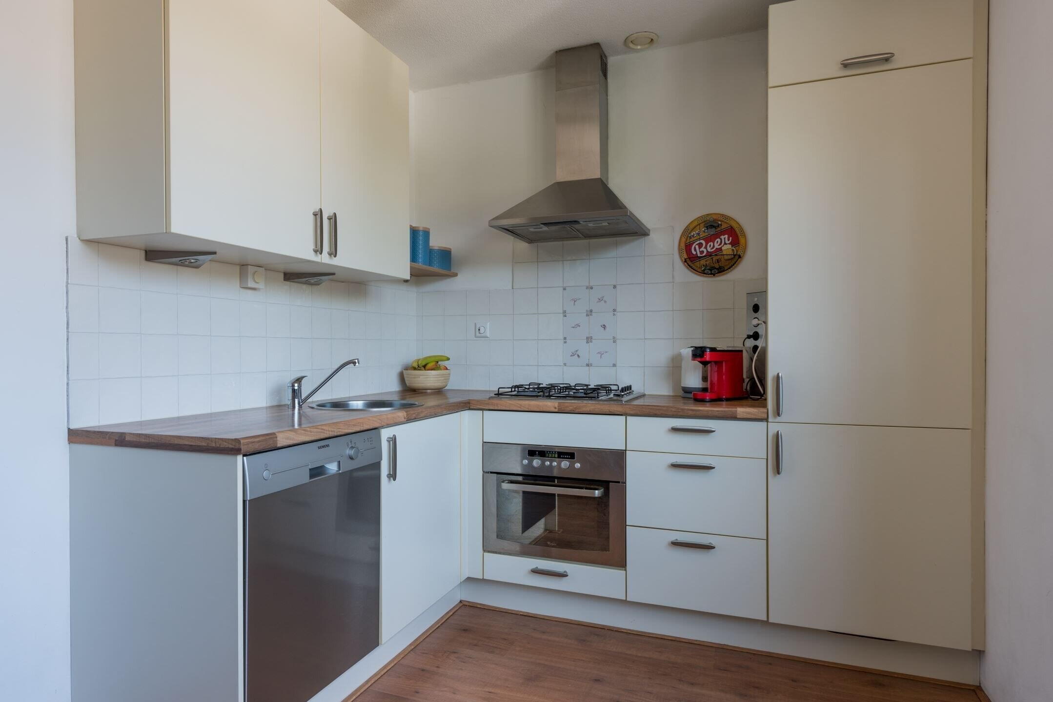 Aan woongenot geen gebrek: 1ste verdieping: Riante woonkamer v.v. een laminaatvloer en zonnige balkon, open keuken met diverse inbouwapparatuur 4 pits gasfornuis, combi oven, vaatwasmachine, afzuigkap, koelkast/vrieskast) en toilet met fonteintje.