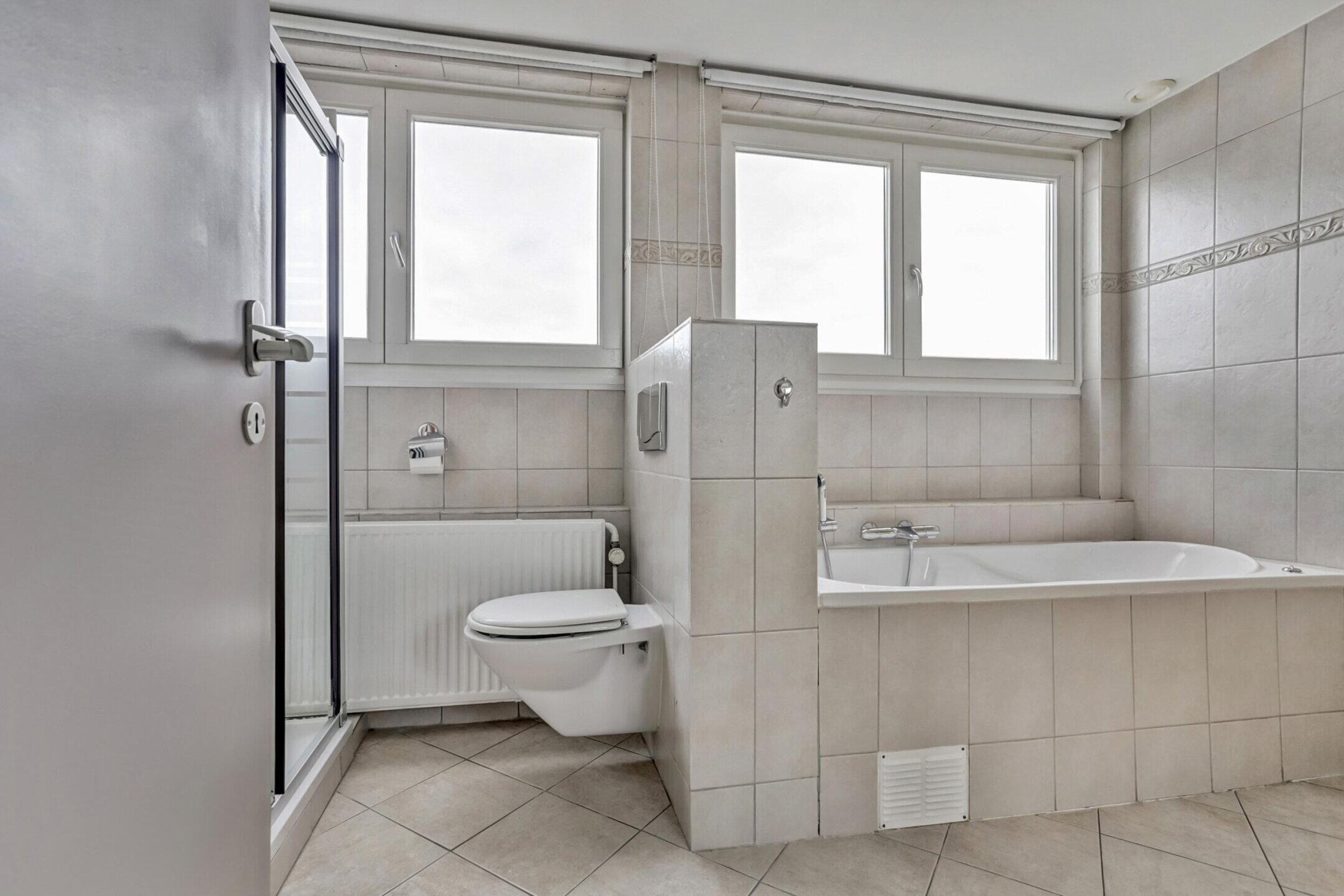 Verder beschikt deze verdieping over een separaat toilet en een ruime hal met trapopgang (en lifttoegang). In de woonkamer zijn alle ramen voorzien, zowel aan de voor- als achterkant van elektrisch te bieden Suncreens.