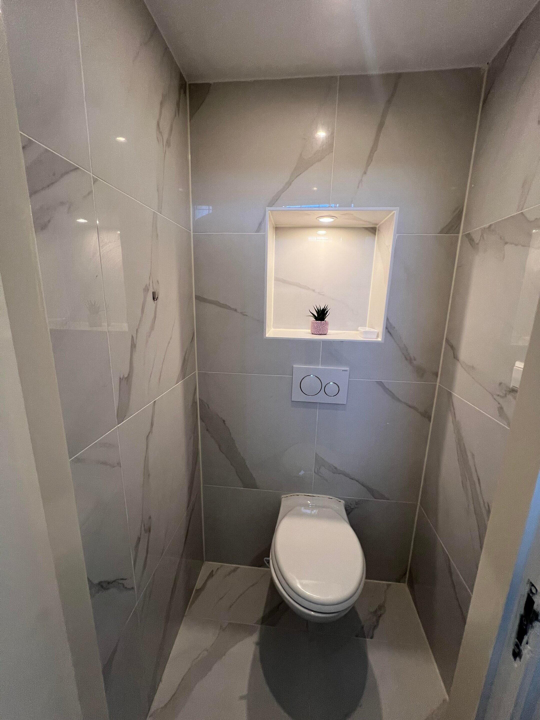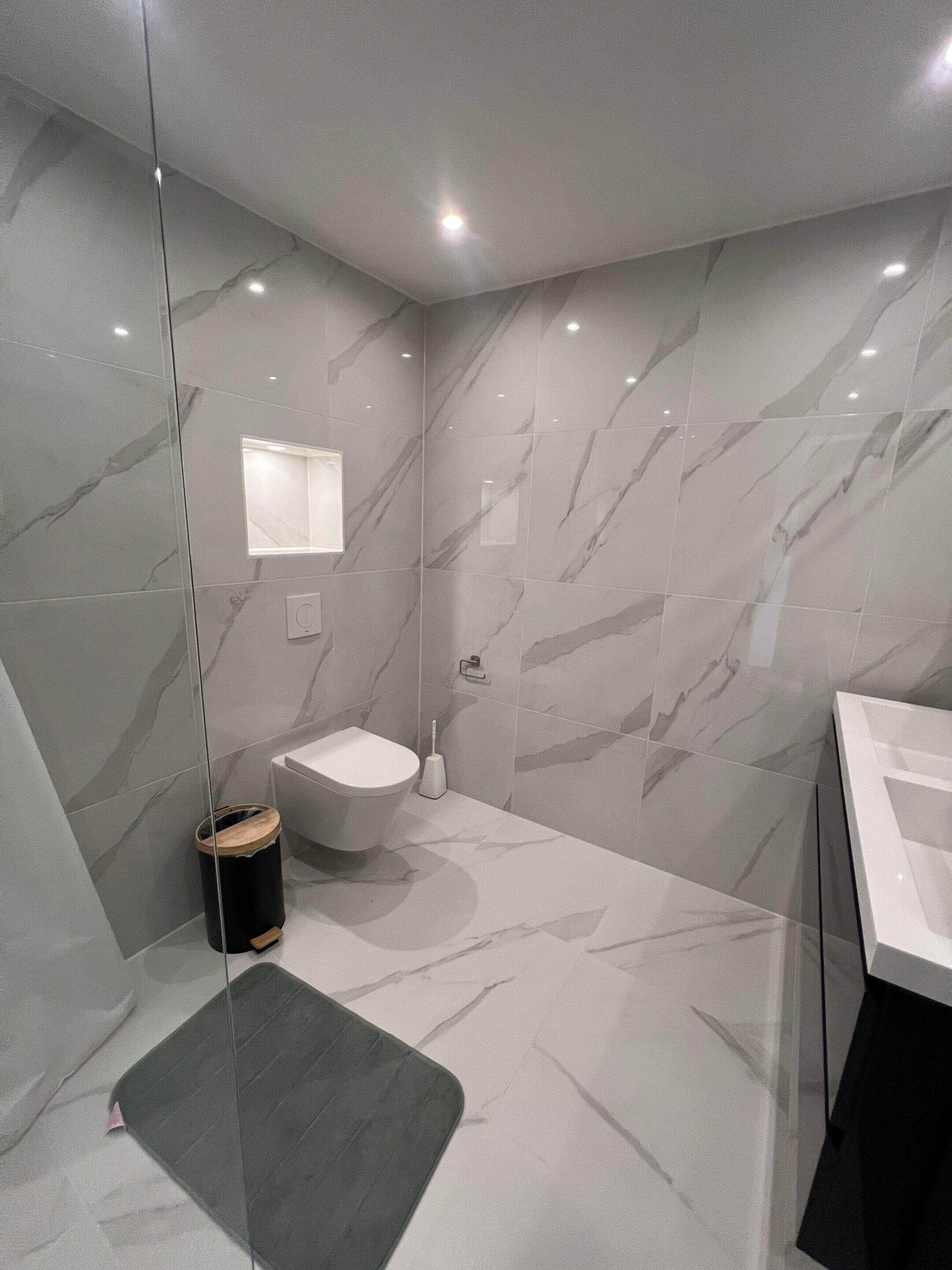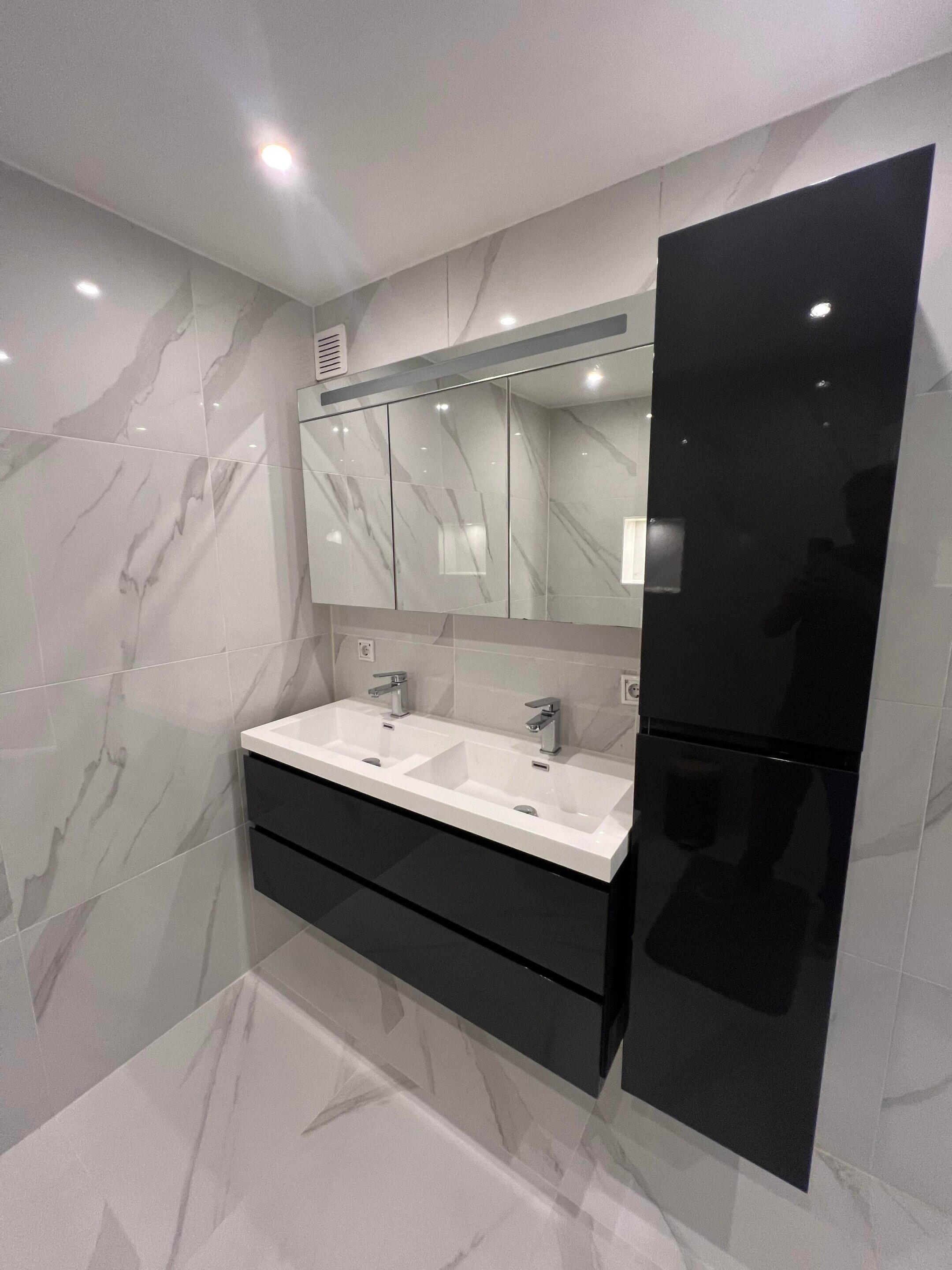 - Dubbele wastafel, inloopdouche, hangend toilet, wastafelmeubel