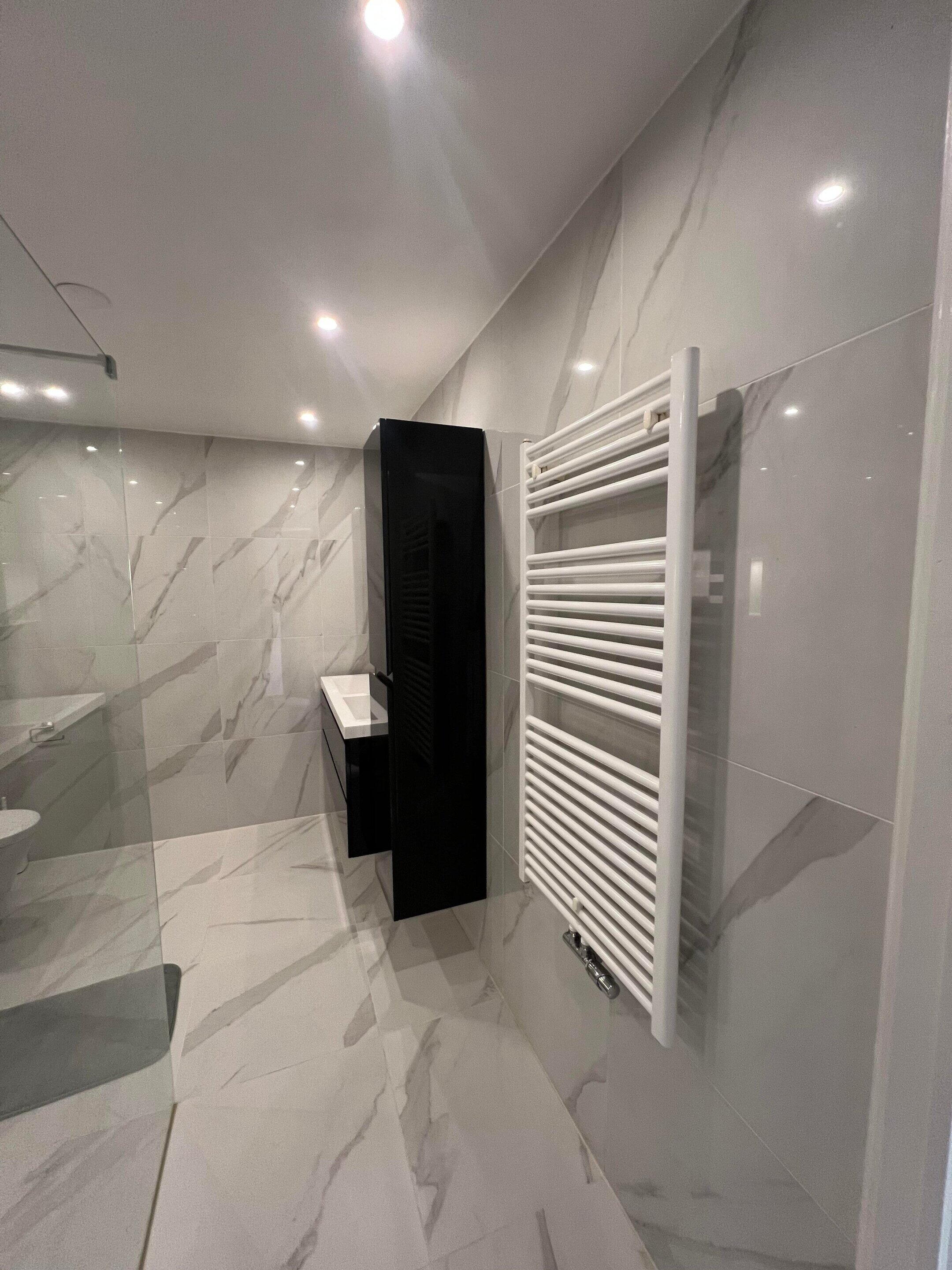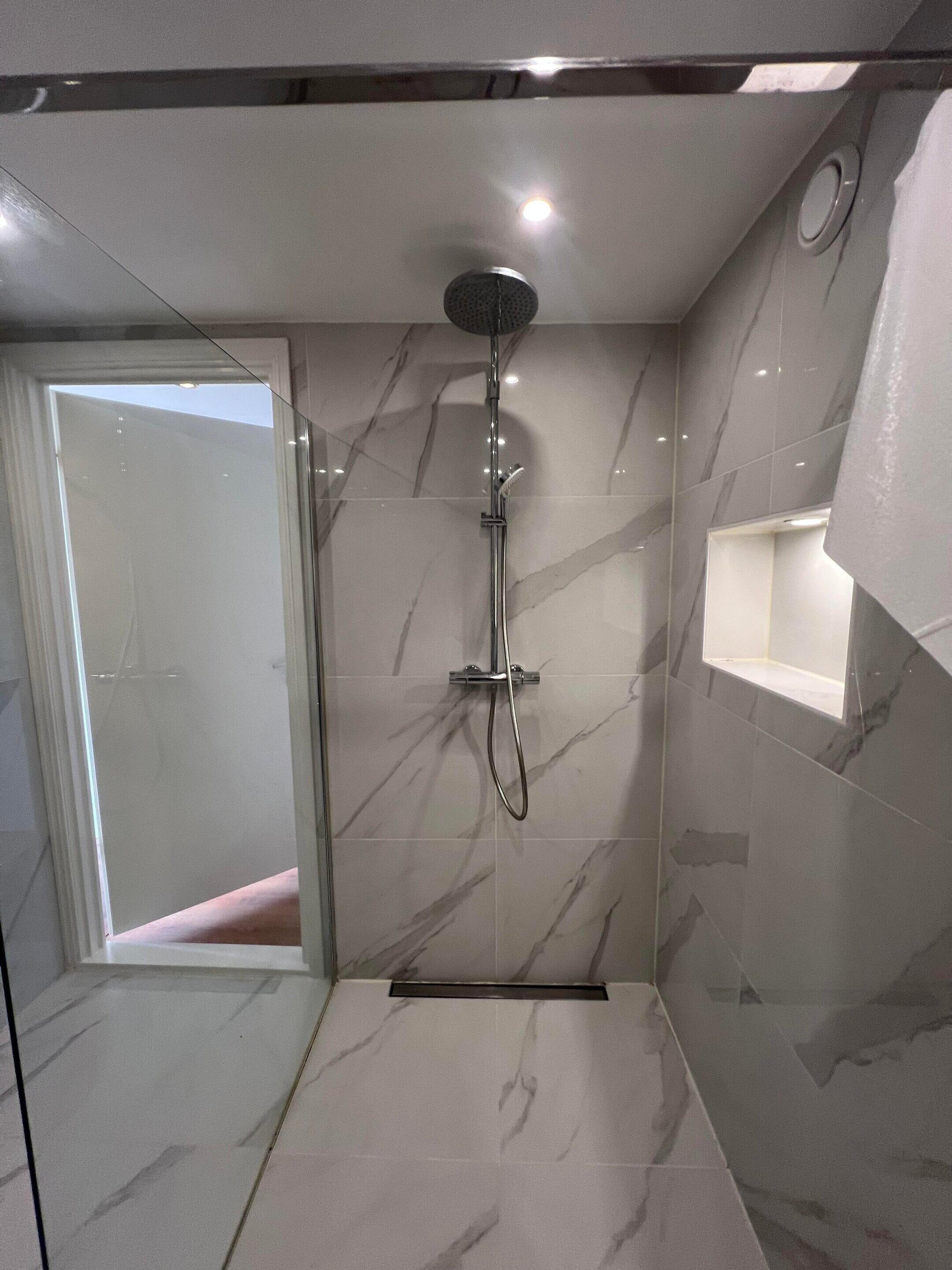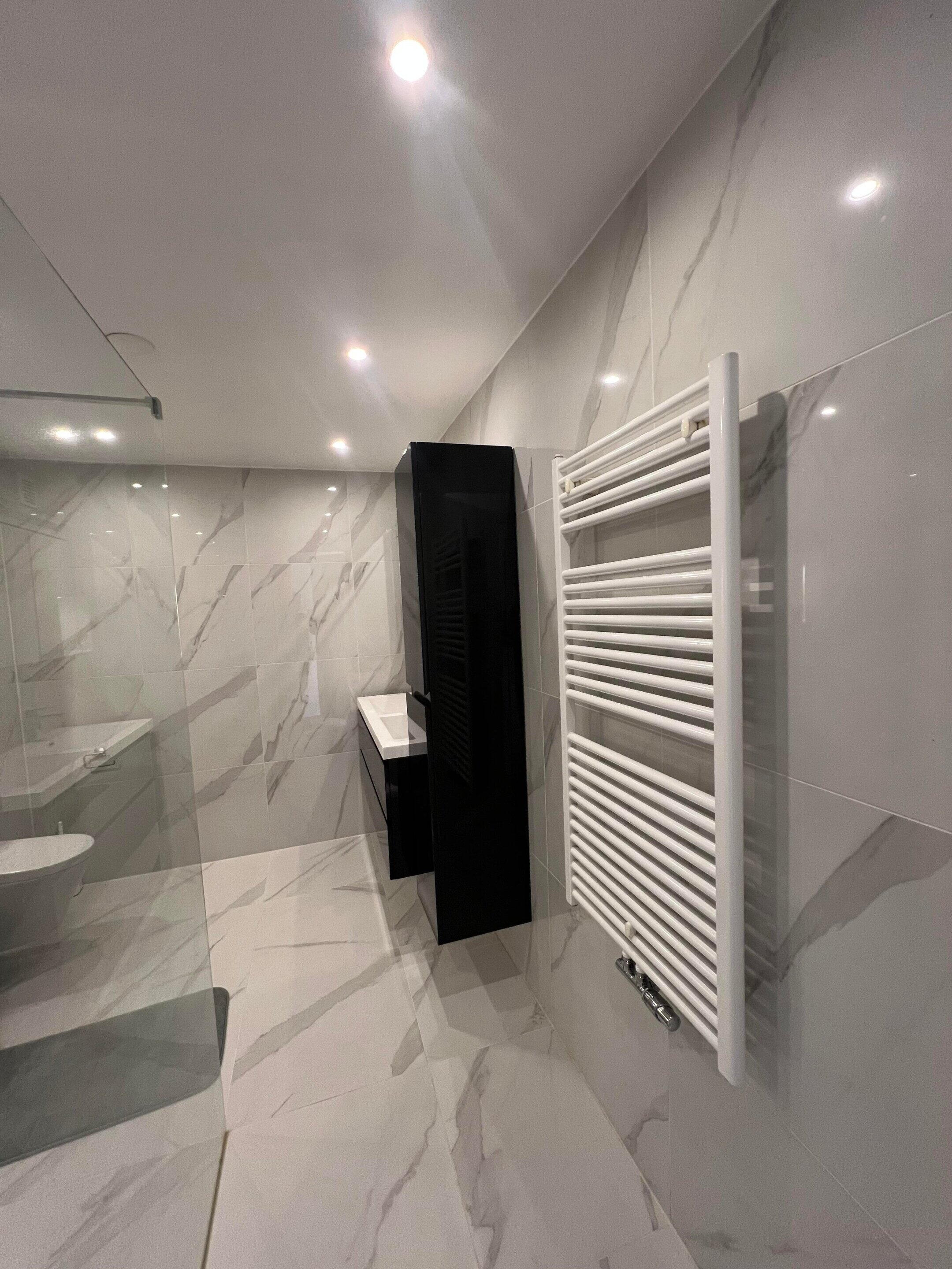 - Dubbele wastafel, inloopdouche, hangend toilet, wastafelmeubel