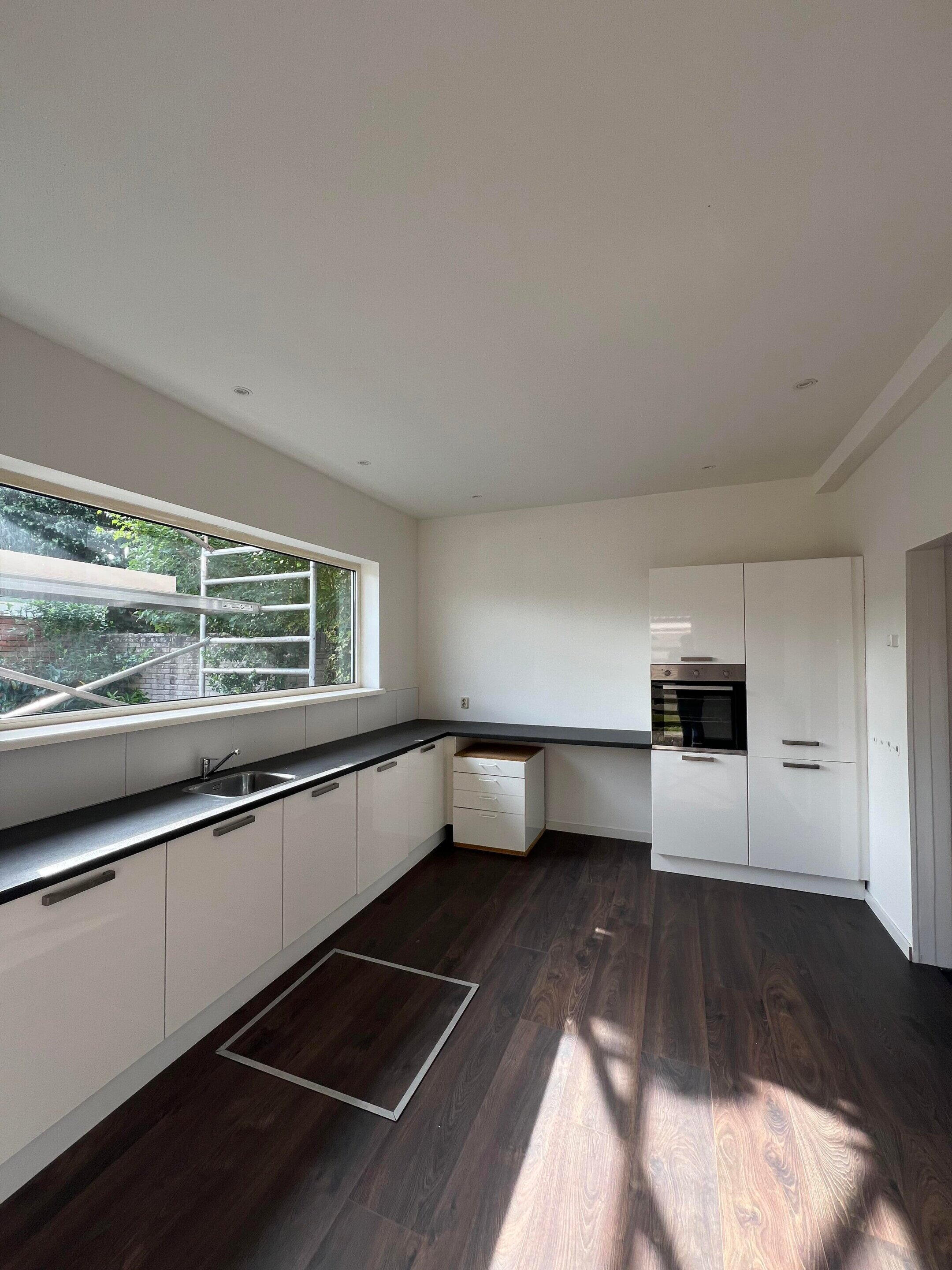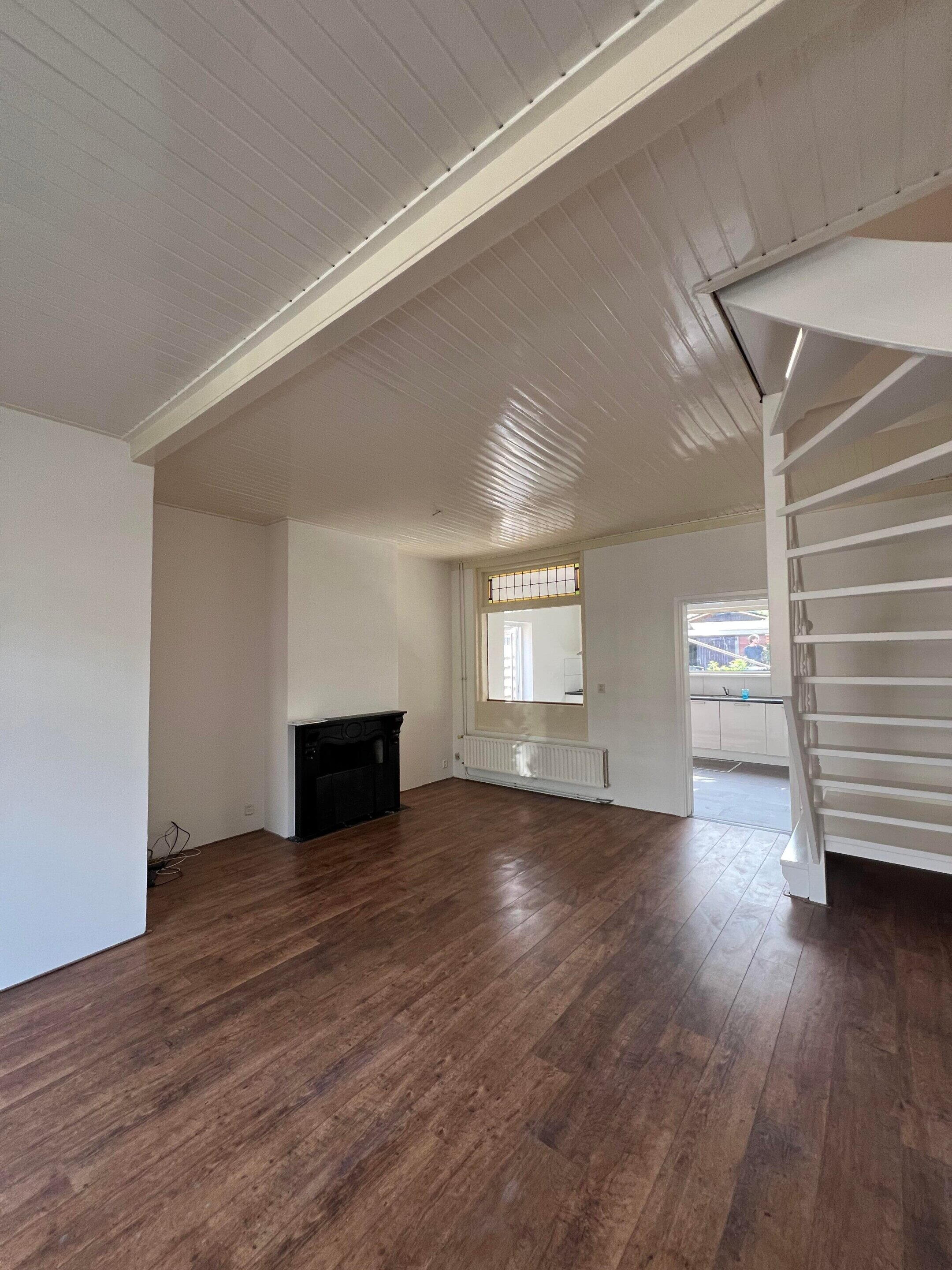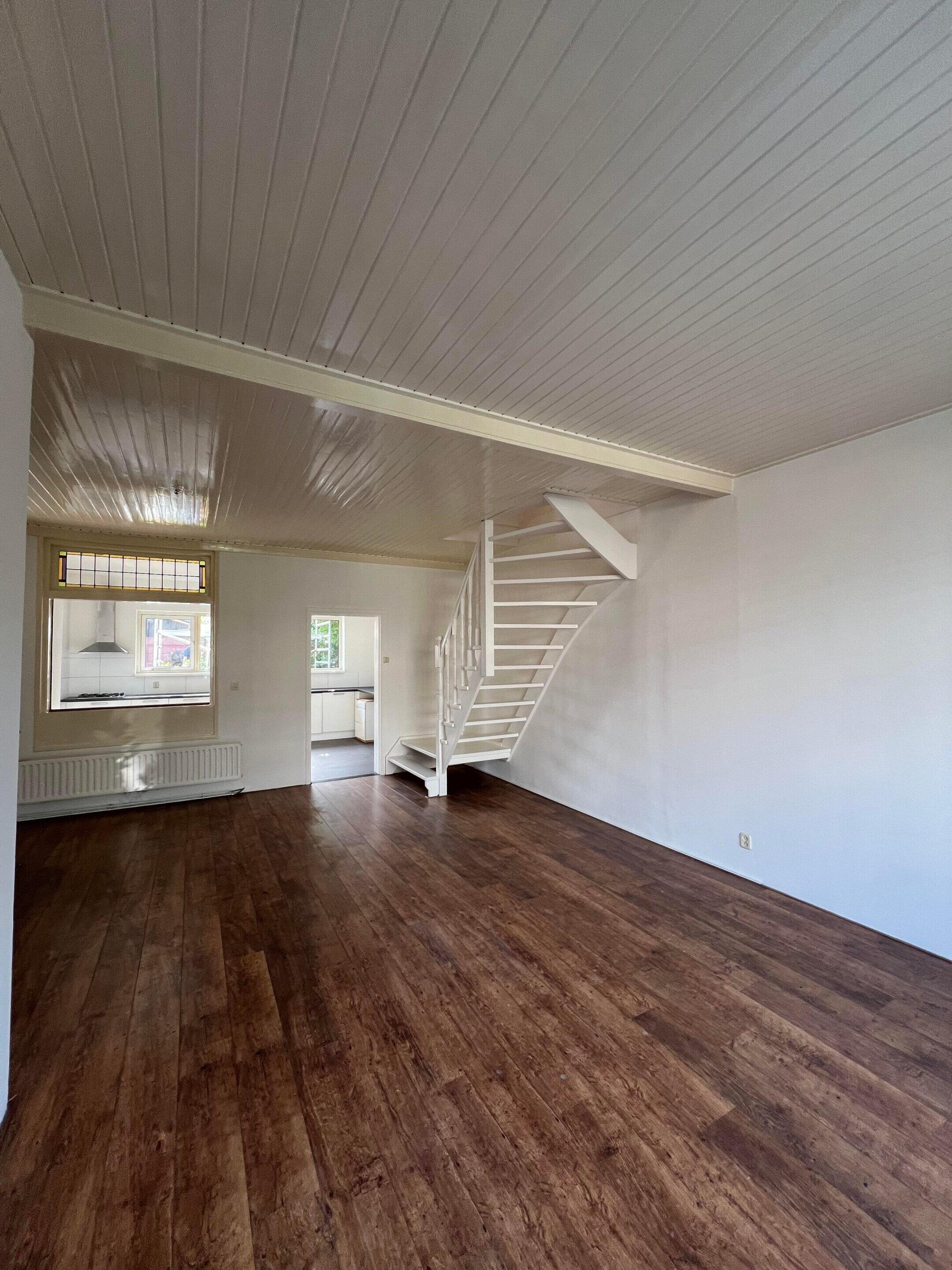 Entree, hal, toilet, woon-/eetkamer met fraaie houten vloer en open haard. Doorloop naar de achtergelegen ruime eetkeuken met toegang tot de achtertuin.